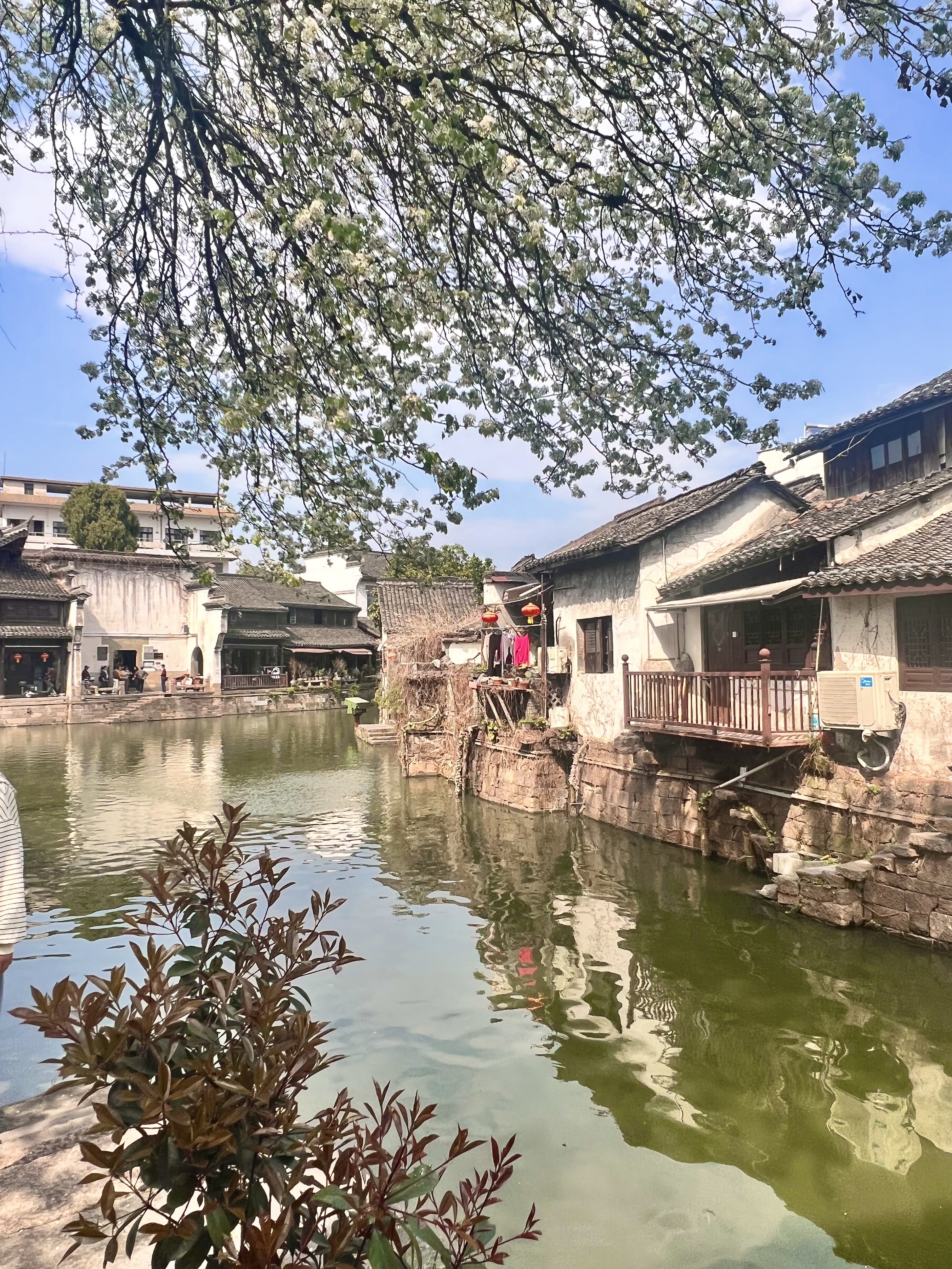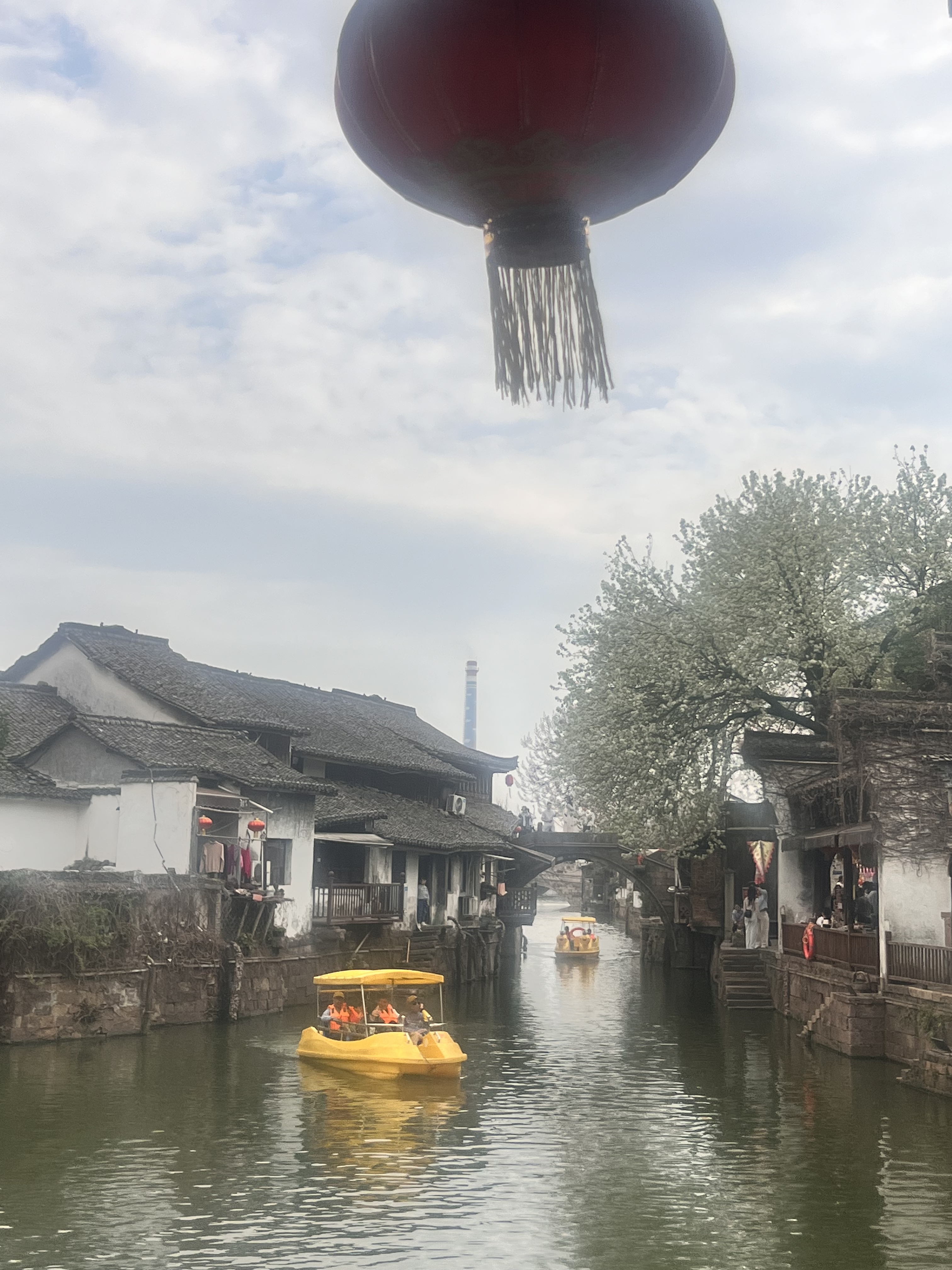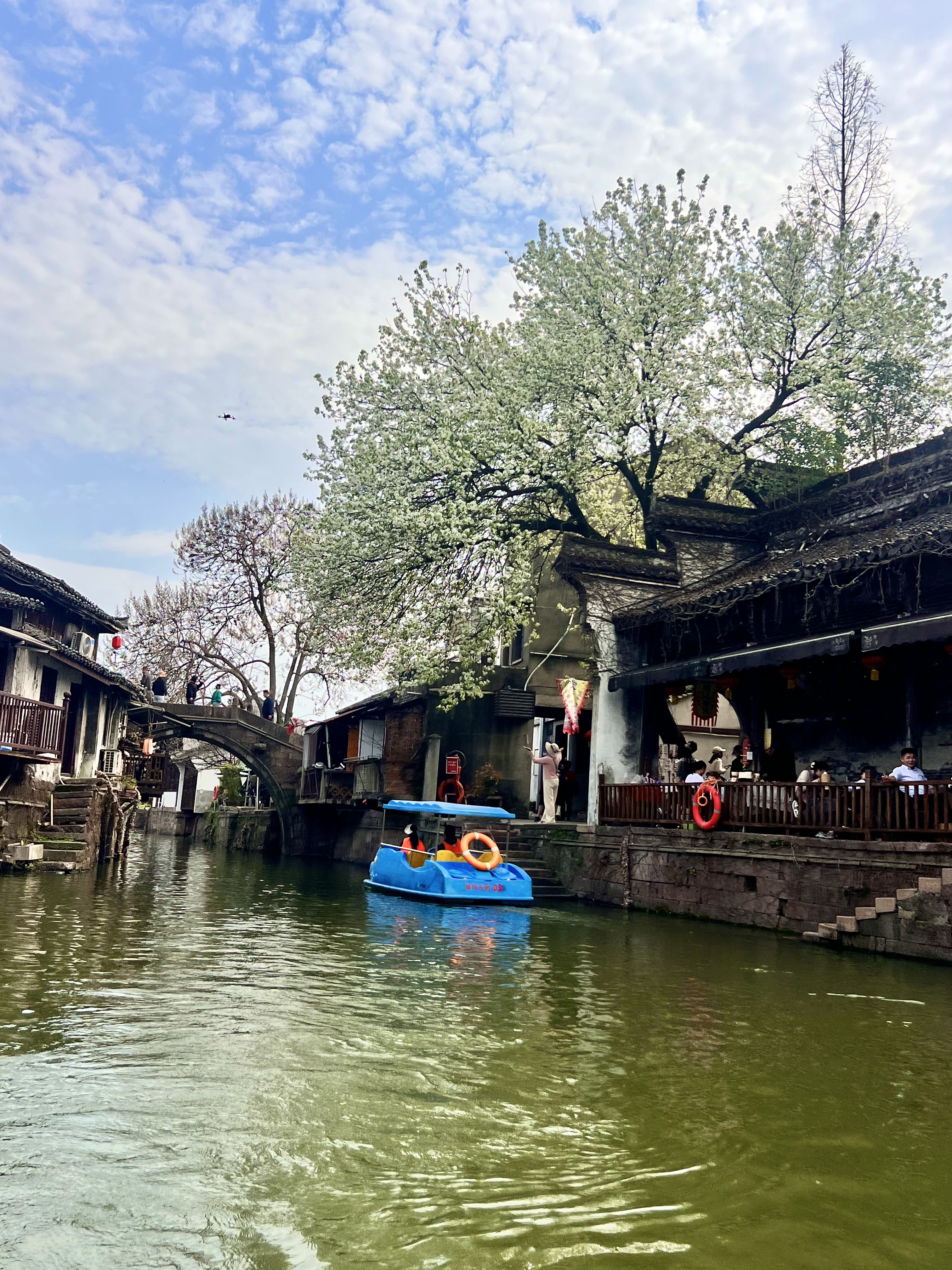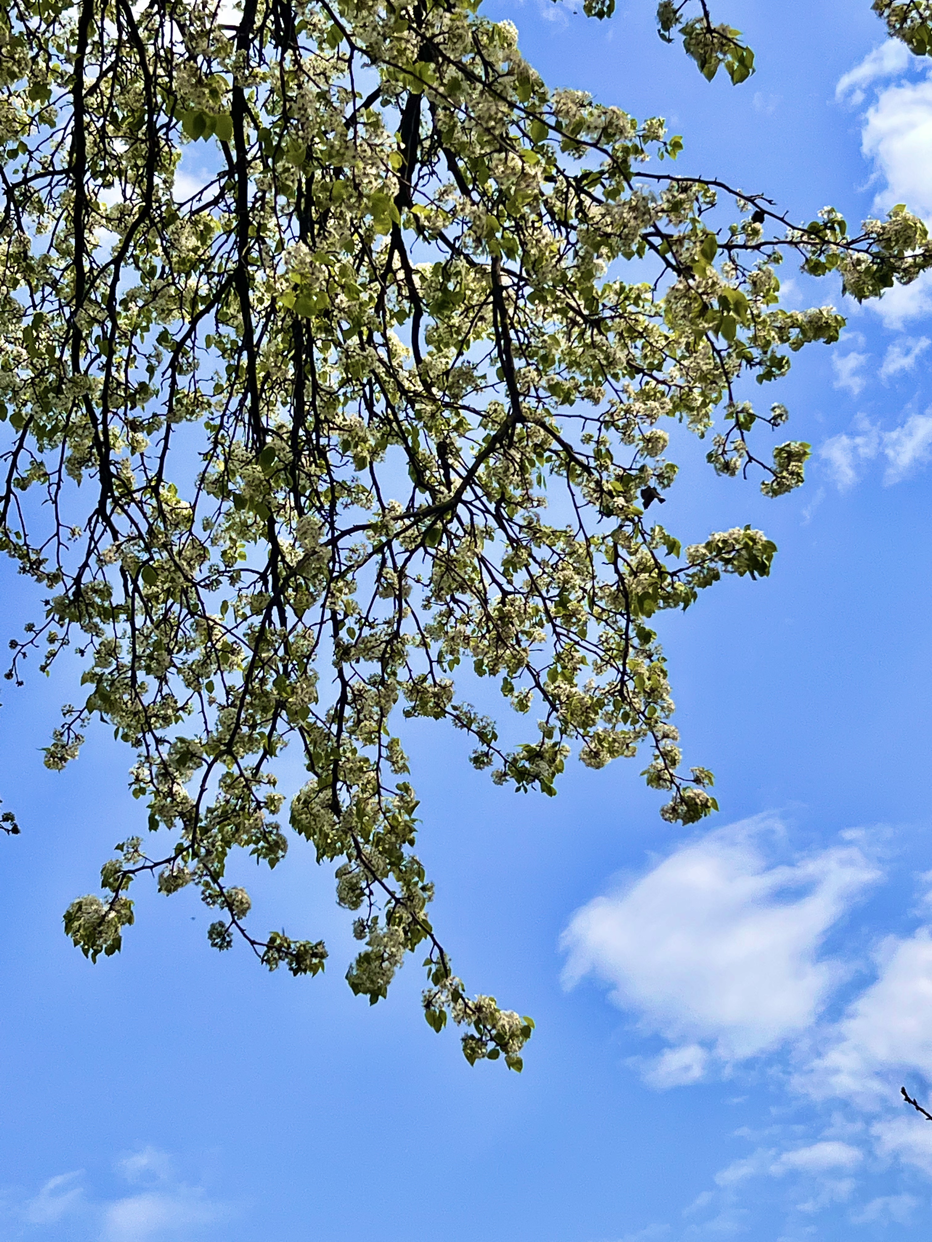 三月去新市古镇,千万别错过了陈家潭的这棵稠李树,树高大、茂密、俊美,高大约有十多米,在那古老的宅屋群落里挺拔耸起,略显向东的招摇斜势,出落得一种惊艳风情,这几天花期已至,开得极旺,远看像是一把大伞被撑开,斜放在西南岸上,路过的人无不惊叹,但大家都把它当作是梨花,只是听当地人说,这树叫稠李树,闻所未闻,春天的花太多又太像,真的很难分辨
