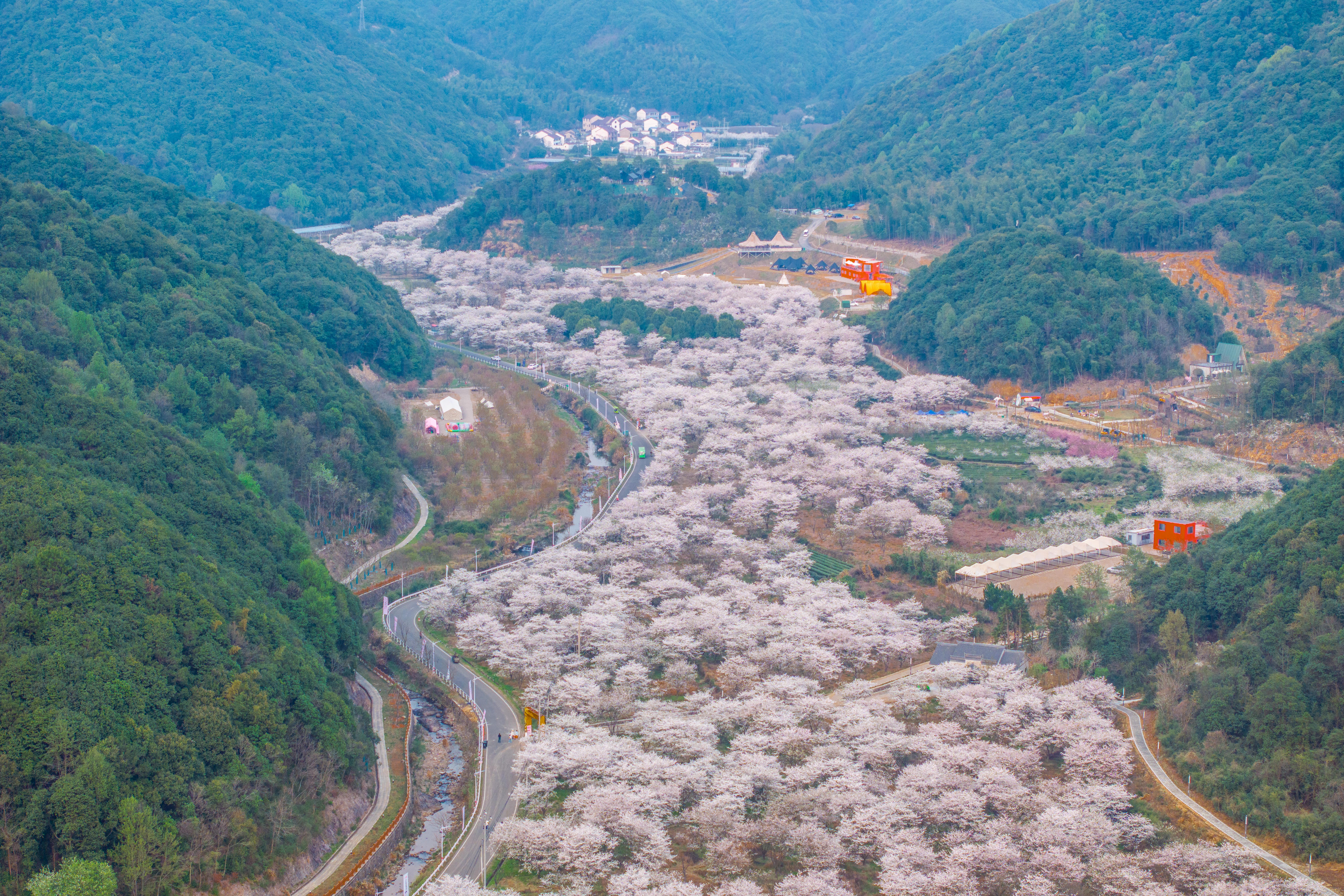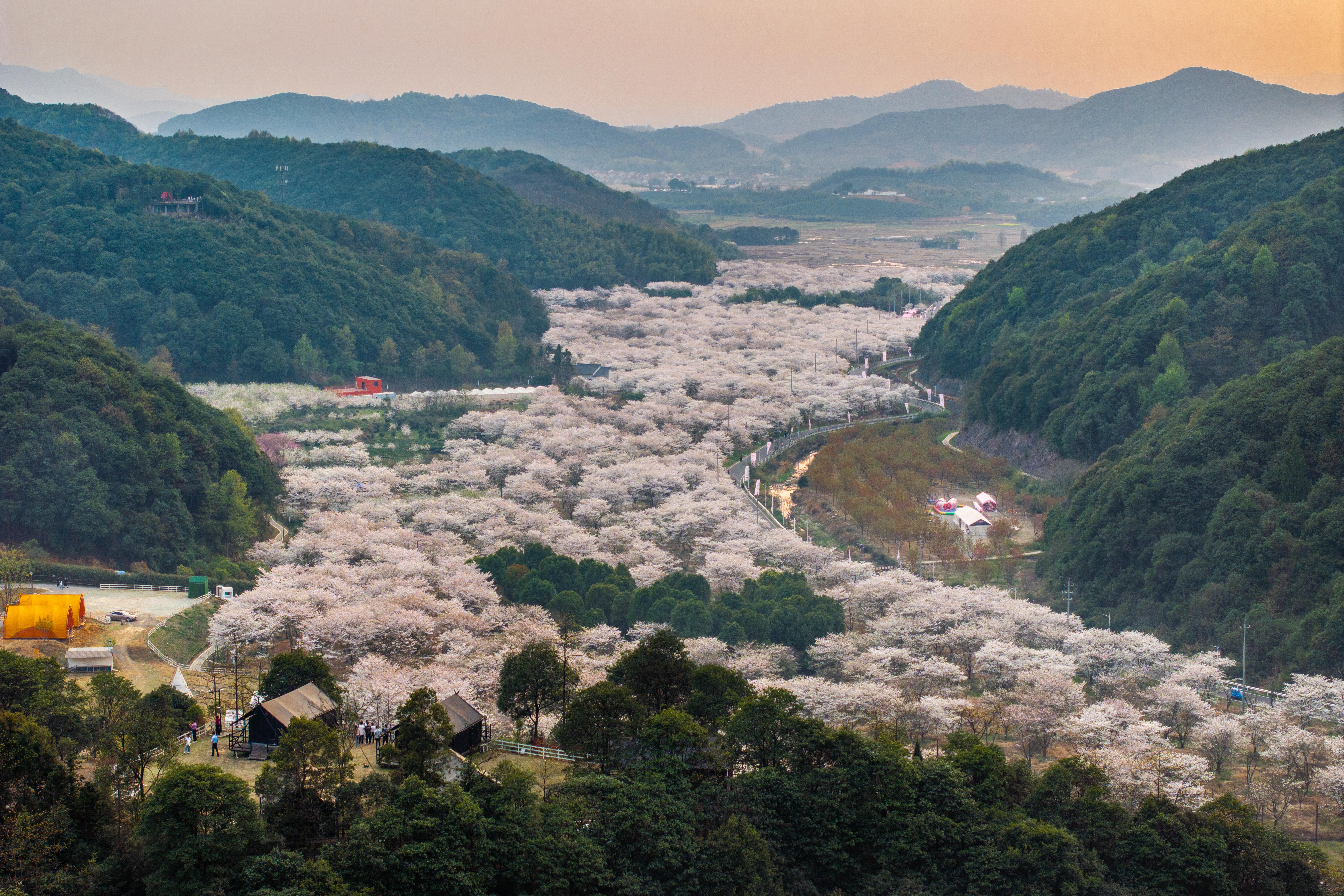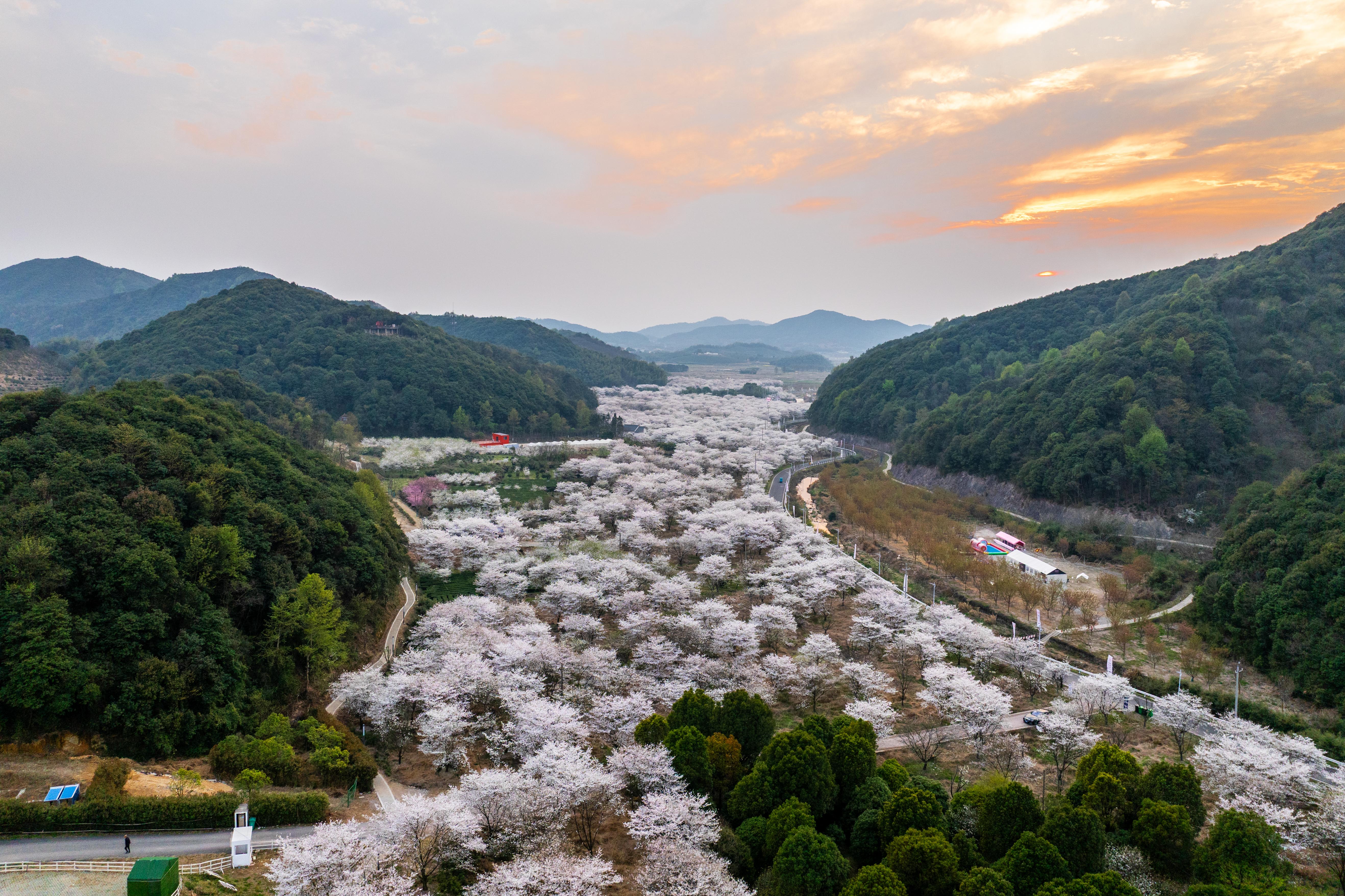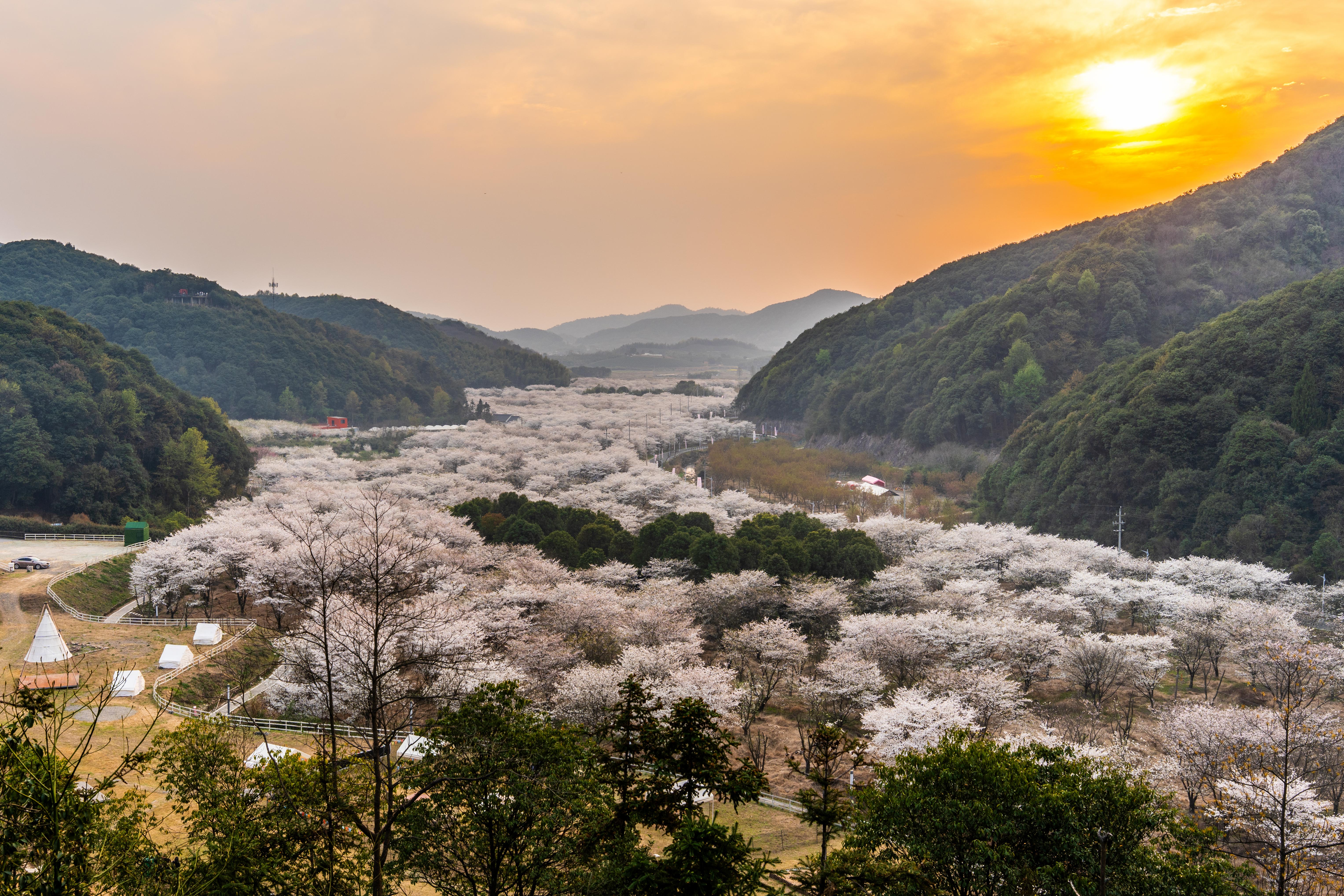 上虞章镇樱花谷的樱花林占地600余亩,绵延十里,在日落的映衬下,宛若金黄大道