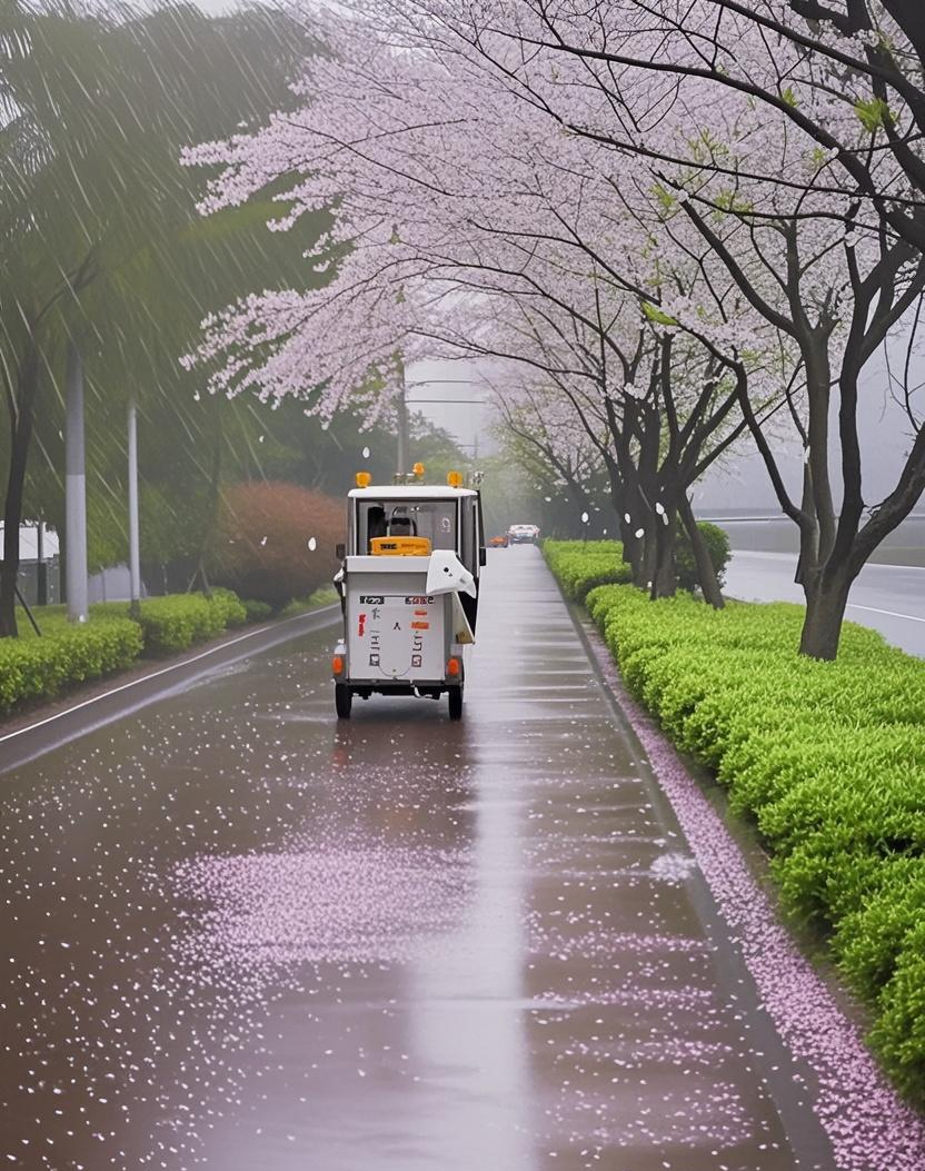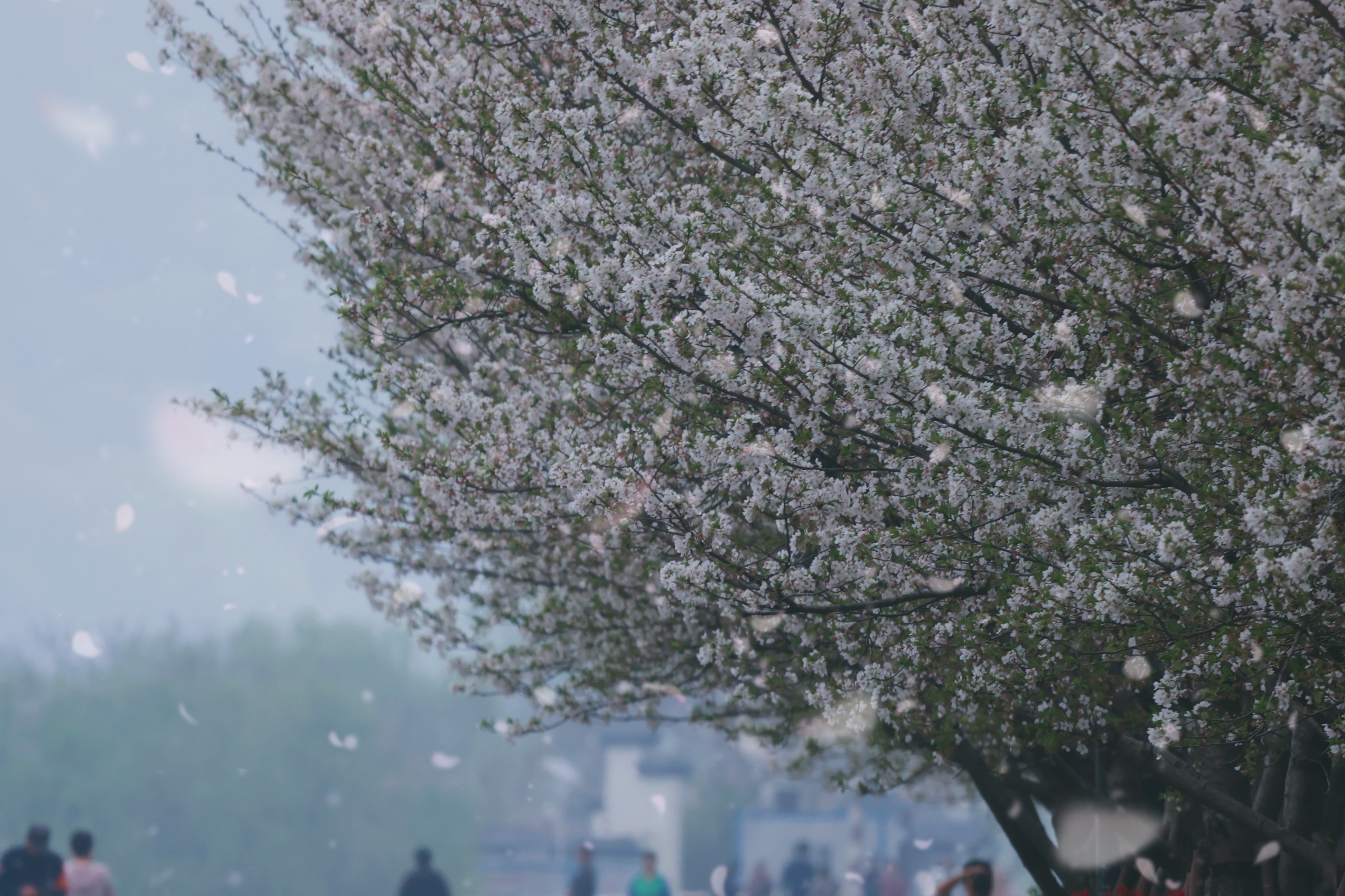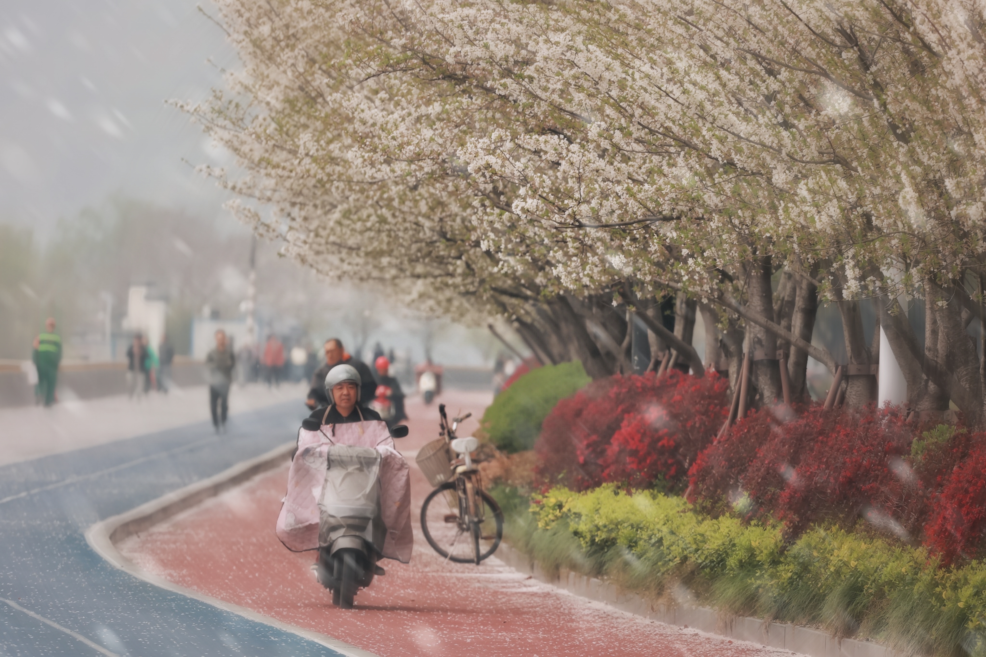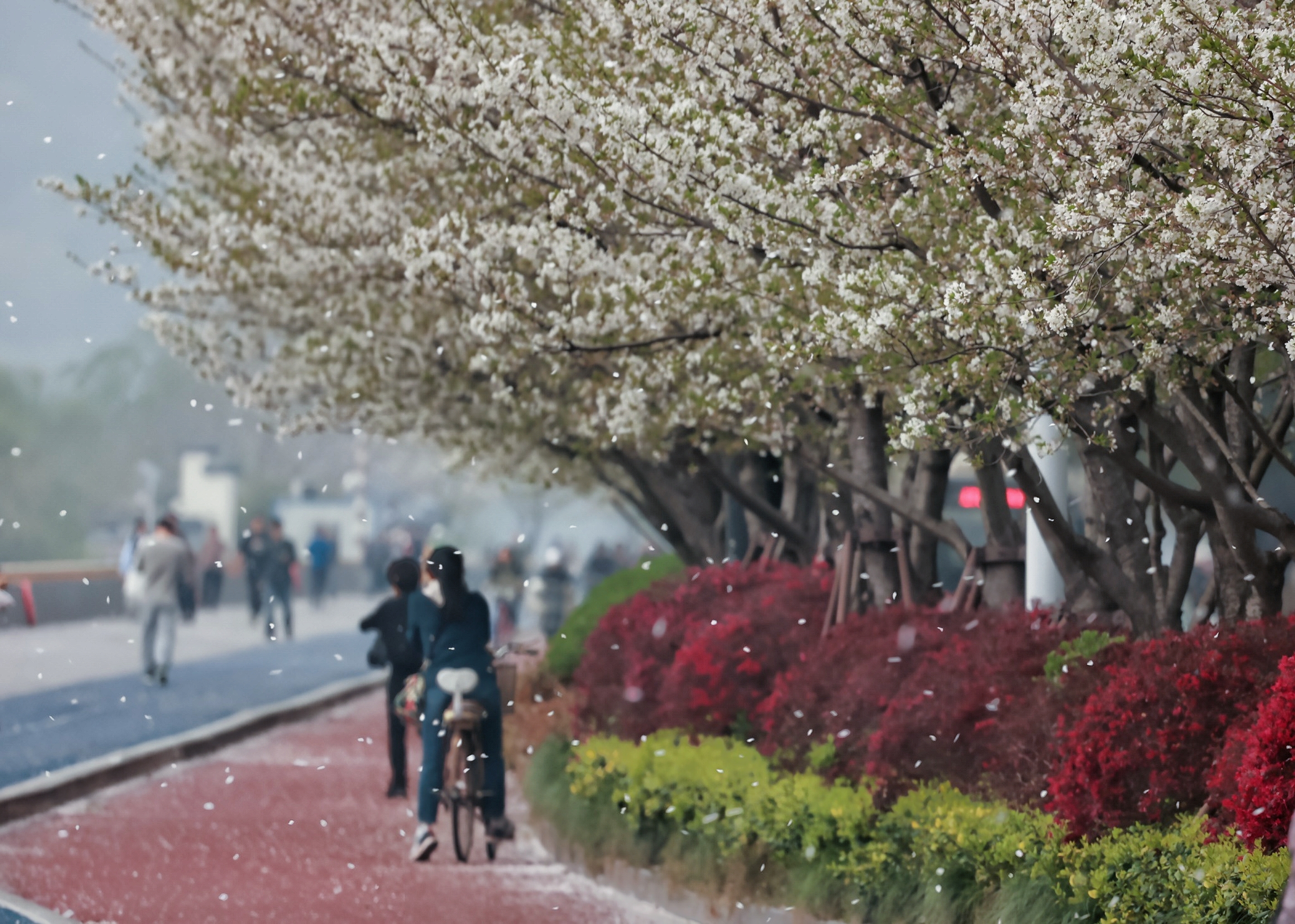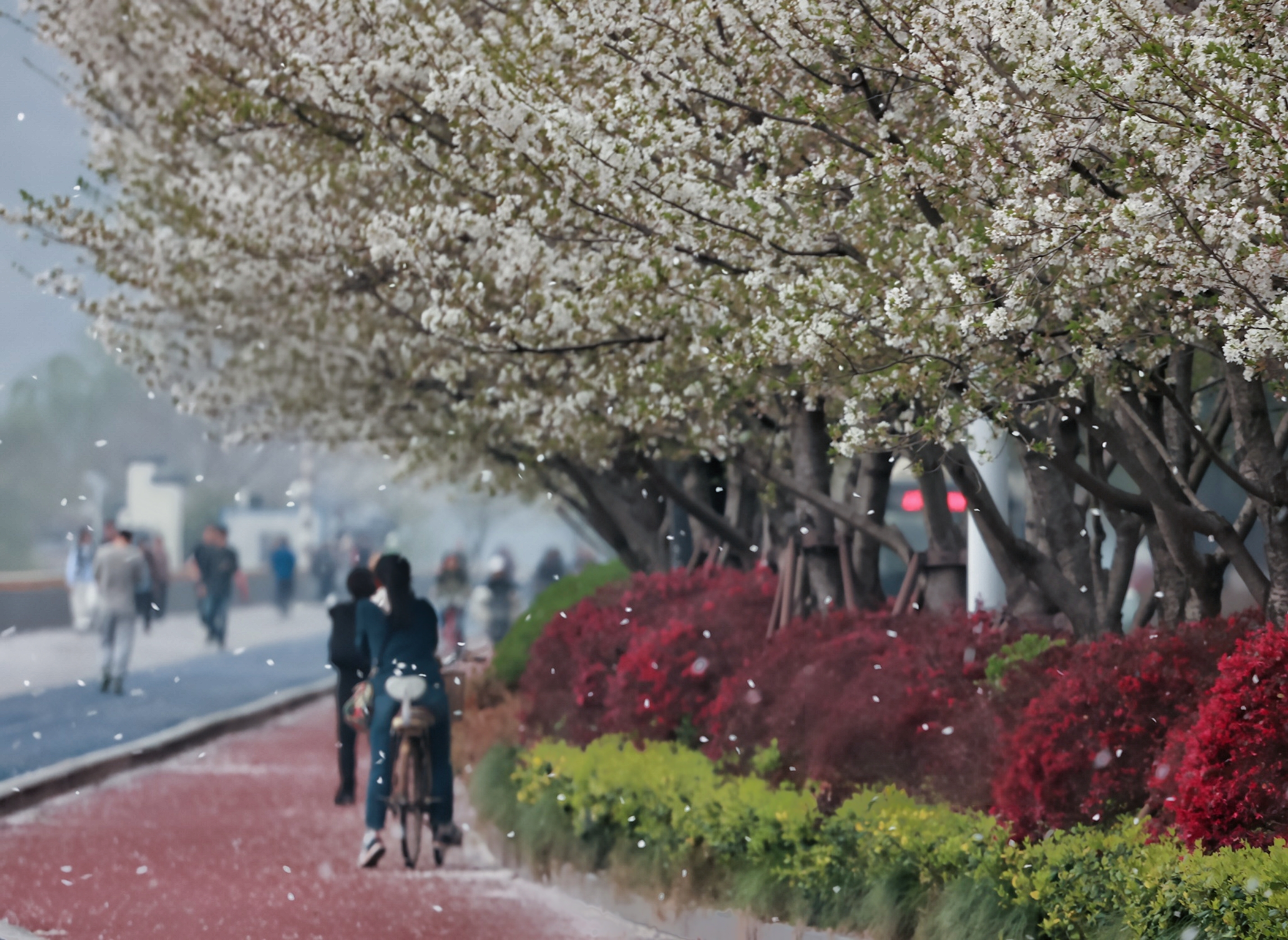江边樱花大道那飘落的樱花,宛如洁白的雪花,在空中肆意飞舞。它们有的旋转着,像是在跳着一支优美的舞蹈;有的直直地落下,仿佛是迫不及待地想要投入大地的怀抱。每一片花瓣都带着一种决绝的美,即使离开了枝头,也依然绽放着最后的绚烂。