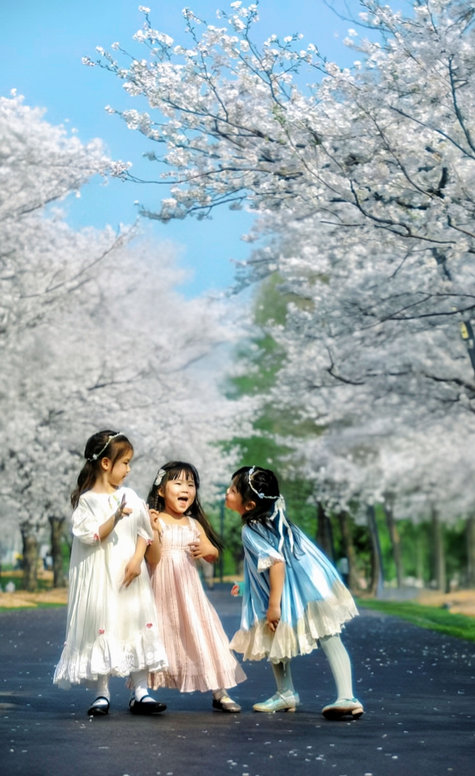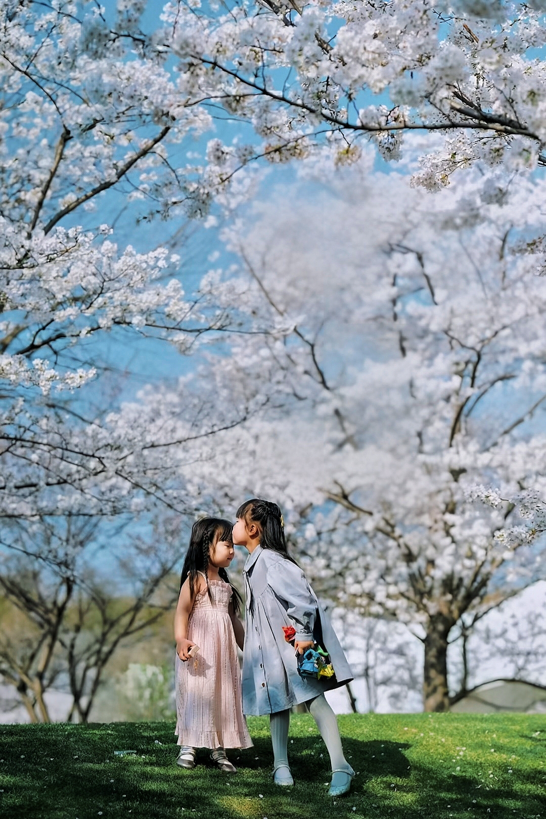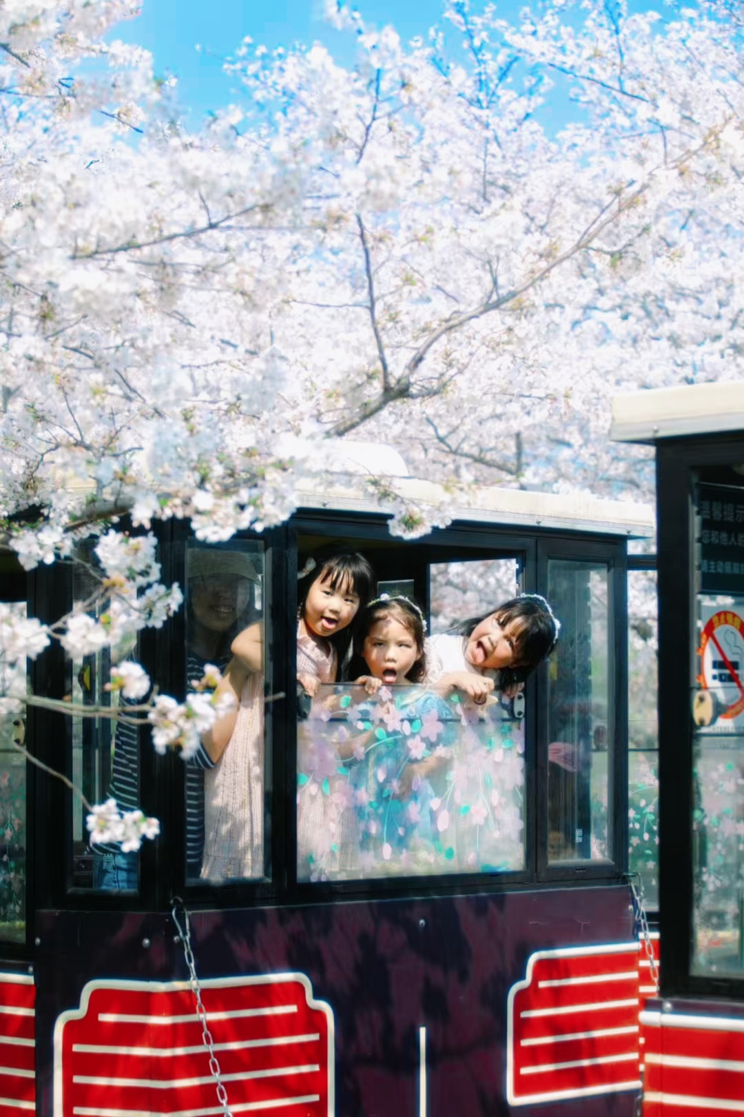 和樱花的最后时光。小朋友们在樱花树下嬉戏玩耍。樱花树下坐着小火车,拍了照片一定超美噢!记录下了她们开心又难忘的时刻呀。