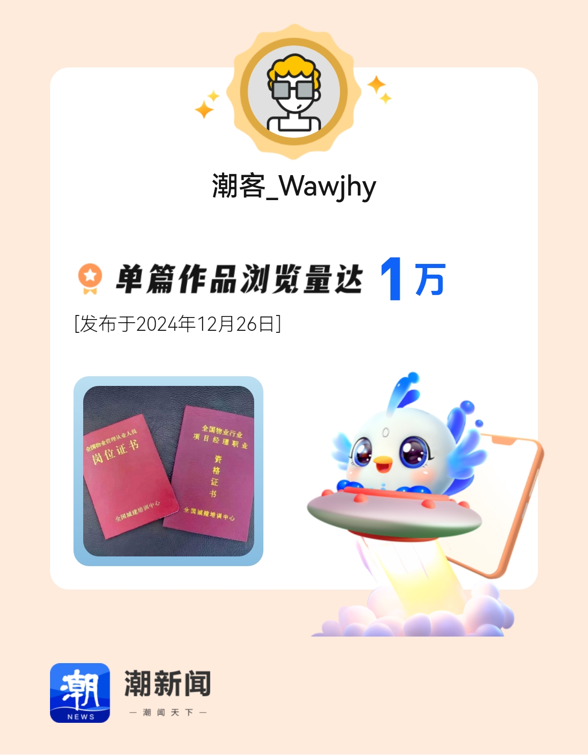 我在潮新闻发表的单篇作品浏览量达到1万!