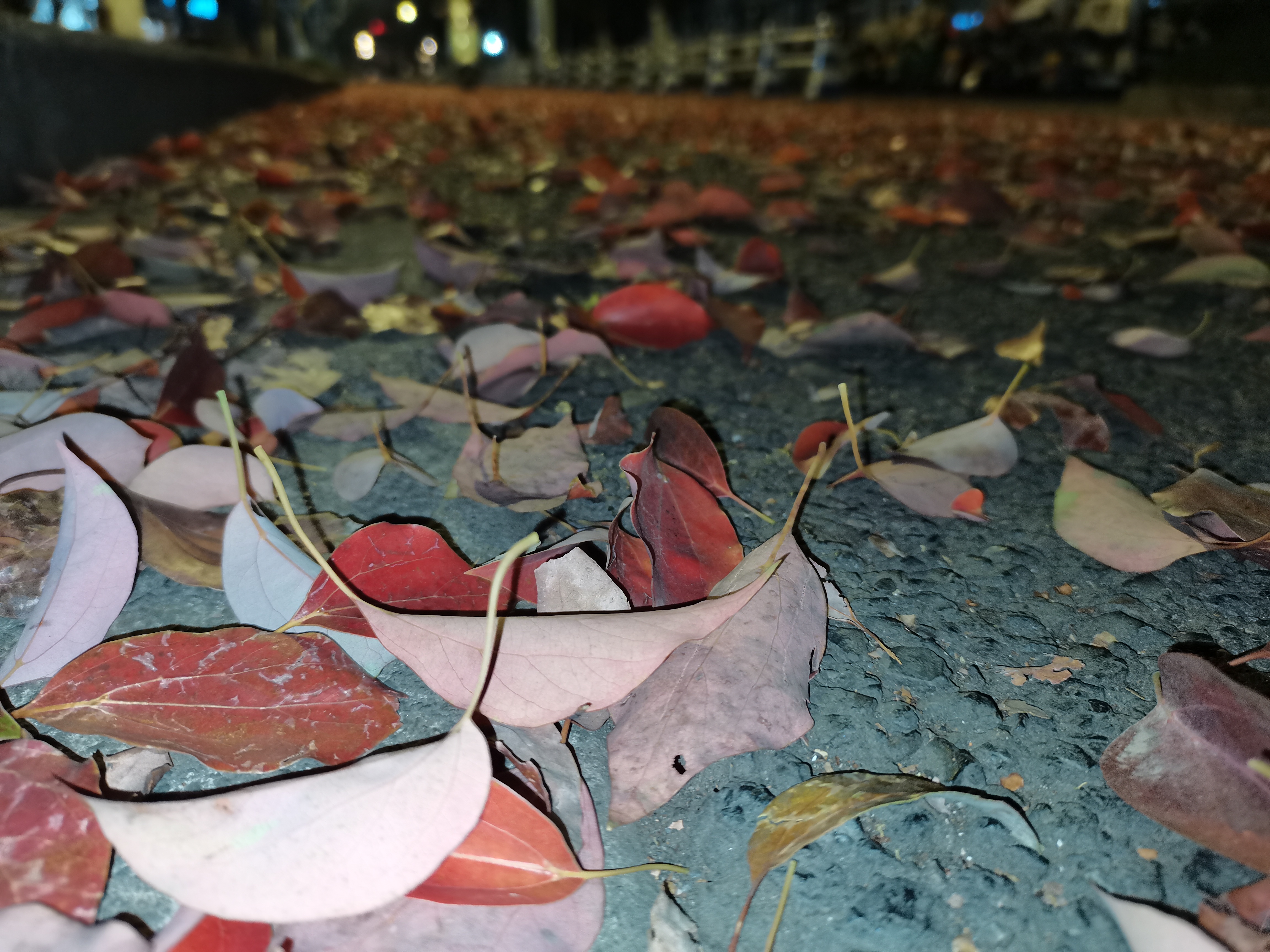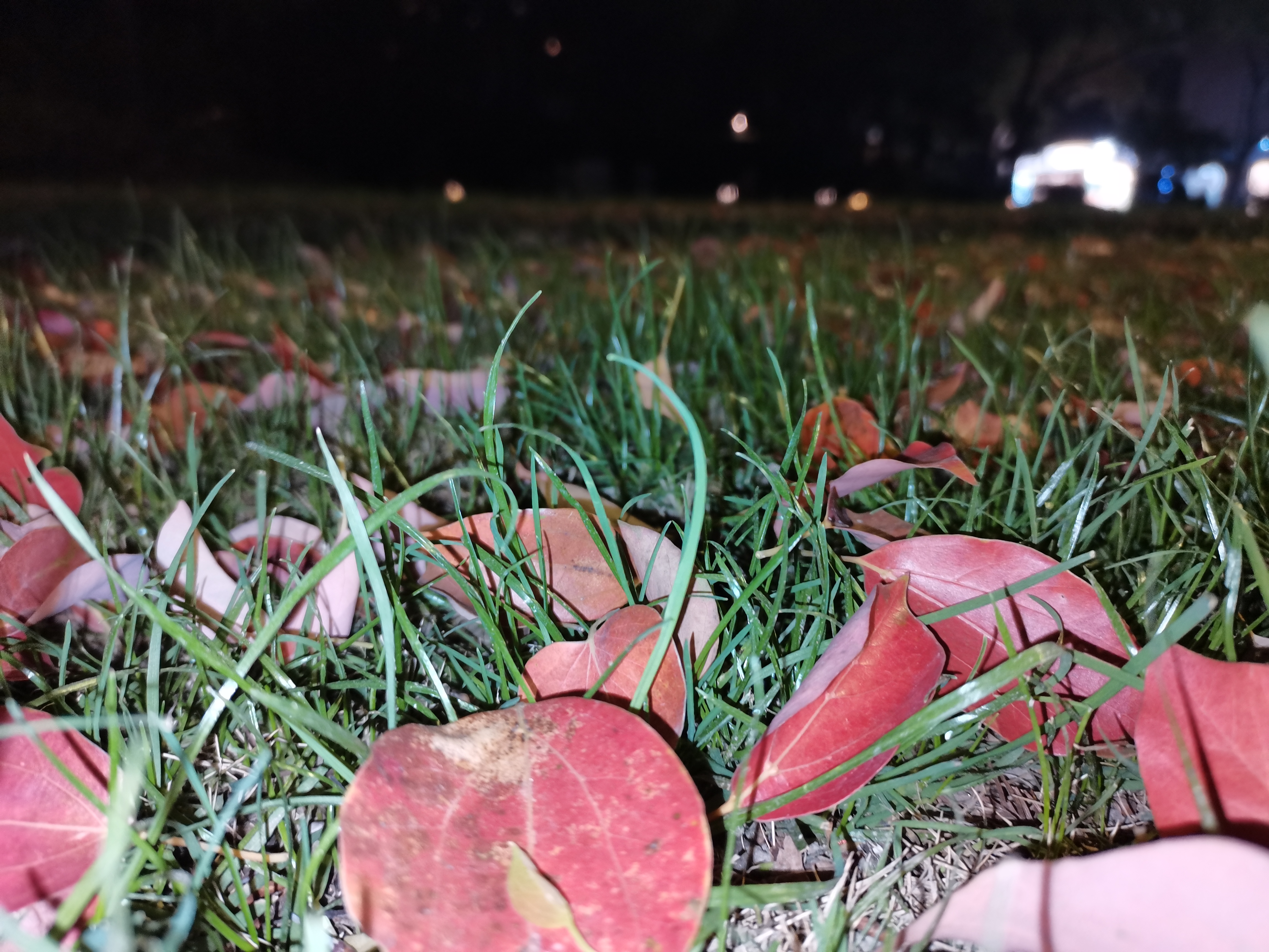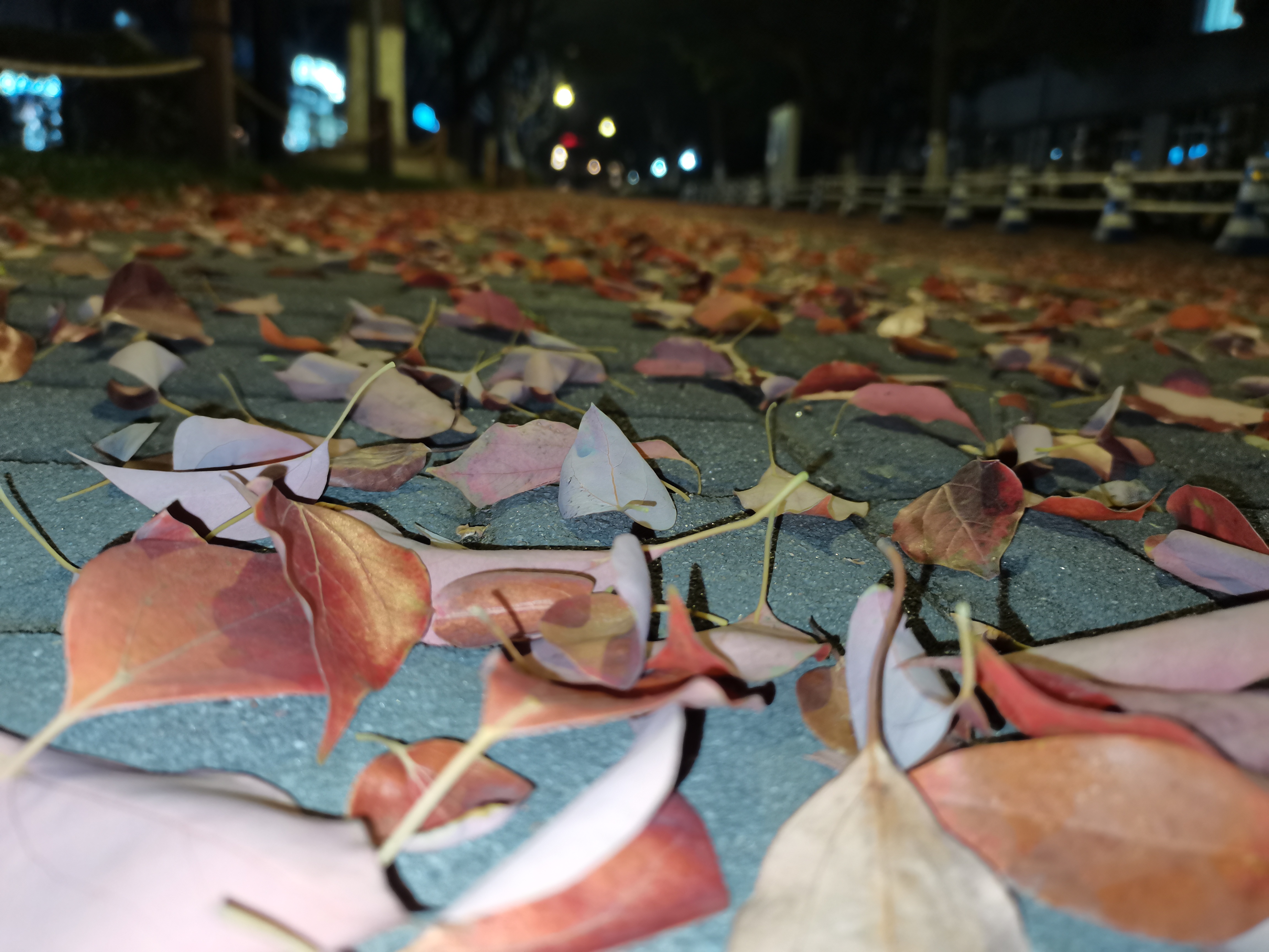春夜,落叶轻吻草地,街道灯光温柔。红叶绿草,色彩斑斓中藏着静谧。自然与城市,在这一刻完美交融,夜景如画。