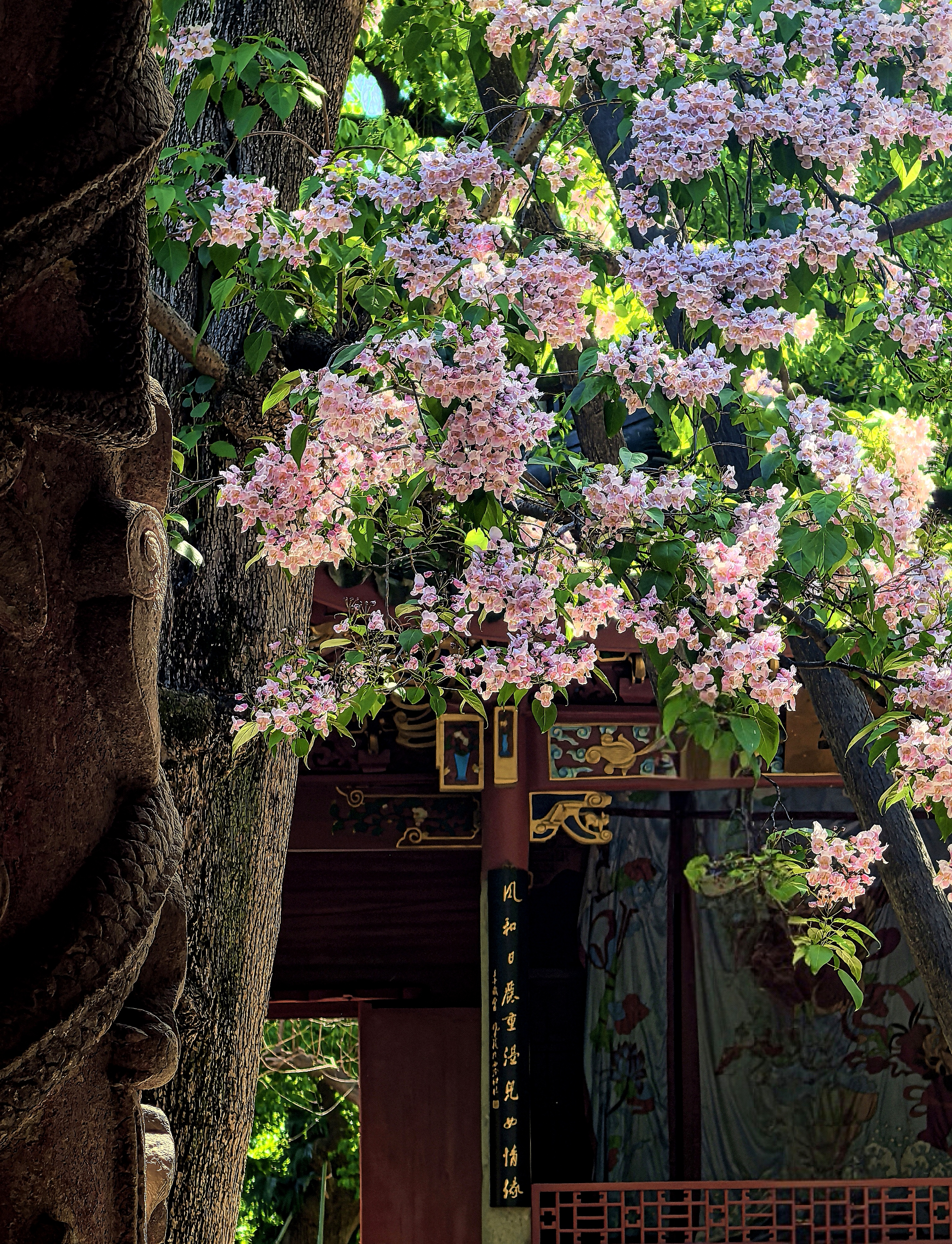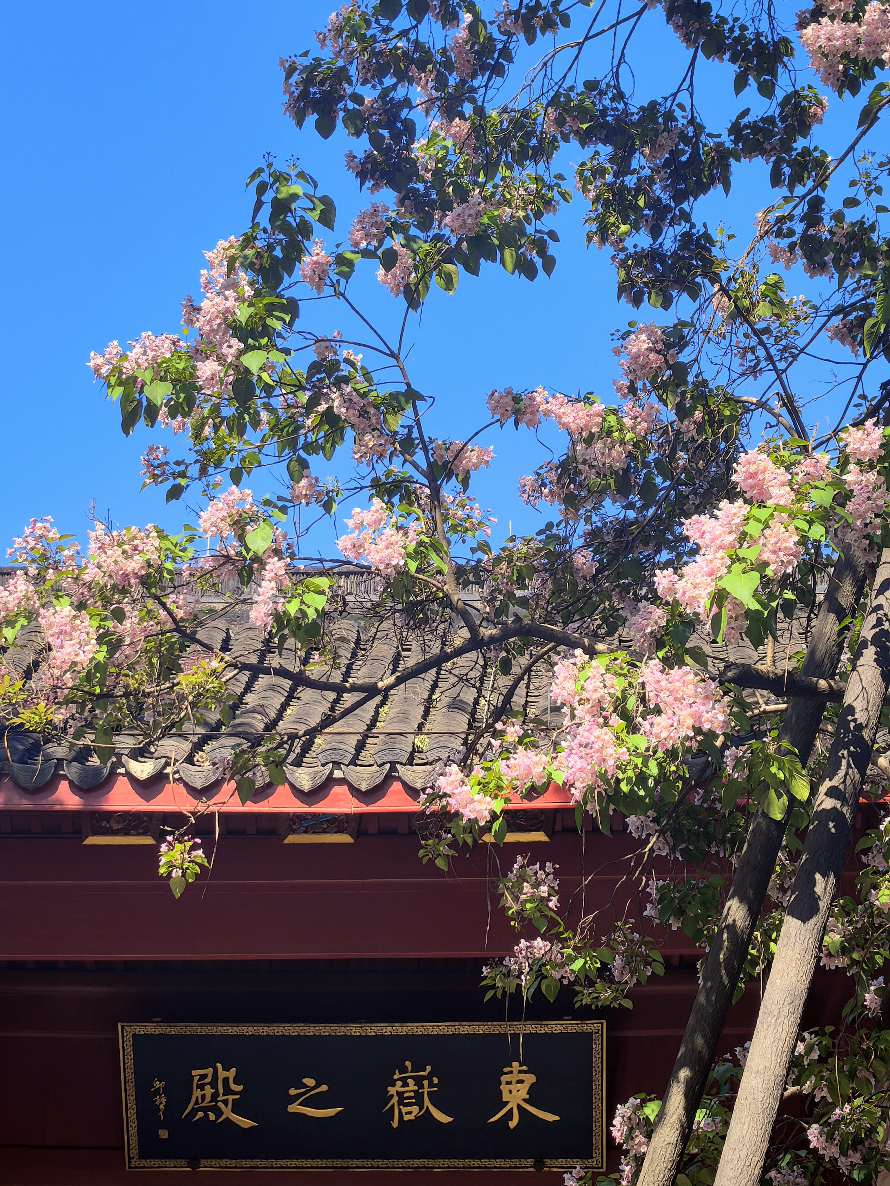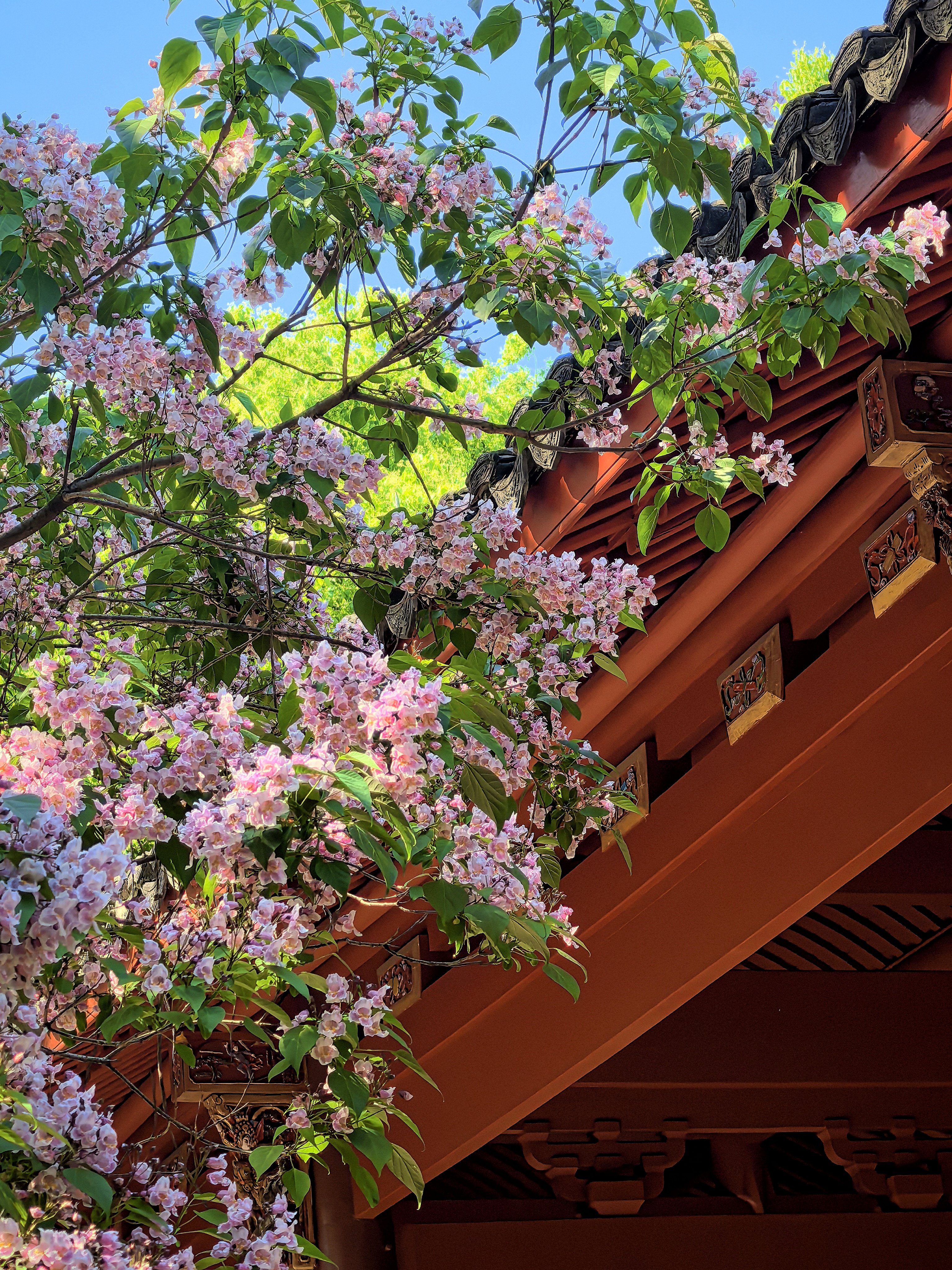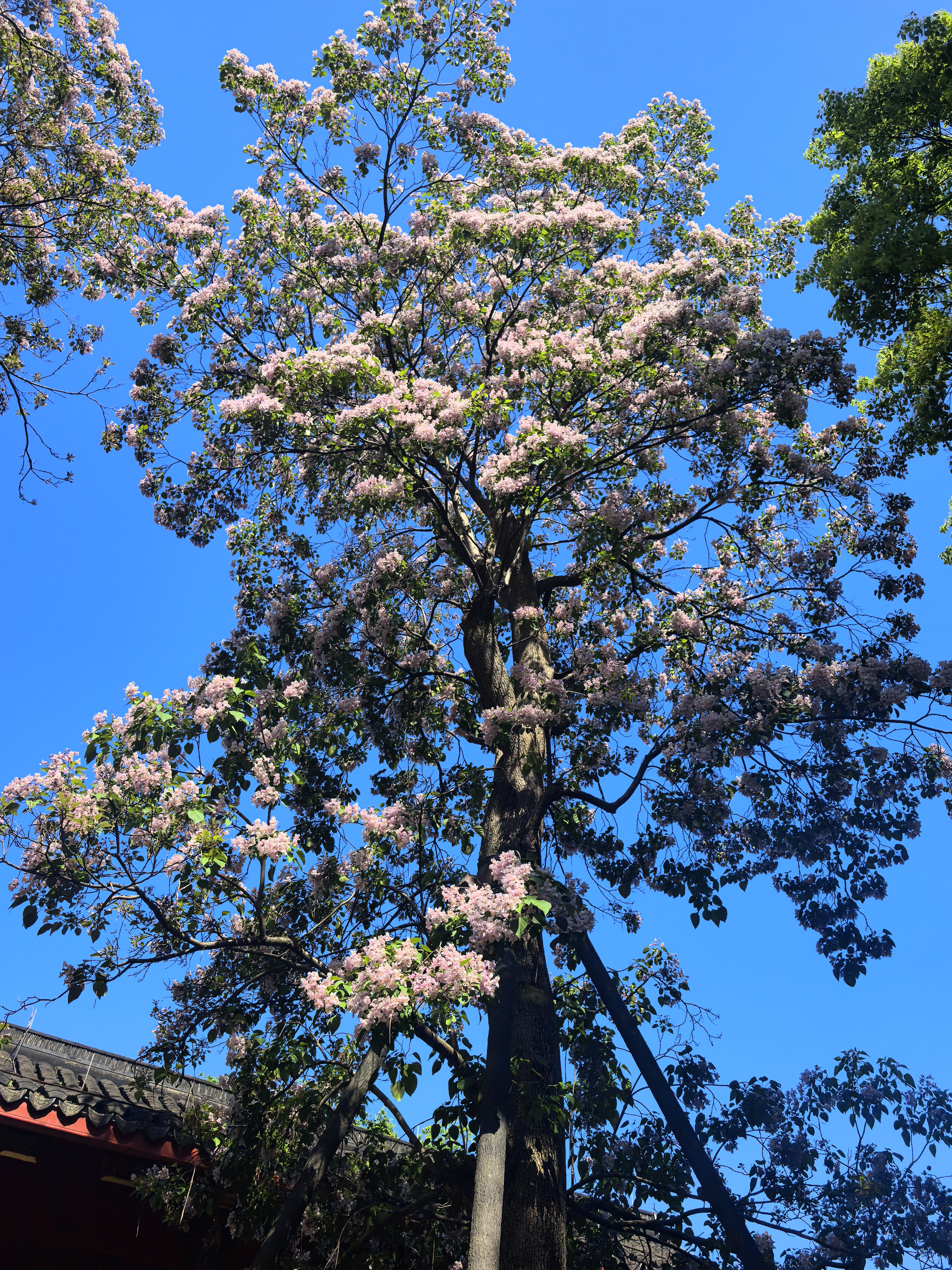 杭城人的内心总怀着深深的古树情节,春天的诗情画意,藏有一处岁月沉香的芳华,悠悠几百年星换斗移依然历久弥新。 早春轻风拂面的时候,争着去三竺道上观看法喜寺那株500多岁古玉兰花,那满树圣洁高雅的盛世容颜。这几天又迎来了吴山东岳庙537岁古楸树花惊艳亮相。粉紫色的花朵簇拥在一起,如云似霞,将古老的庙宇装点得如梦如幻。每一朵花都像是在诉说着过去的故事,见证着杭城的变迁。 古时楸树常被用作行道树,或者植于宫观中用以遮荫和观赏,因此它在文人墨客心中有太多的诗情。 三国时曹植诗云:“斗鸡东郊道,走马长楸间。”唐朝的杜甫有“未将梅蕊惊愁眼,要取楸花媚远天”的诗句。韩愈也曾经写过《楸树二首》的诗,“谁人与脱青罗帔,看吐高花万万层”。 北宋的苏轼既有“至今霜蹄踏长楸,圉人困卧沙垅头”的豪放之情,又有“楸树高花欲插天,惆怅春光又一年”的婉约之意。 楸花差不多与同色系的楝树花同时绽放,这个时候已经到了晚春了。仰望楸树一树的繁花,一方面是感叹草木的神奇和生命的顽强,另一方面也非常珍惜春光的美好,在古树飞花中感受着这座城市深厚的文化底蕴。