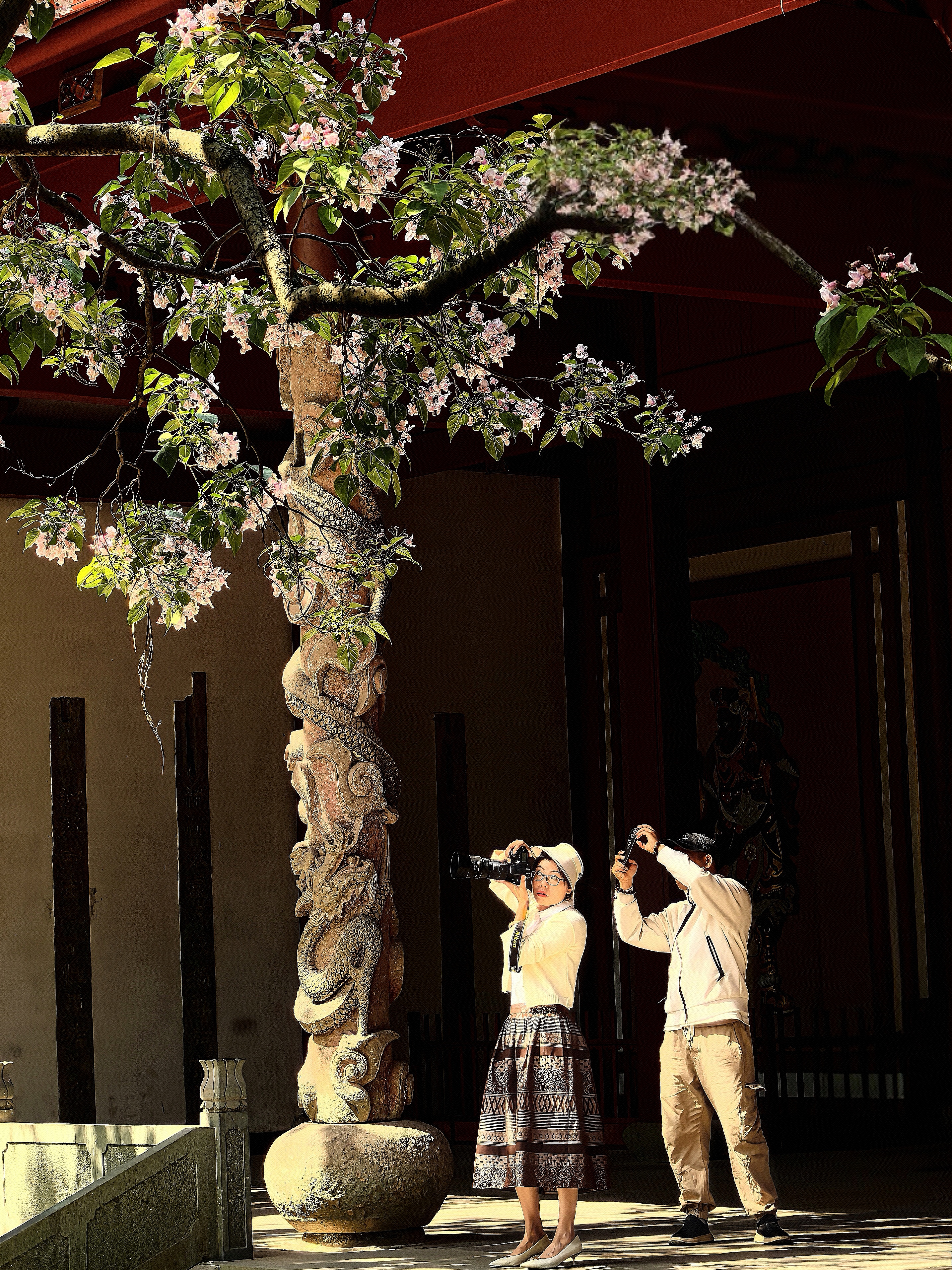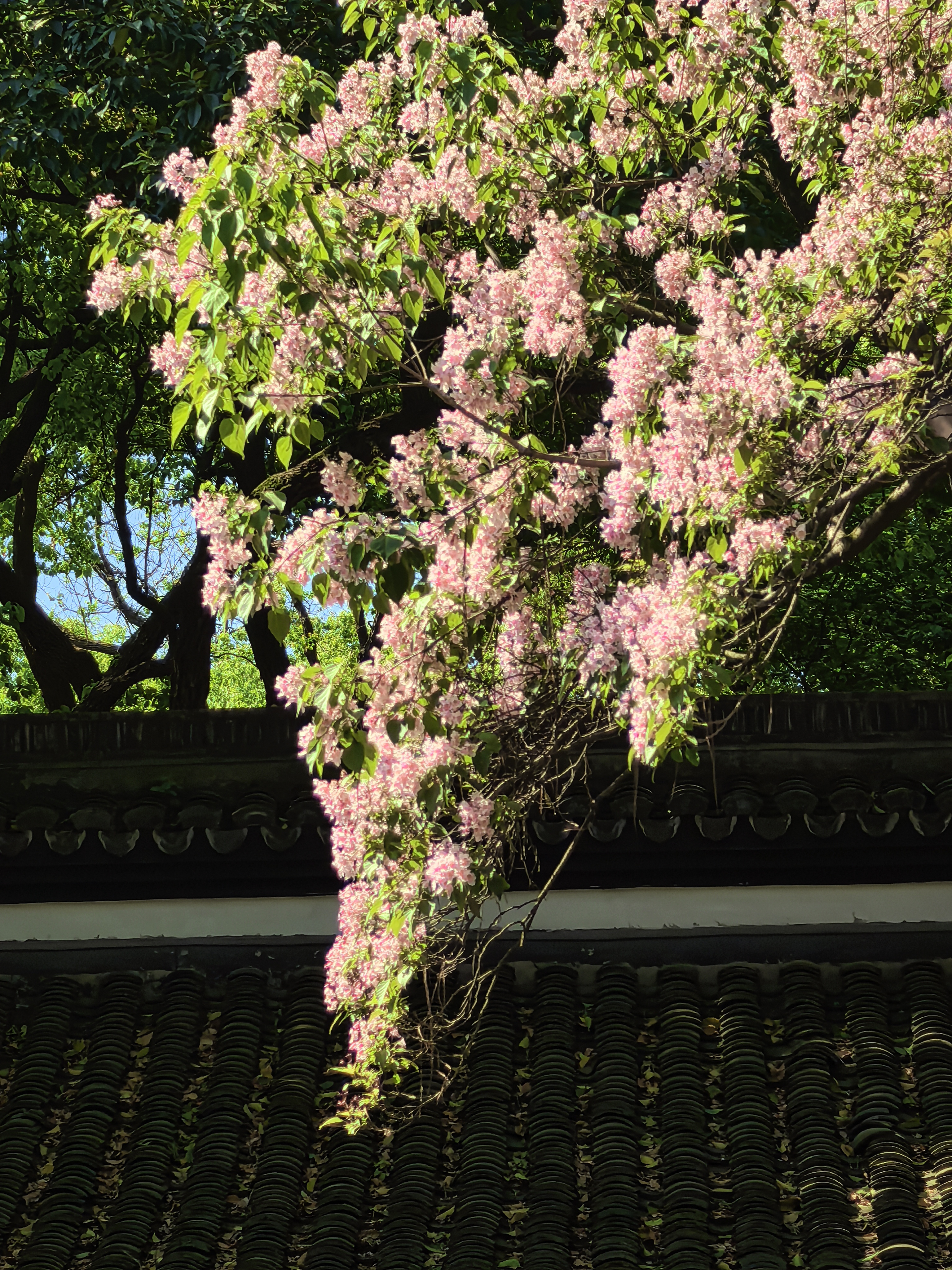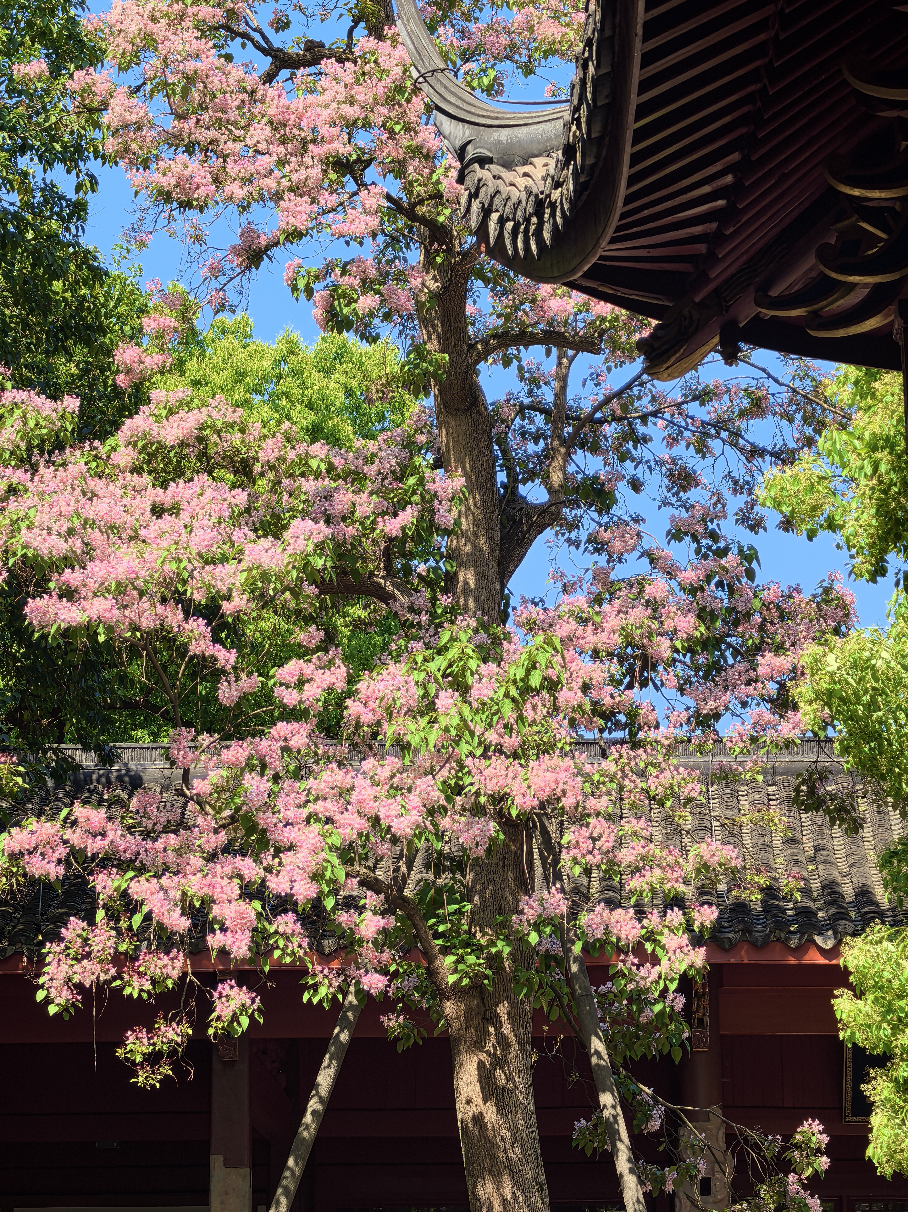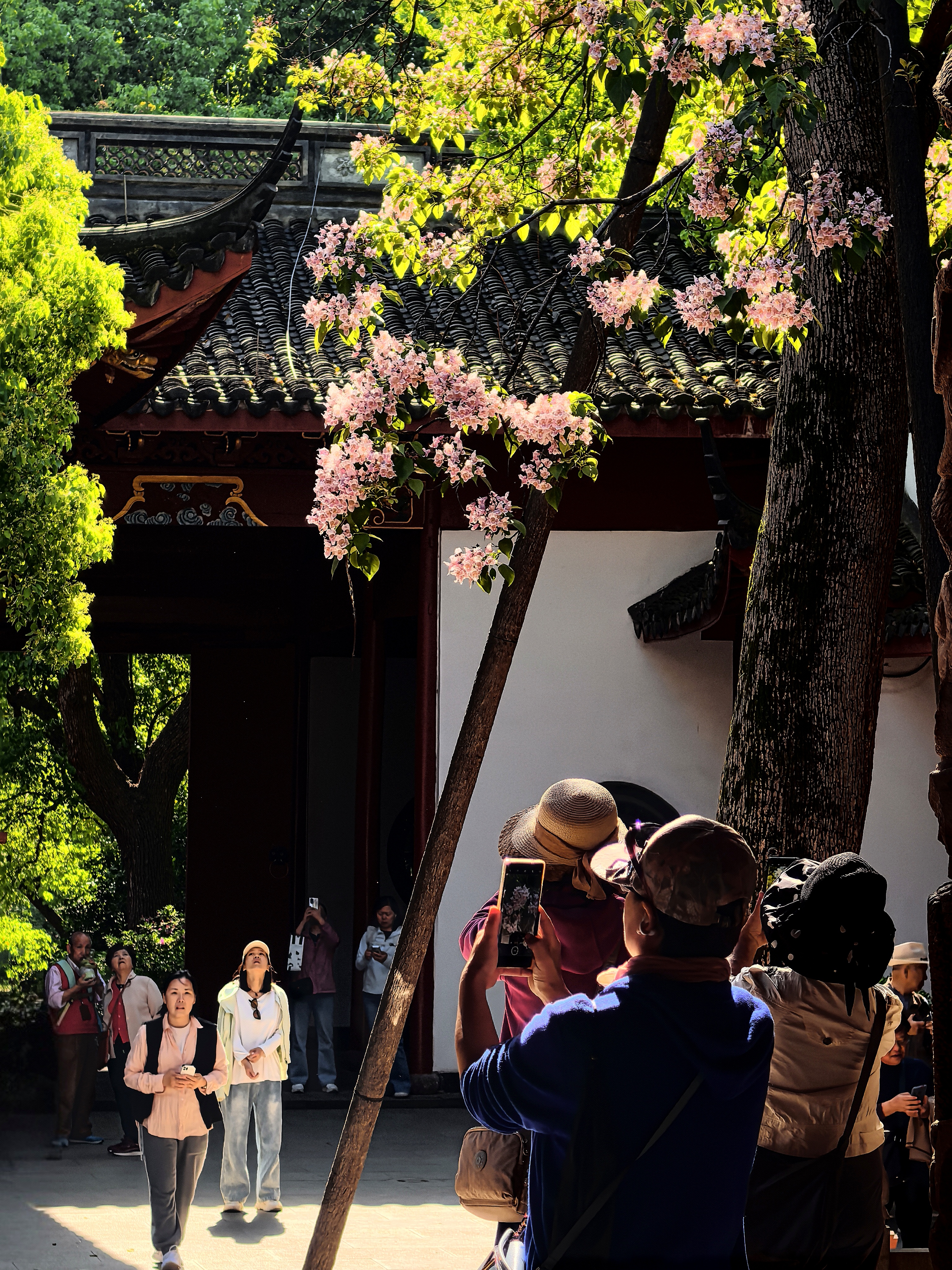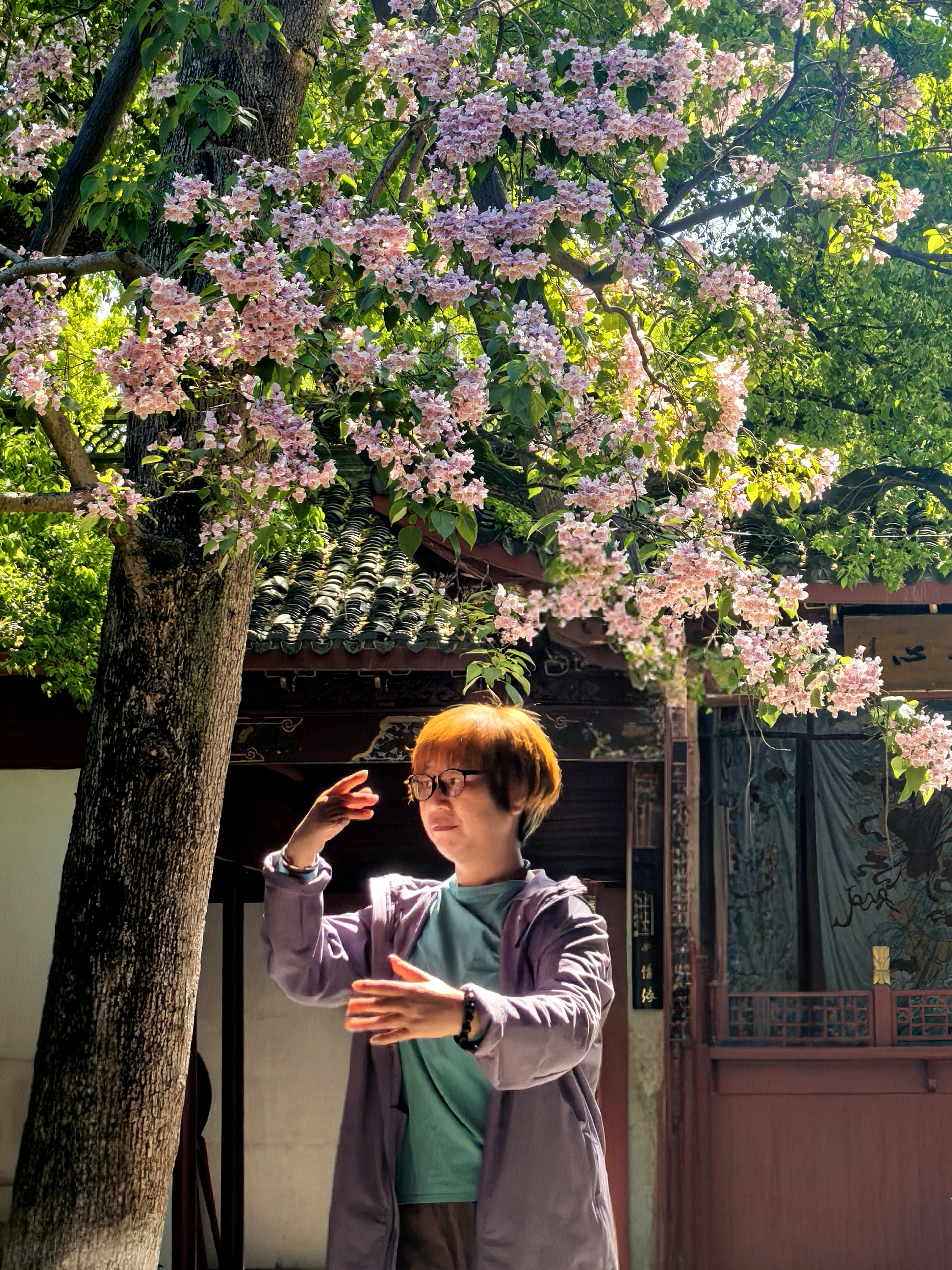 杭城人的内心总怀着深深的古树情节,春天的诗情画意,藏有一处岁月沉香的芳华,悠悠几百年星换斗移依然历久弥新。 早春轻风拂面的时候,争着去三竺道上观看法喜寺那株500多岁古玉兰花,那满树圣洁高雅的盛世容颜。这几天又迎来了吴山东岳庙537岁古楸树花惊艳亮相。粉紫色的花朵簇拥在一起,如云似霞,将古老的庙宇装点得如梦如幻。每一朵花都像是在诉说着过去的故事,见证着杭城的变迁。 古时楸树常被用作行道树,或者植于宫观中用以遮荫和观赏,因此它在文人墨客心中有太多的诗情。 三国时曹植诗云:“斗鸡东郊道,走马长楸间。”唐朝的杜甫有“未将梅蕊惊愁眼,要取楸花媚远天”的诗句。韩愈也曾经写过《楸树二首》的诗,“谁人与脱青罗帔,看吐高花万万层”。 北宋的苏轼既有“至今霜蹄踏长楸,圉人困卧沙垅头”的豪放之情,又有“楸树高花欲插天,惆怅春光又一年”的婉约之意。 楸花差不多与同色系的楝树花同时绽放,这个时候已经到了晚春了。仰望楸树一树的繁花,一方面是感叹草木的神奇和生命的顽强,另一方面也非常珍惜春光的美好,在古树飞花中感受着这座城市深厚的文化底蕴。