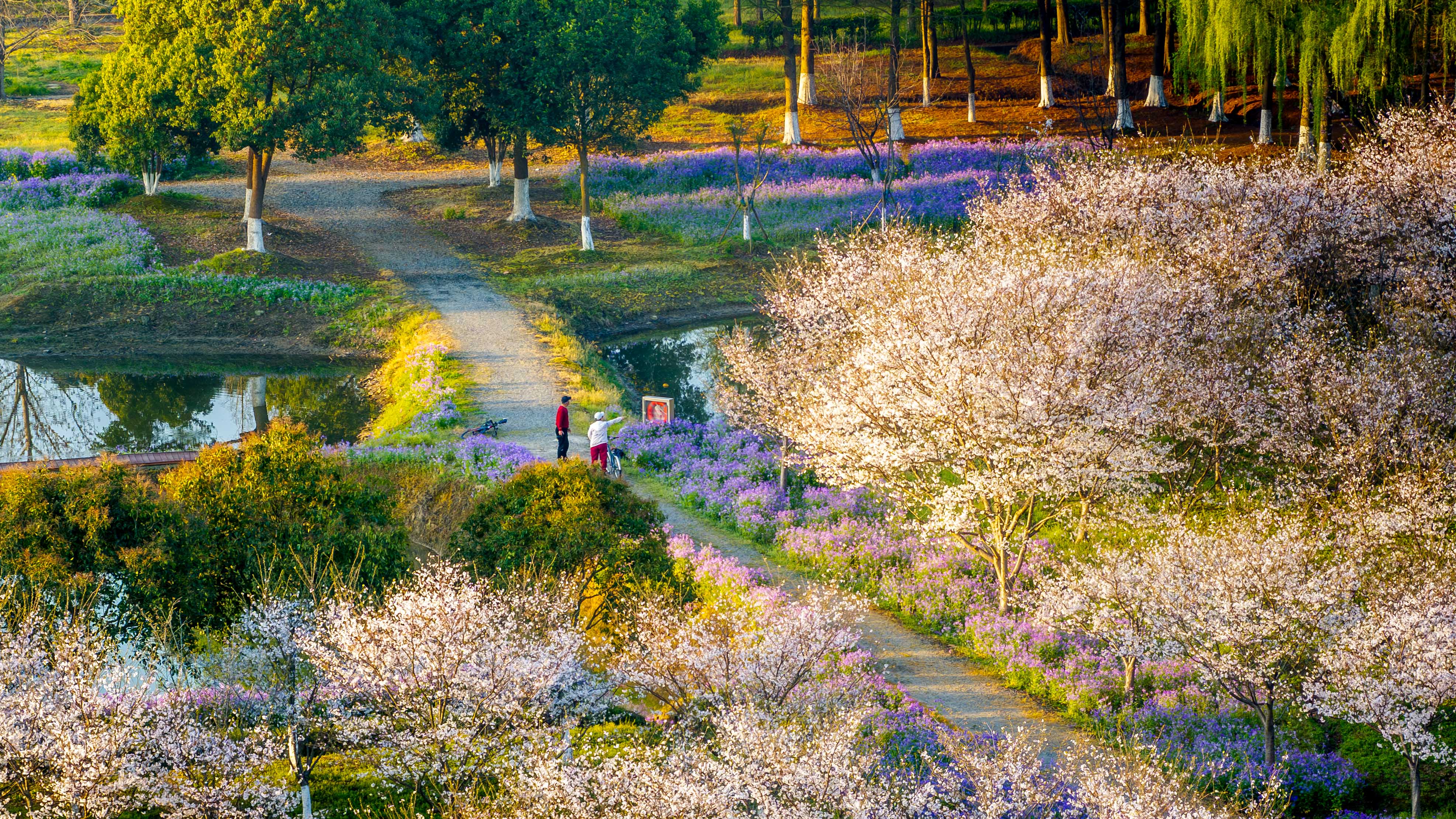 #拍春大赛# 老伴,看那边春天!-嘉兴市海宁市盐官镇 百里钱塘的樱花盛开后,早晨第一缕阳光照耀下,一堆退休老人来到这打卡,老爷爷拿着相机寻找着好看的拍摄角度,这时推着自行车的老奶奶突然说:老伴,看那边多漂亮啊!