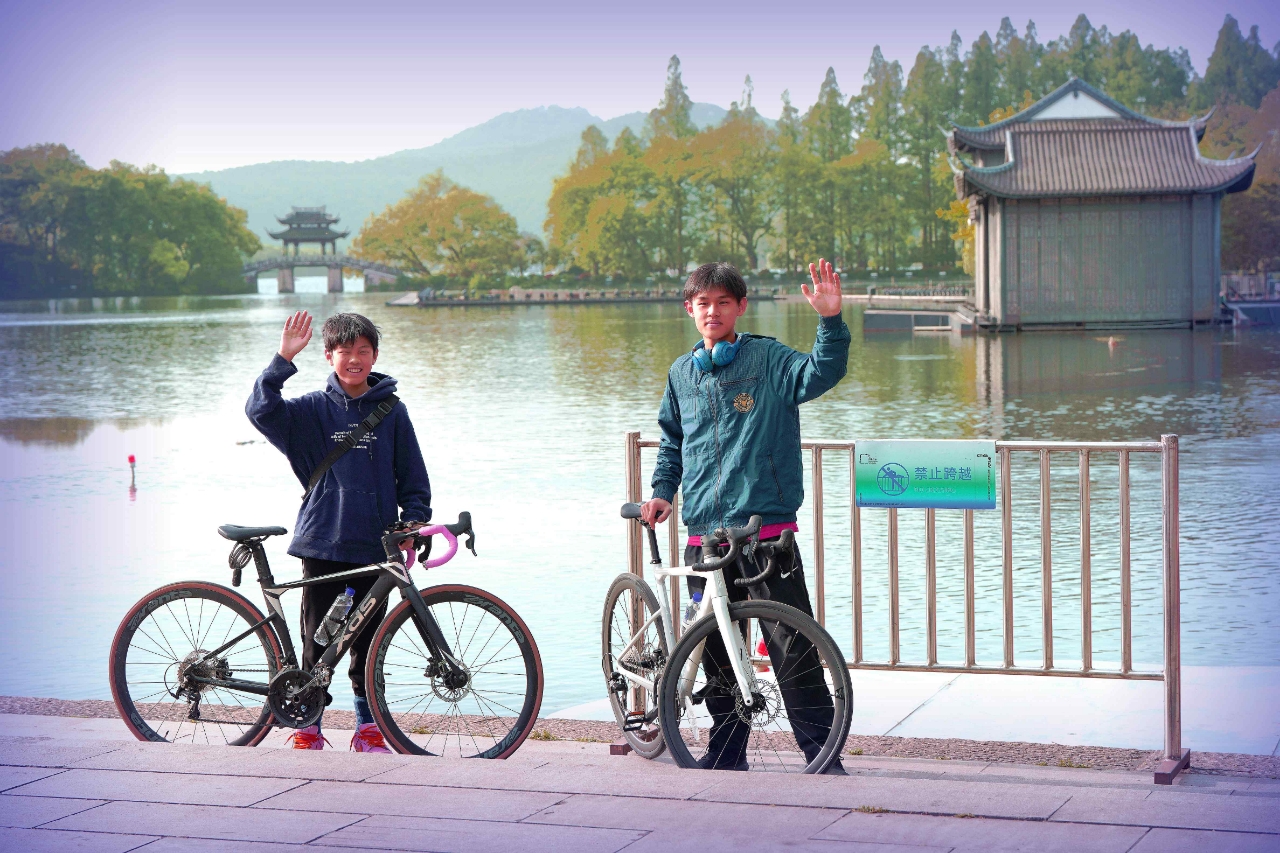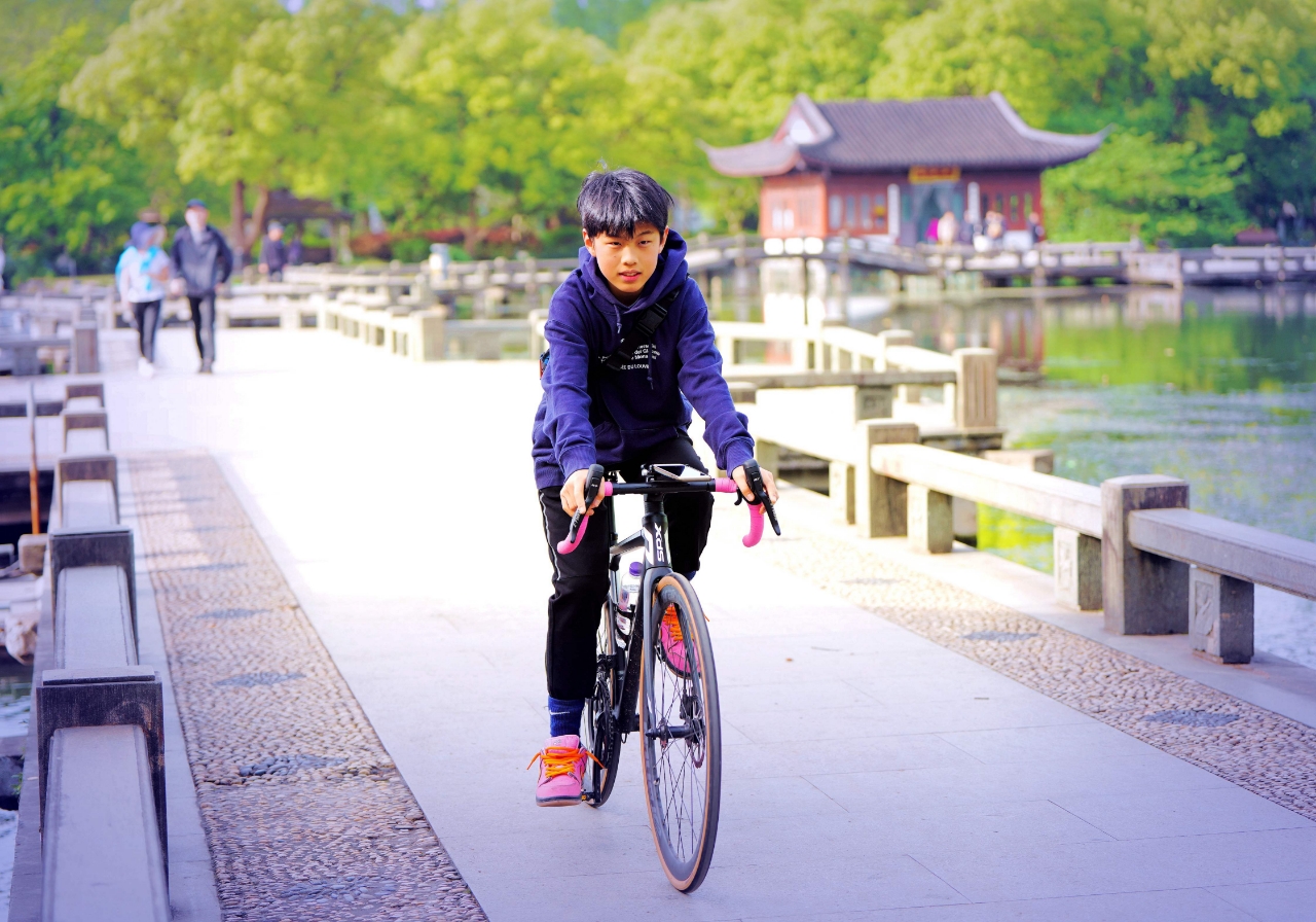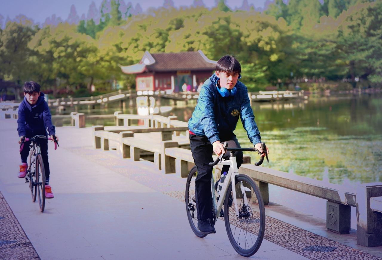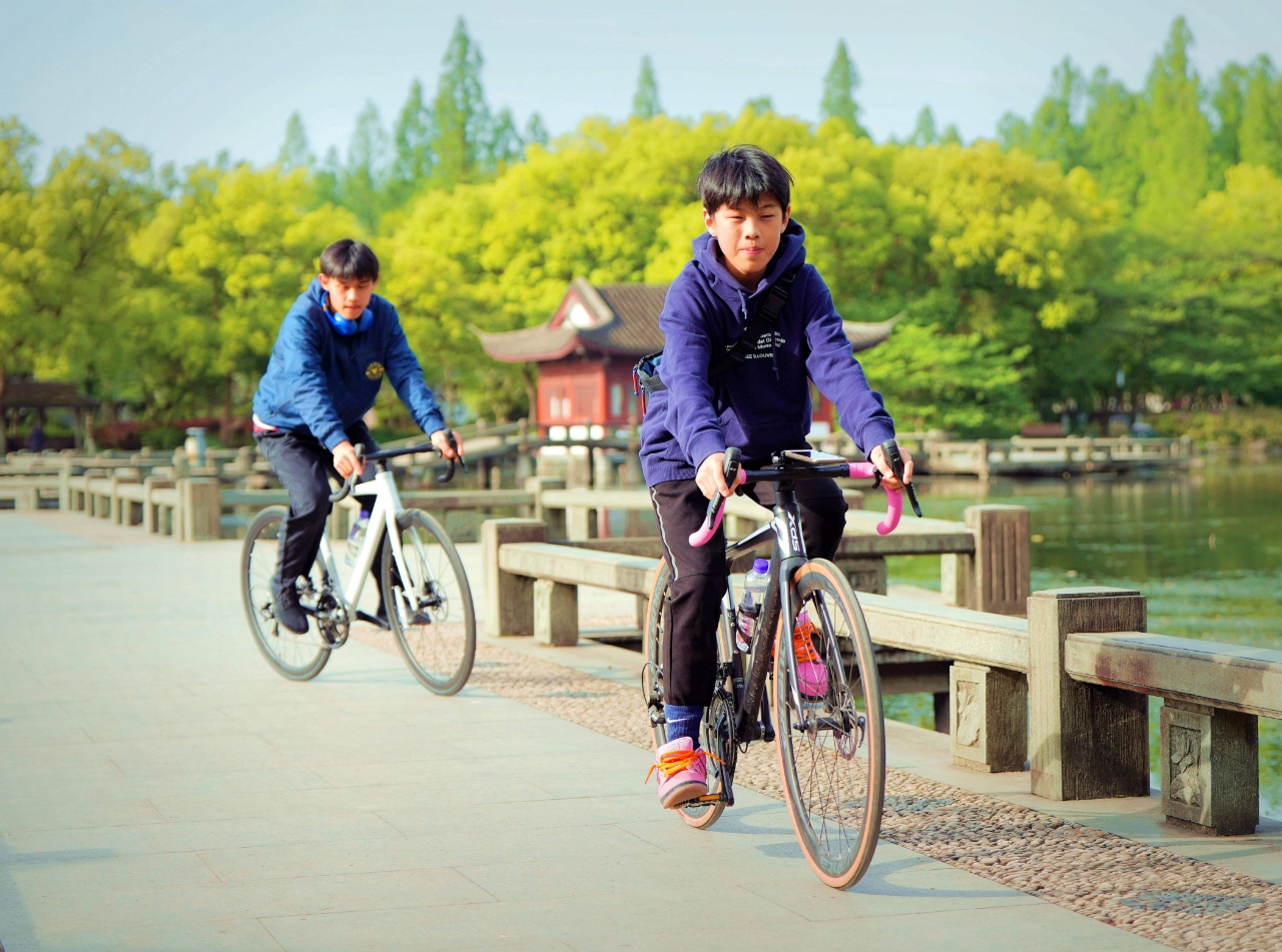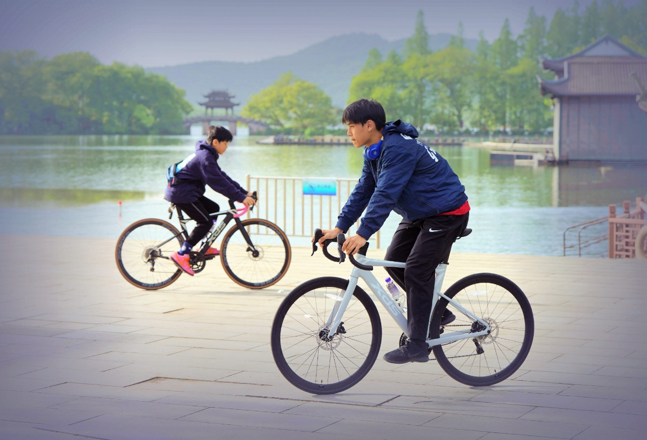 双休日外摄西湖中,偶遇西湖畔玩骑自行车两位学生,交流知晓乃兄弟俩双休骑行健身。学生自我介绍:兄弟俩~哥哥是高中生 弟弟是初中生,家往近钱塘江的上城区钱江路某住宅区。清晨从九溪那儿骑来没有确切的目标,纯粹就是休闲骑车训练~基本上是环湖骑行锻炼身体。 与西湖边其它骑行训练论圈计速度车赛者不一样,纯属休闲式健身骑行,一路赏风景游程,放松调节紧张的学习氛围。(2015.4.13拍摄)