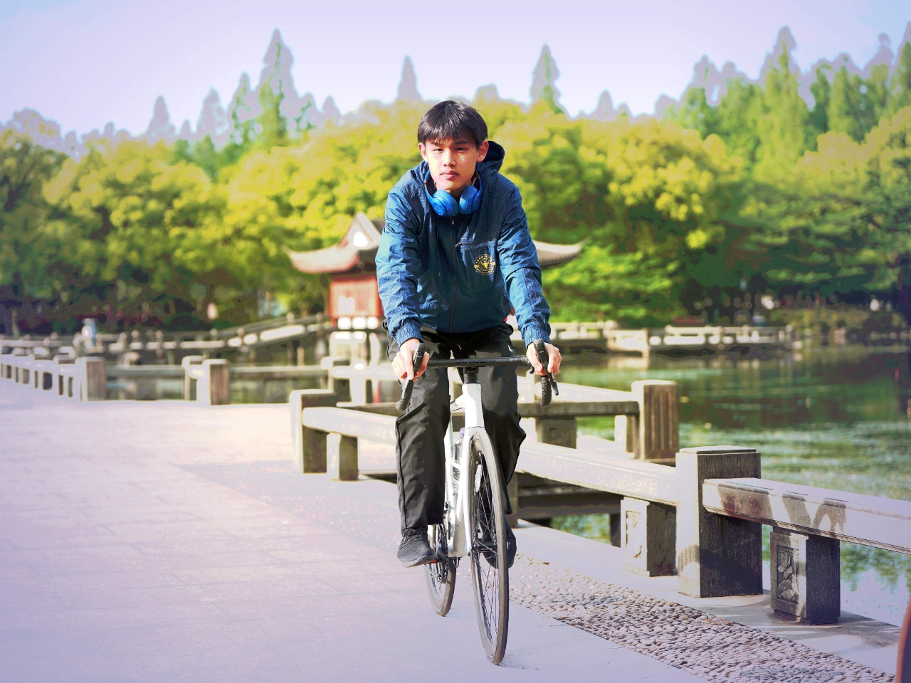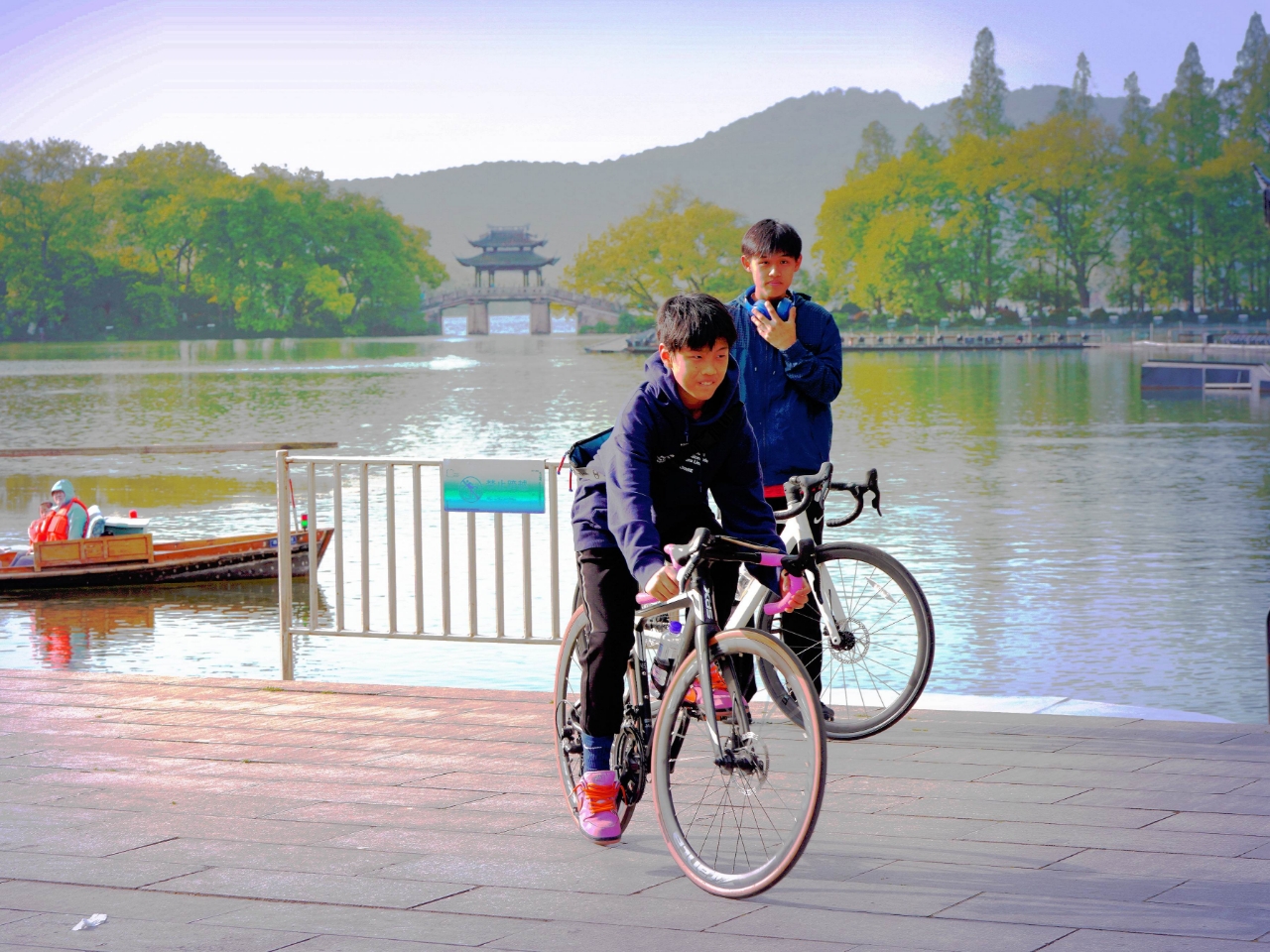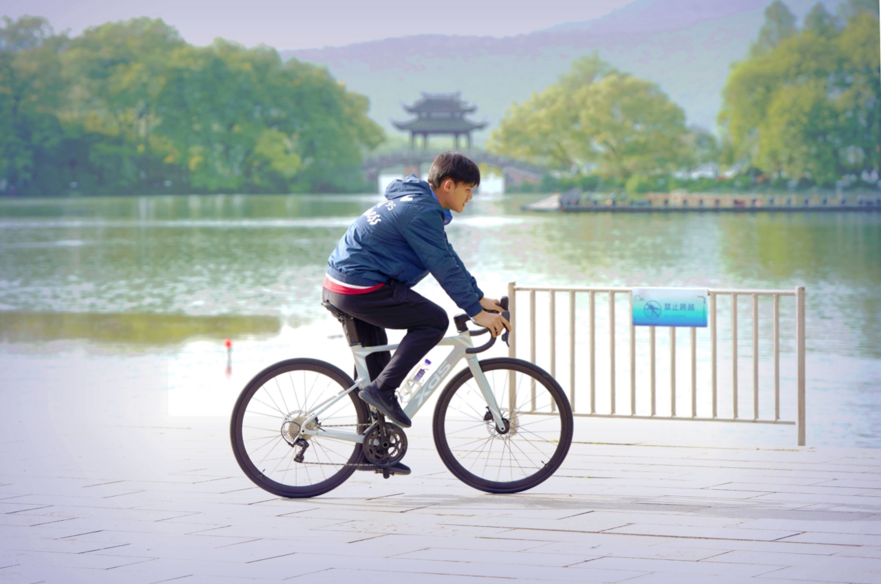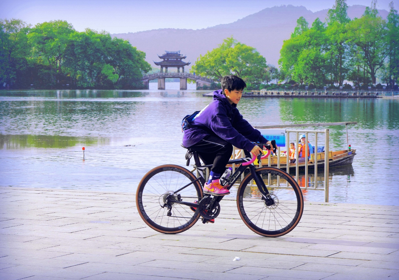 双休日外摄西湖中,偶遇西湖畔玩骑自行车两位学生,交流知晓乃兄弟俩双休骑行健身。学生自我介绍:兄弟俩~哥哥是高中生 弟弟是初中生,家往近钱塘江的上城区钱江路某住宅区。清晨从九溪那儿骑来没有确切的目标,纯粹就是休闲骑车训练~基本上是环湖骑行锻炼身体。 与西湖边其它骑行训练论圈计速度车赛者不一样,纯属休闲式健身骑行,一路赏风景游程,放松调节紧张的学习氛围。(2015.4.13拍摄)