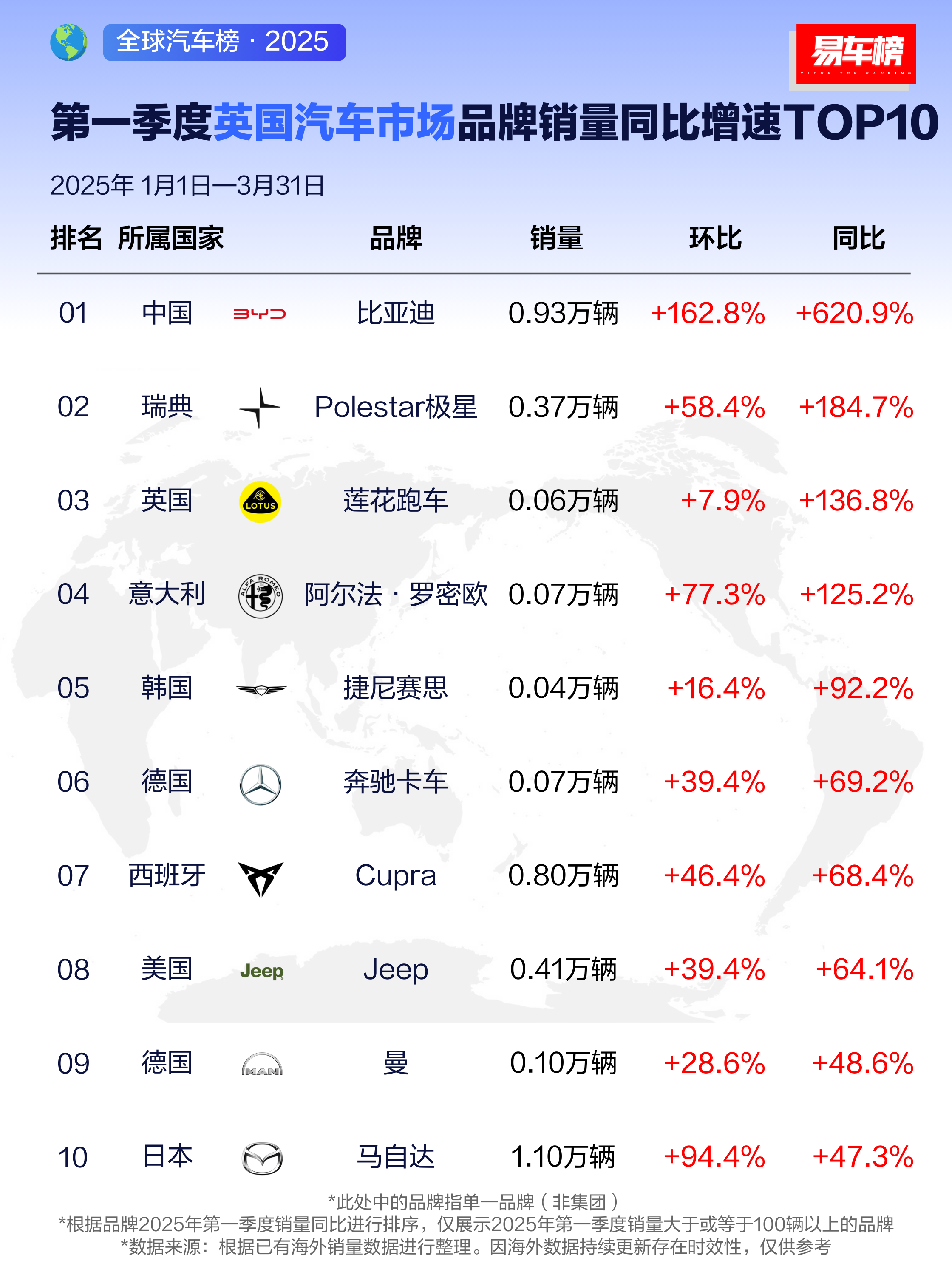 2025年一季度比亚迪海外销量霸榜 2025年一季度,比亚迪在全球多个市场表现亮眼: 中国香港:以0.25万辆销量首次登顶全品牌冠军,比亚迪及腾势占市场超30%,每3台新车就有1台来自比亚迪。 新加坡:以0.22万辆蝉联全品牌销冠,市占率达20%,领先丰田。 泰国:新能源销冠(0.88万辆),罗勇工厂助力本土化,车展订单破万,打破日系垄断。 澳大利亚:新能源第一(0.88万辆),BYD SHARK 6成最畅销插混,海豹获权威奖项。 巴西:新能源销冠(2万辆),2024年销量飙升至第10名,总统卢拉选择比亚迪唐为座驾。 意大利:新能源销冠(0.42万辆),腾势进军欧洲,加速市场拓展。 英国:销量同比激增620%(0.93万辆),宋Plus DM-i成最畅销插混。 截至2025年4月,比亚迪新能源汽车出海足迹已覆盖全球六大洲,累计112个国家和地区。根据中汽协数据,今年第一季度,中国新能源汽车出口量44.1万,同比增长43.87%;比亚迪新能源汽车出口量达21.4万,同比增长117.27%。 这一成绩的背后,是比亚迪在技术创新和全产业链布局上的持续投入。比亚迪正以技术创新和高质量产品推动全球绿色出行变革,持续引领全球新能源汽车向前发展。