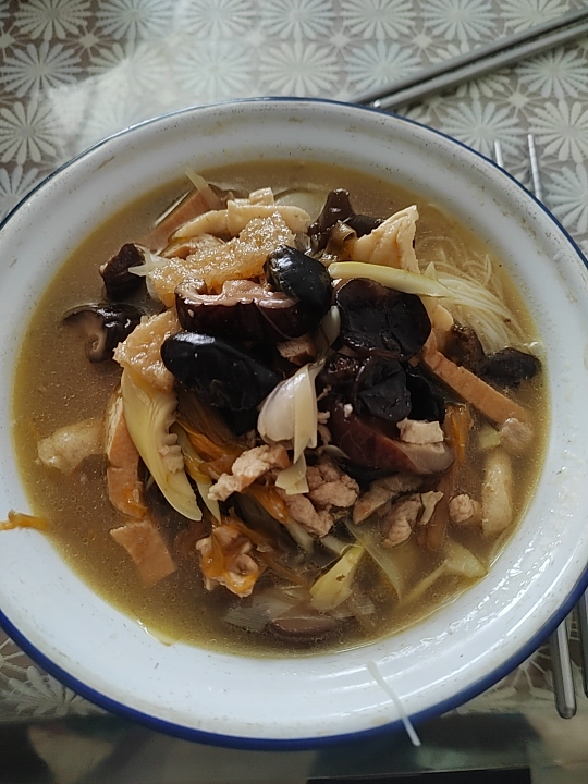 临海特色姜汤浇头面,有肉皮,木耳,香菇,豆干,黄花菜,肉丝,笋等等配料,超级喜欢