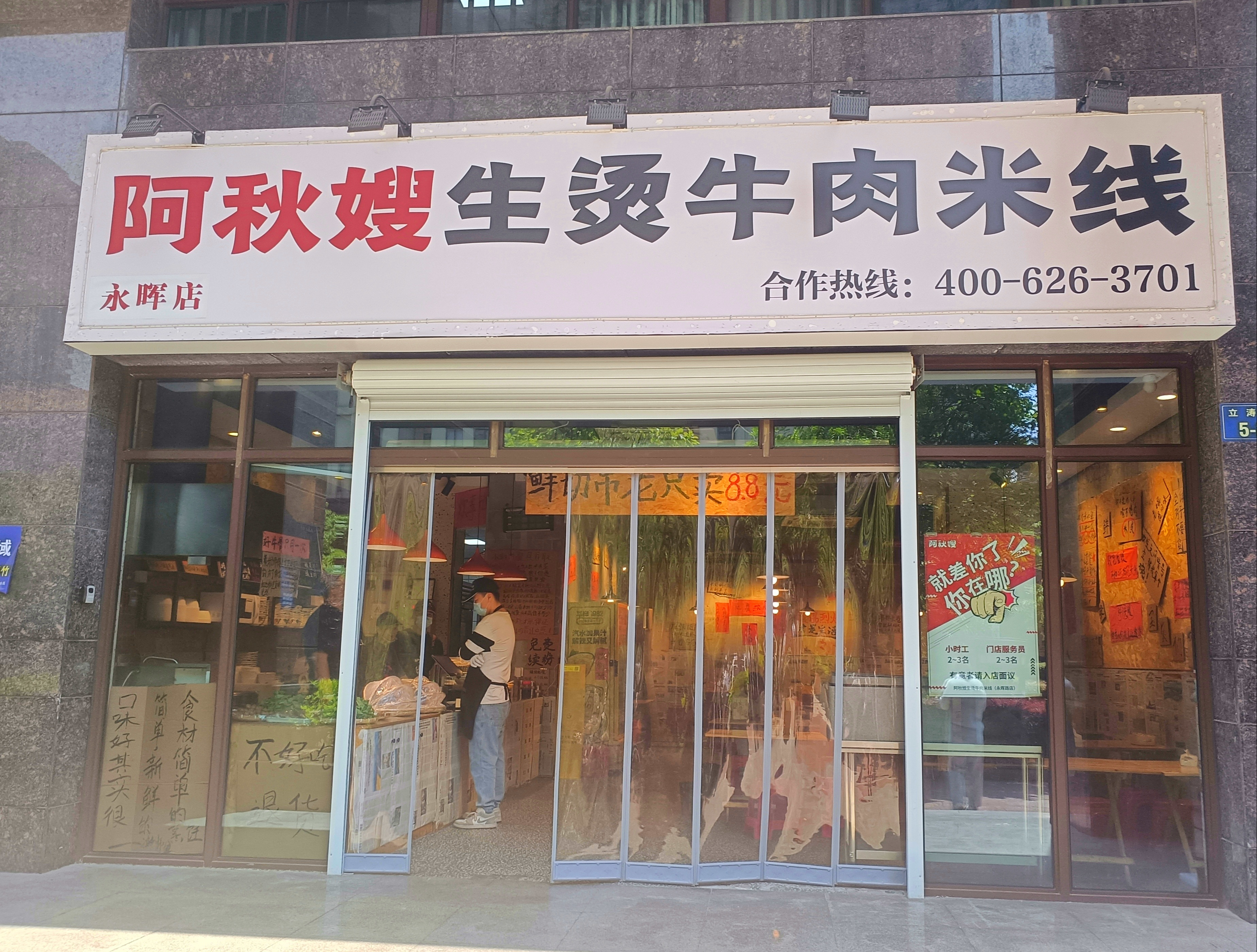#盈丰街道立涛园社区#周边有你的宝藏小铺吗?小编最近的心头好是党群服务中心对面的阿秋嫂生烫牛肉米线!温暖的灯光,可爱的标语,特色的小料(强烈推荐薄荷叶),还有热腾腾的米线!一碗下去,治愈一整天~