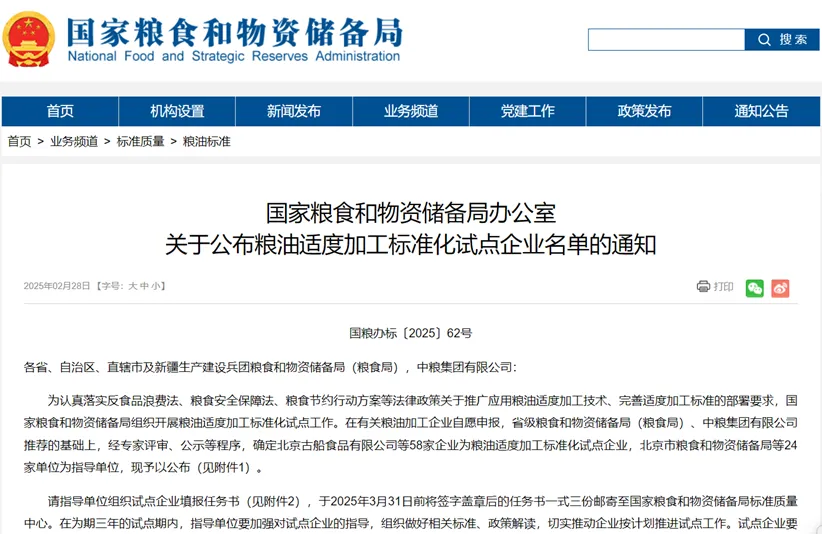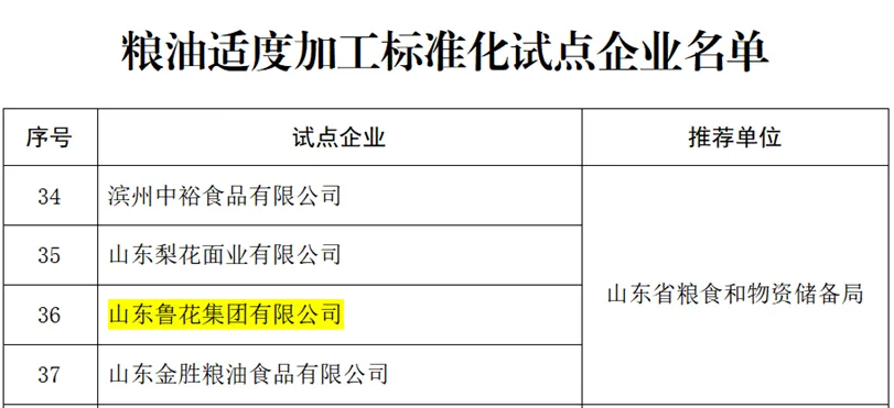 鲁花集团入选国家粮油适度加工标准化试点企业名单 近日,国家粮食和物资储备局公布粮油适度加工标准化试点企业名单,全国共58家企业入选,莱阳市鲁花集团成功入选,是烟台地区唯一上榜企业。 此次鲁花集团凭借行业领先的5S压榨一级花生油技术成功入选粮油适度加工标准化试点企业名单,这一殊荣不仅彰显了企业在花生产业高质量发展中的示范引领作用,更体现了其在提升我国食用油供给品质方面的突出贡献。