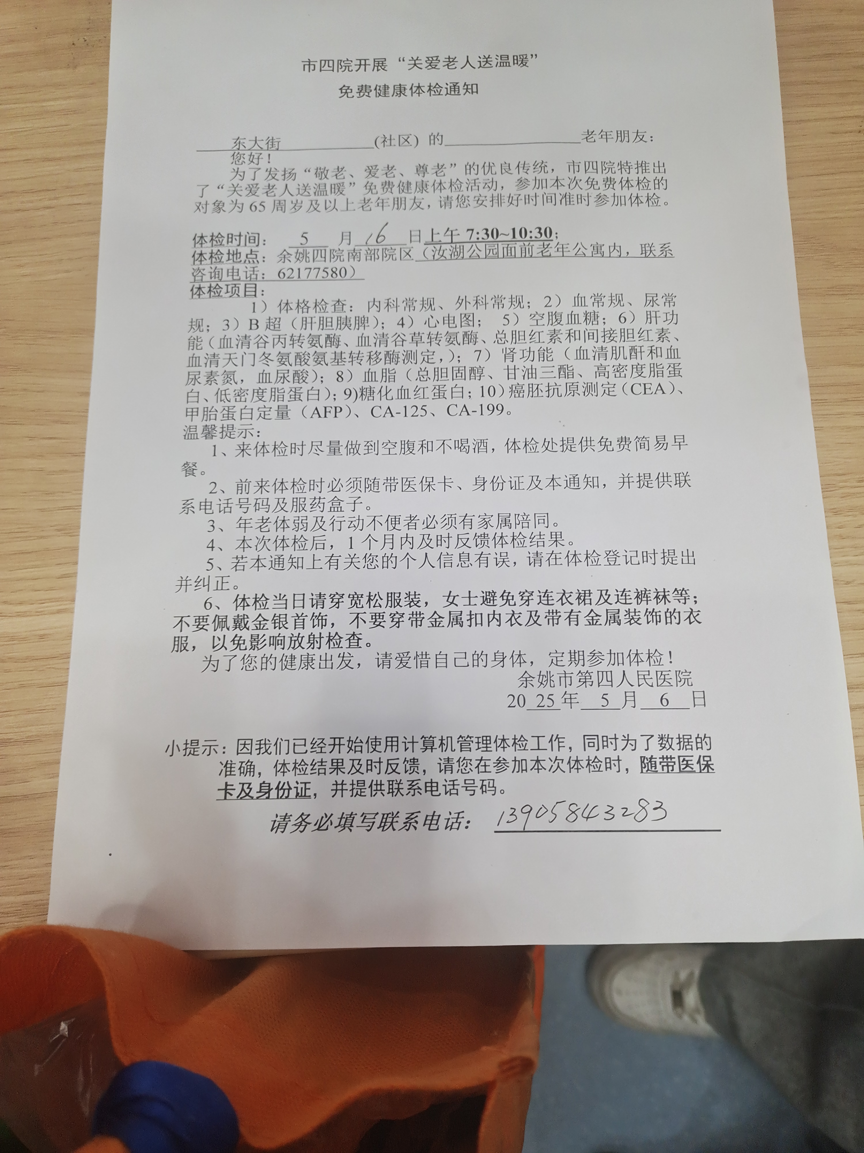 红色的五月,阳光明媚的五月。为发扬“敬老、爱老、尊老”的优良传统,余姚市第四人民医院为泗门镇4个社区、16个行政村的65周岁以上的老年朋友推出“爱老人送温暧”免费健康体检活动,有序登记,抽血细心,B超认真,拍胸片仔细……现场爱心暖暖,情真切切。充分体现了关爱老人,你我践行。