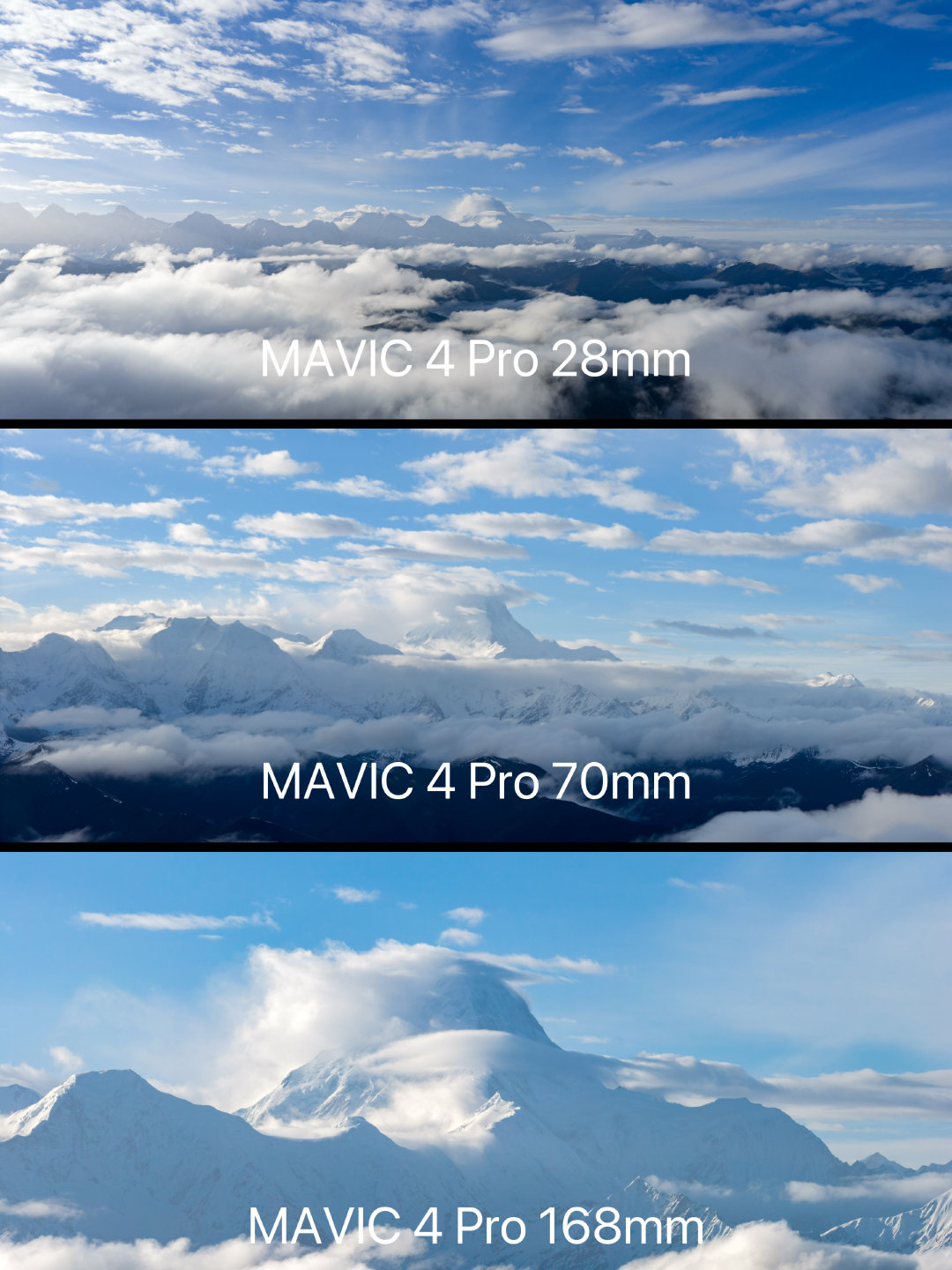 我又去川西啦,带着新入的大疆Mavic 4 pro很幸运的在海拔4600 米的德钦秘境观景台拍到了云海贡嘎,我分别用了一倍,三倍,长焦拍到了在不同焦段下的云海贡嘎这次Mavic 4 pro的主摄28mm给我的感觉像是被克制的广角,相比上一代的 24mm 广角视角看似少了一些视角冲击力,却让我的构图更加沉稳,边缘畸变更小,一亿像素也让画面有了更多细节,当我切换到三倍 70mm时,长焦的压缩感让原本相距数公里的云海与贡嘎主峰产生了“亲密接触”168mm的长焦让贡嘎雪山的主峰以近乎超现实的方式出现在我眼前Mavic 4 pro的三个焦段就像三把不同的钥匙,主摄像是打开了贡嘎雪山的秘境之门,中焦让我更好的凝视贡嘎雪山,长焦足以让我窥见神迹