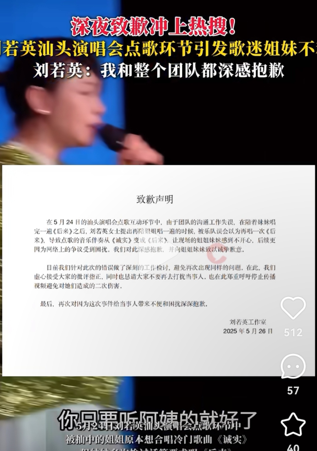 看了刘若英汕头演唱会的点歌风波,特意去搜了《诚实》来听。突然就理解了姐姐为何要点这首歌。 “我又何尝想,永远当天使。装聋作哑不妒忌、 不绝望,反正我这么坚强,你尽管让我受伤。若我是你都能体谅,何苦看你被我的爱劫持”。 在演唱会上,姐姐被剥夺点歌机会,只是情绪爆发的冰山一角。而刘若英的回应和道歉,引起的全民热议,甚至讨伐,只是引起了大家的共情。 或许是那个永远被牺牲的老大,或许是职场里被忽略的小透明,或许是情绪和需求不被重视的小时候,或许是无数个不被珍视的边缘时刻…… 女性的牺牲陷阱,常常被披上好看的外衣。被教育为他人着想,不给别人带来麻烦的可能,被强迫牺牲,只消一句“你是姐姐,你是妈妈,你是奶奶,要懂事,要体面,理应当……” 被忽略的剥削,被美化的奉献,也许到最后只换来一句“不求回报、默默无闻”的歌颂。最可怕的是,枷锁会代价传递,被包装成温情的模样,以家庭的责任,以贤妻良母的光环,还要美其名曰,清醒地取舍,自我的放弃…… 大家为姐姐发声,更像是在为自己发声,为自己的委屈、心酸和无奈发声而已。只是公众人物在公开场合无意的忽视、情绪的冷处理,就活该来承受这一切么? 也许是社会在追求真我和个性的解放,我们越来越懂得忠于自我的可贵,越来越勇于爱自己。也许是媒体热搜放大了这些声音,一点点不够妥帖、不够完美,就要被拉出来审判。 不知道何时起,年少喜欢的偶像开始频频翻车。从胡歌的古早言论,到全方面全网被嘲的大如和陈坤;从不能体面老去的六小龄童,到演唱会假唱的五月天,到凹大厨人设的黄磊。 想到前些天因口误被挂了两周热搜的陈丽君,也想到被全明星深情追忆敬业,被全民缅怀的朱媛媛。她德艺双馨,有口皆碑,连去世都在为他人着想。除了叹意难平,一声叹息…… 也许,反抗不是决裂,不是硬扛伤害,而是为自己发声,夺回牺牲的自由,夺回被定义幸福的权利。 不要温和地走进那个良夜,愿你我都不会辜负自己,愿所有的情绪都有出口,愿善良终有回响。