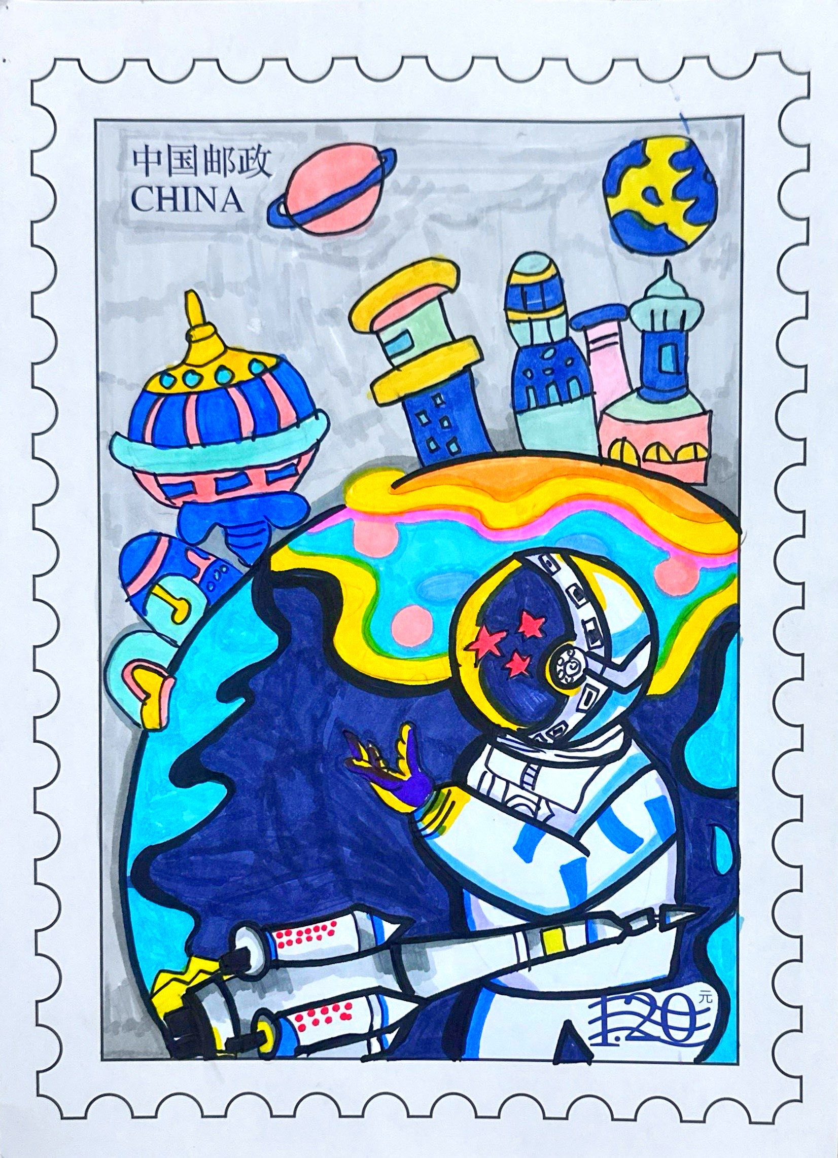 遨游宇宙 杭州市东城第五幼儿园 大一班 魏源杄 画面中火箭把一个宇航员载到了月球,这个勇敢的宇航员在月球上充满了对未知世界的好奇和探索,手指还伸出来探索,一艘飞船正在穿越星际,驶向星球。画面中月球上还建着房子,未来人们可以在月球上生活。科技在慢慢发展,我们看到了无限的可能性和梦想的实现。