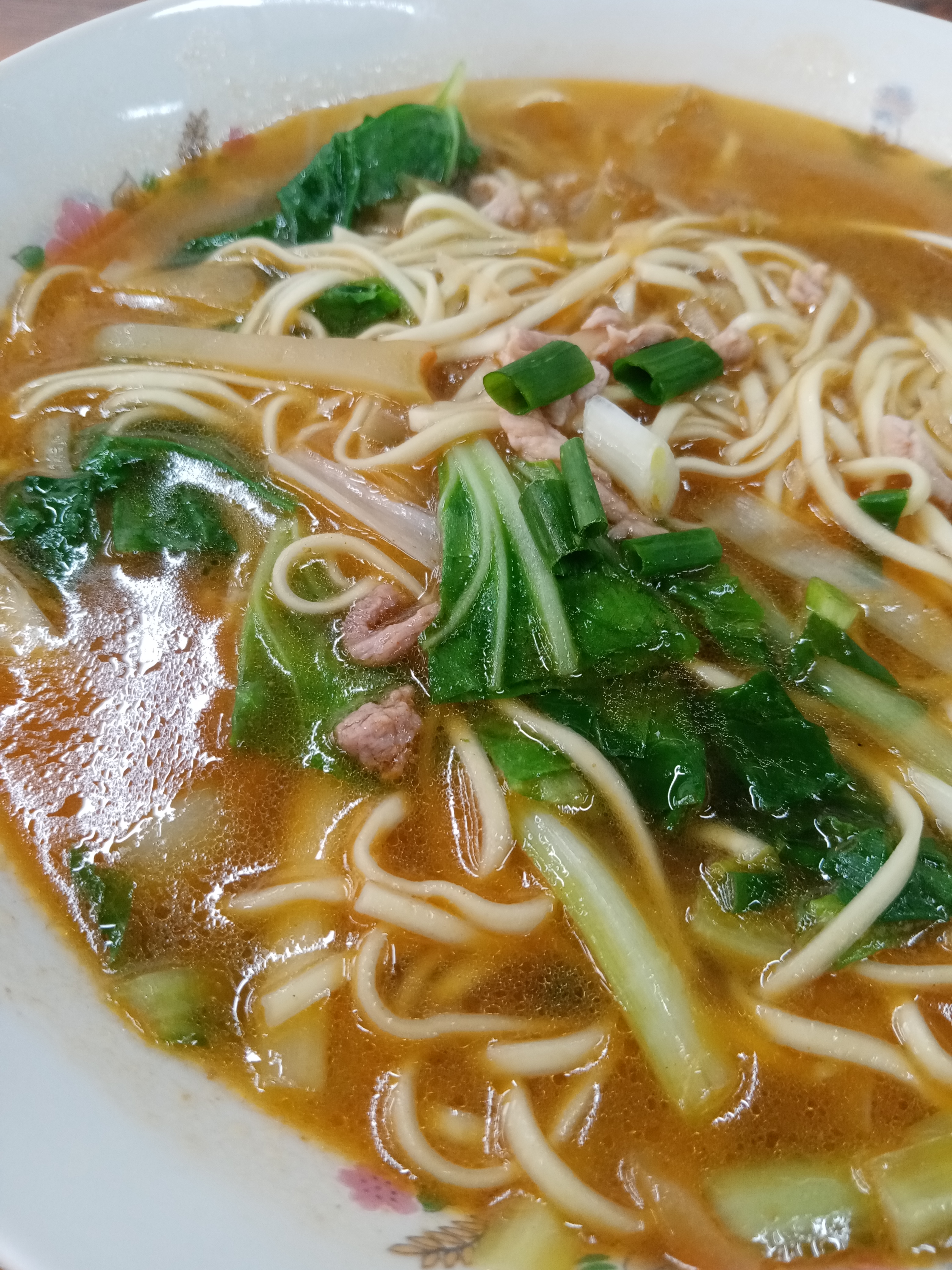 "一碗热腾腾的中式料理,面条劲道,汤鲜味美,青菜葱花肉片齐全,简单餐食也能幸福感满满!美食当前,餐具都显得格外温馨~🍜🥢"