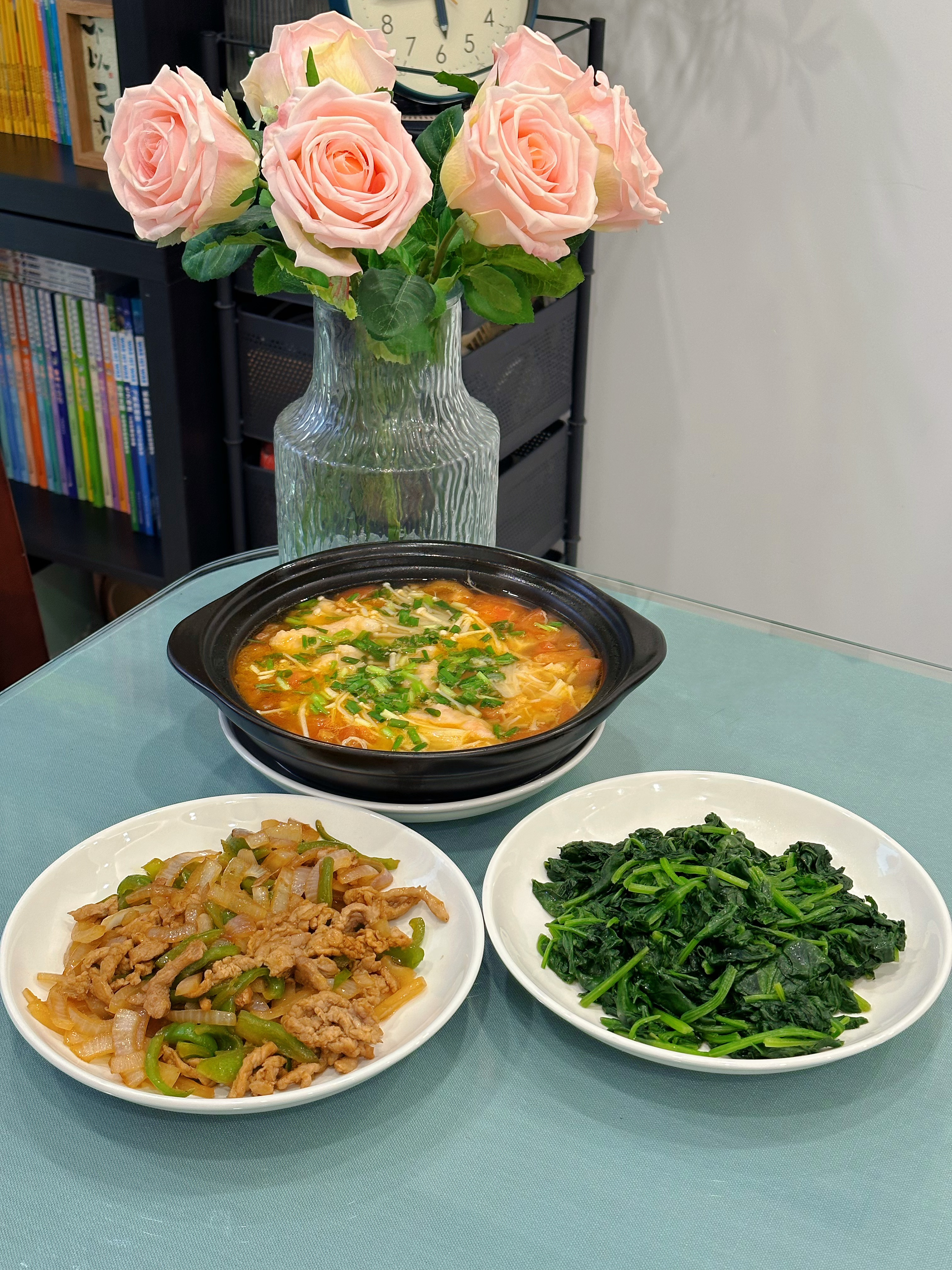 1⃣️番茄金针菇虾滑煲 2⃣️洋葱青椒炒肉丝 3⃣️清炒菠菜