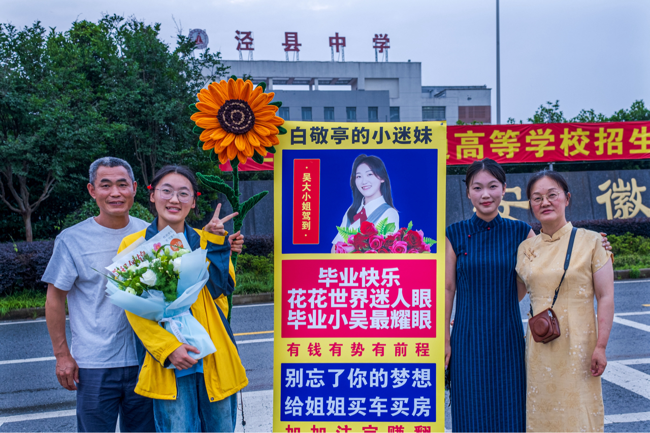 《温馨时刻》毕业典礼上,泾县中学四人旗袍合影,手捧鲜花,笑对镜头。吴大小姐驾到,毕业快乐!花花世界迷人眼,愿你有钱有势有前程,别忘了初心和梦想。向日葵装饰的红色横幅下,我们的青春永不散场!🎓🌺