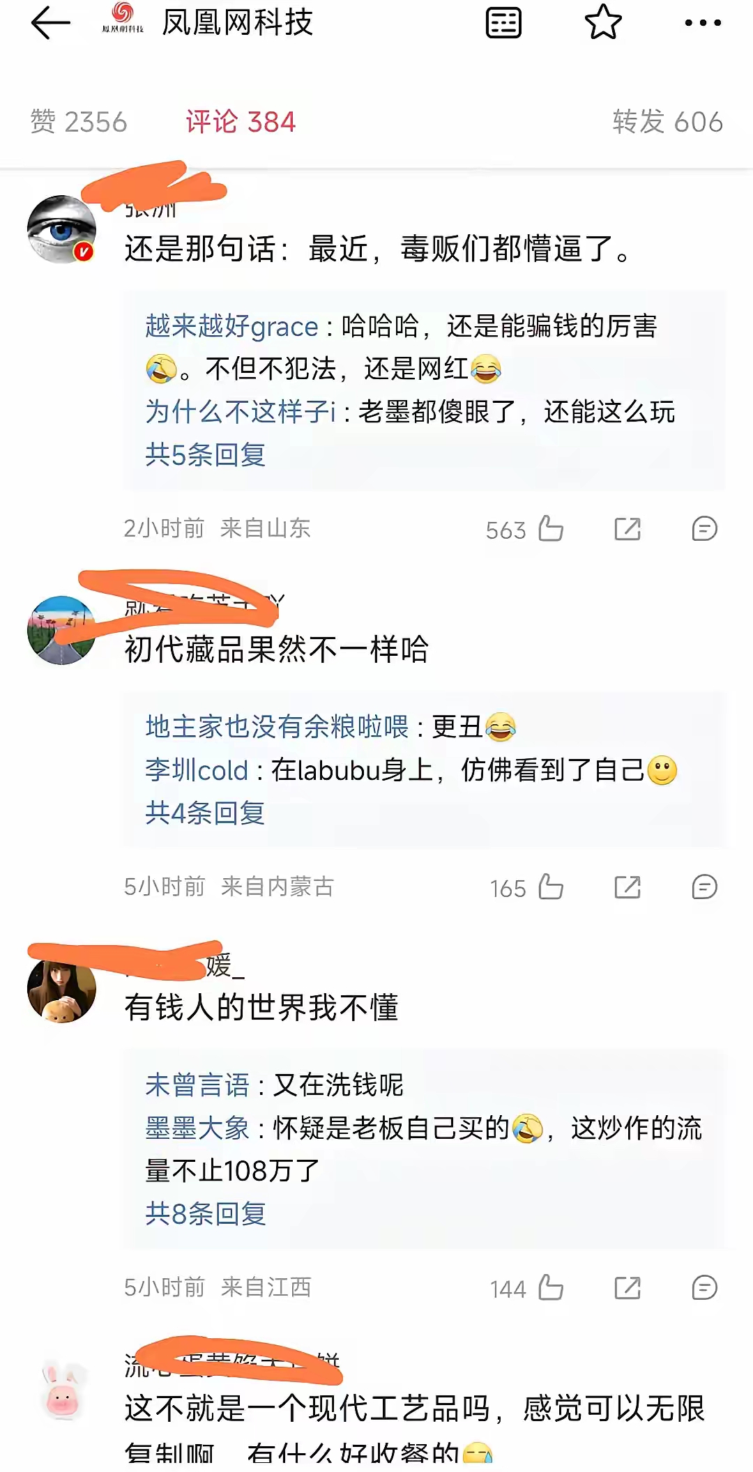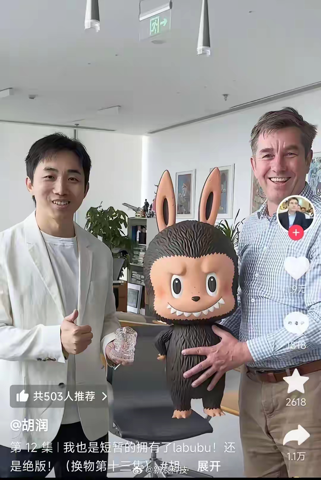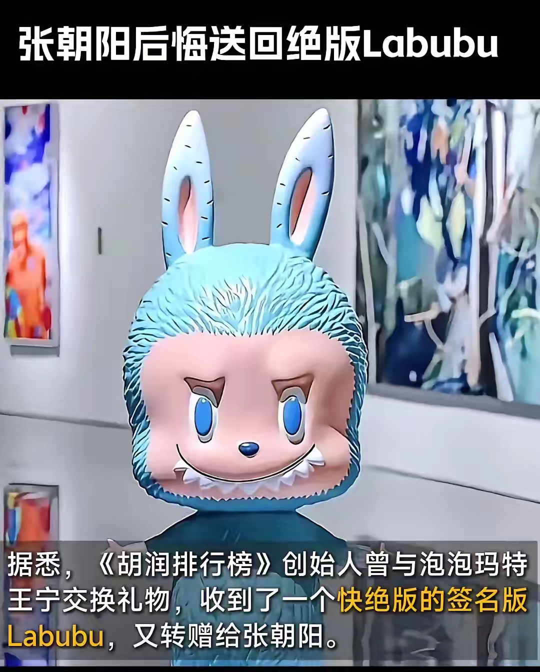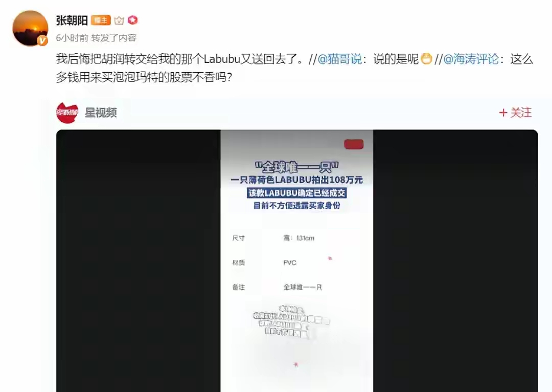搜狐张朝阳后悔了!把胡润送的有王宁亲笔签名的labubu又还回去了 之前胡润百富榜创始人胡润送了张朝阳一个快绝版的labubu。上面有王宁的亲笔签名,可以说是绝版中的绝版。当时王宁还说公司都没有了,这是最后一个。 不过当时张朝阳不知道这玩意有什么好。可能觉得这是个塑料玩具,没当回事,就还回去了。谁想到,才过了几年,同款的一个薄荷色labubu居然拍到了108万。 那么可想而知,给张朝阳的那个签名版的绝版labubu值多少钱了吧?即便如今张总已经不在乎钱了,但其中的意义可能还是很不一般的。