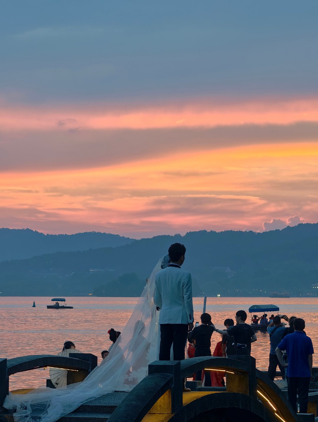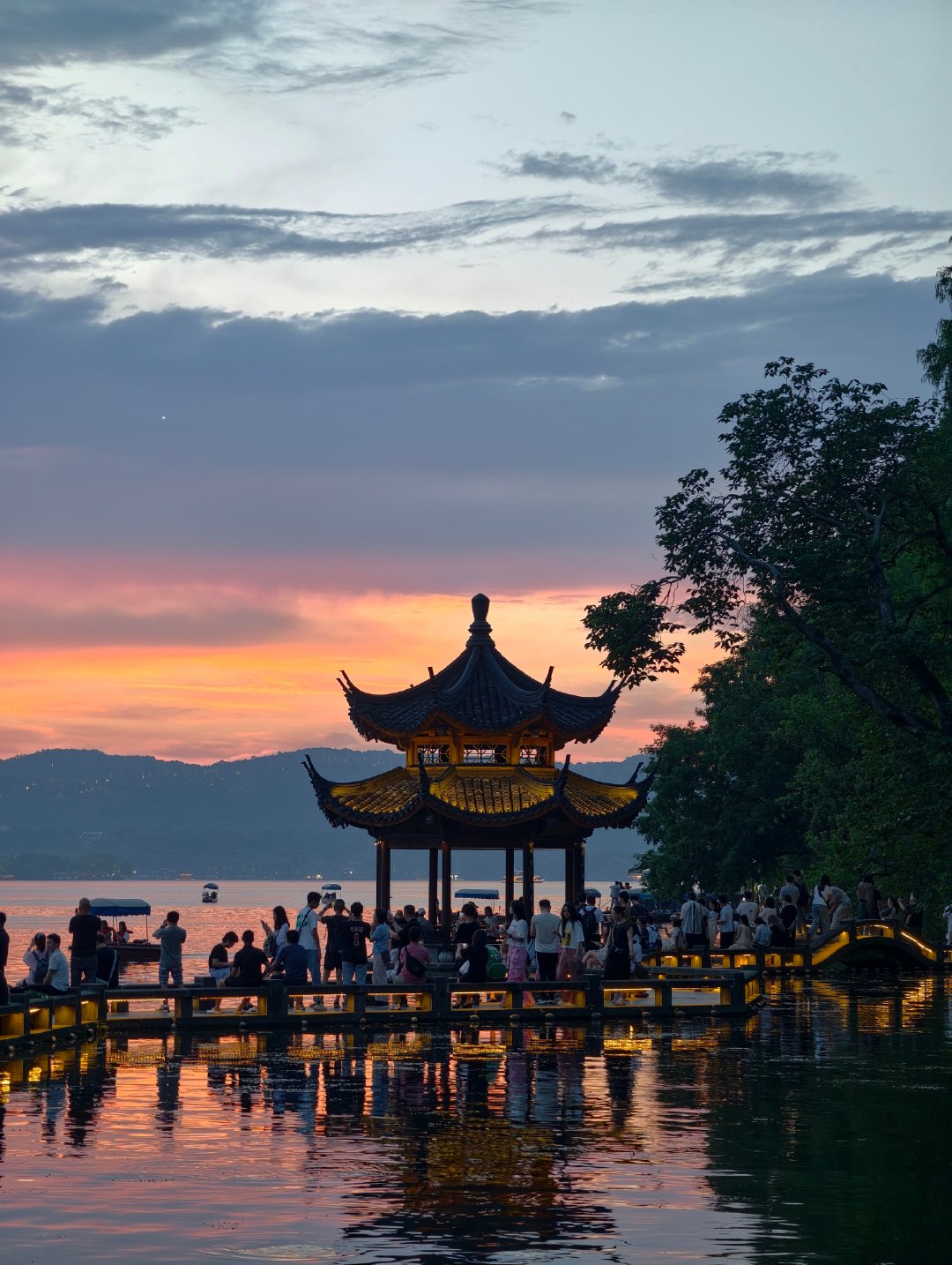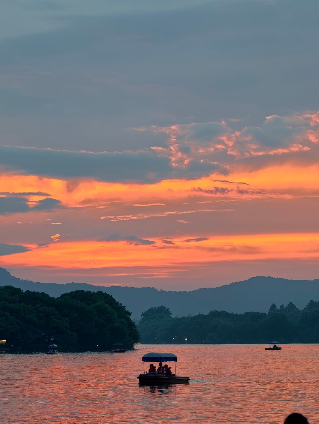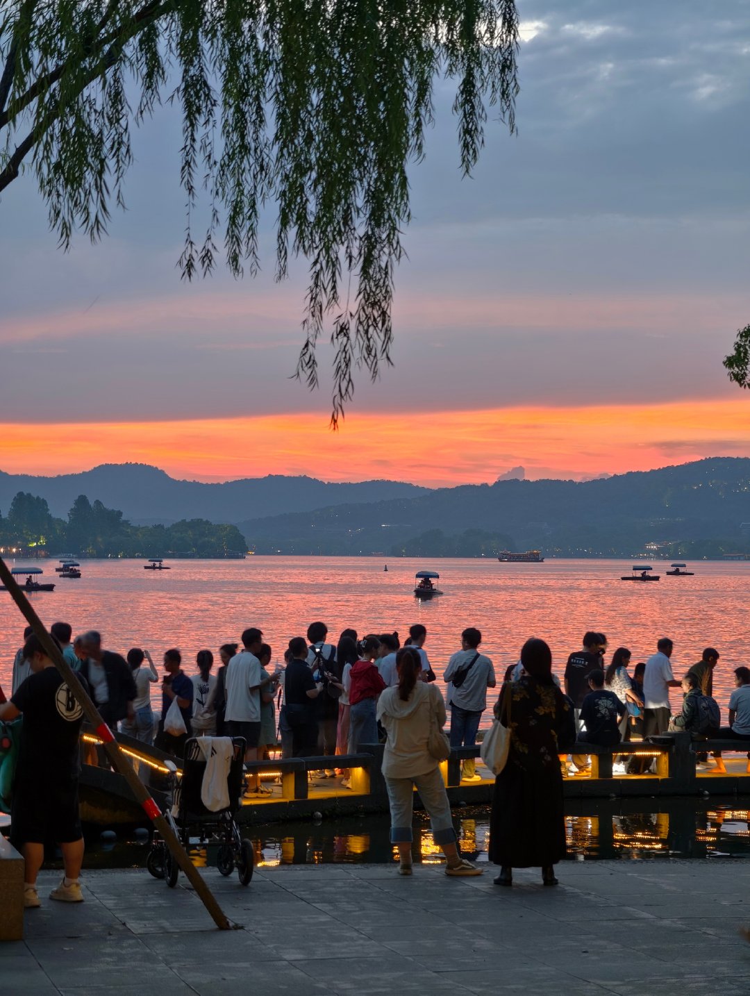 傍晚时分去西湖的长桥公园散了散步,随手拍到了晚霞正从天边开始“上色”,像有人打翻了橘红色的颜料盘,把西湖的水面染得金灿灿的,西湖边的风吹着微凉,把晚霞的颜色都吹得忽明忽暗