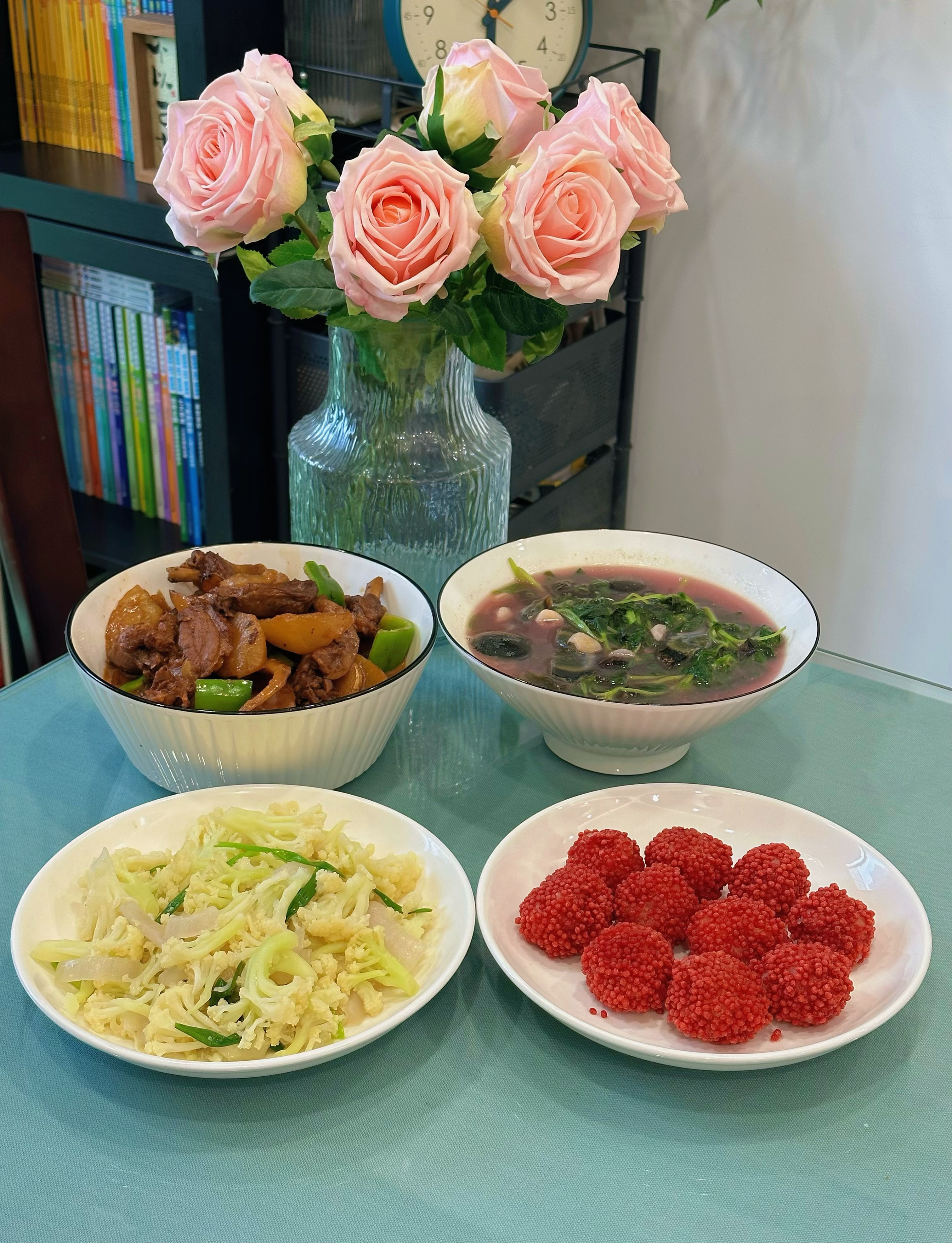 1⃣️啤酒鸭 2⃣️皮蛋炒苋菜 3⃣️清炒花菜 4⃣️荔枝虾球