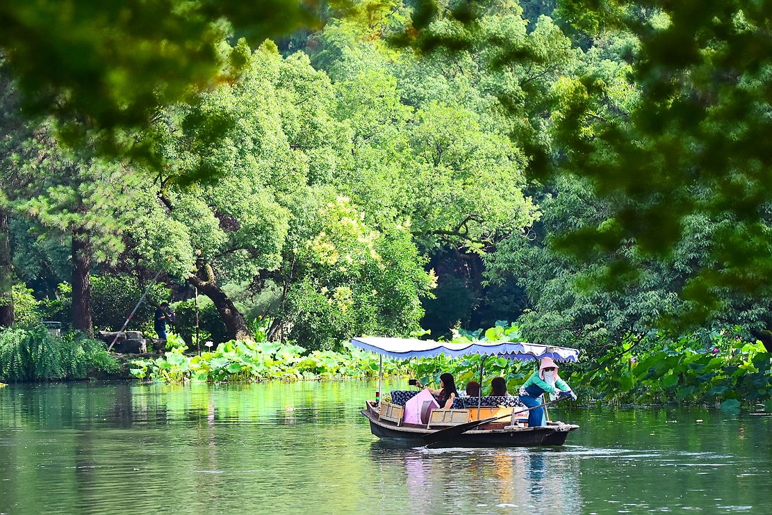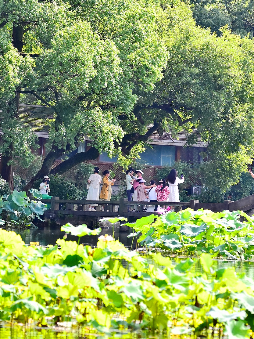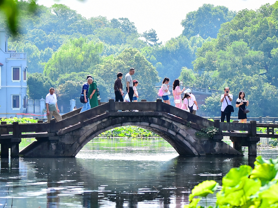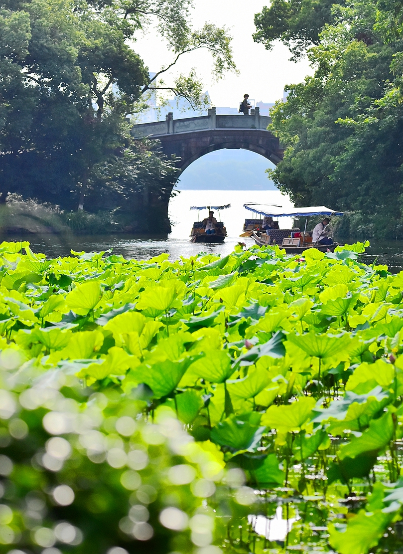 绿意盎然夏西湖——晨游西湖,漫步白堤、孤山和曲院风荷公园,一路赏夏景,青山绿水、翠柳拂堤、荷叶碧绿、荷花娇艳。绿色中的古塔、古桥焕发出了青春。游客漫步、荡舟,陶醉于夏西湖的绿意中。摄于2025年6月14日。