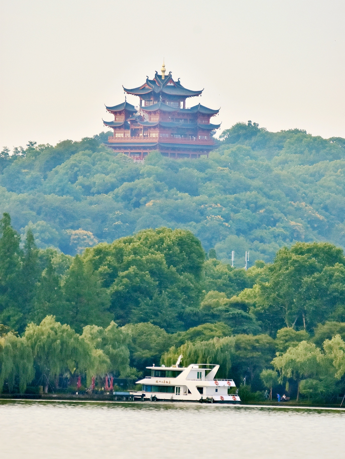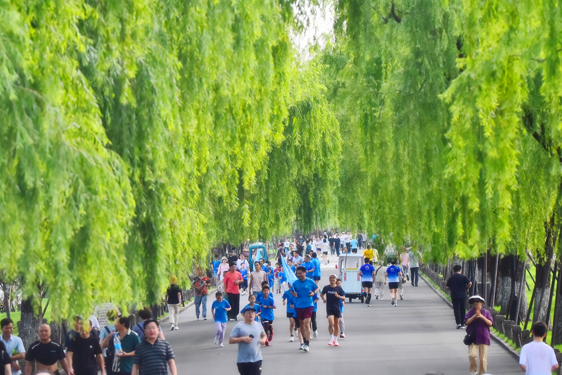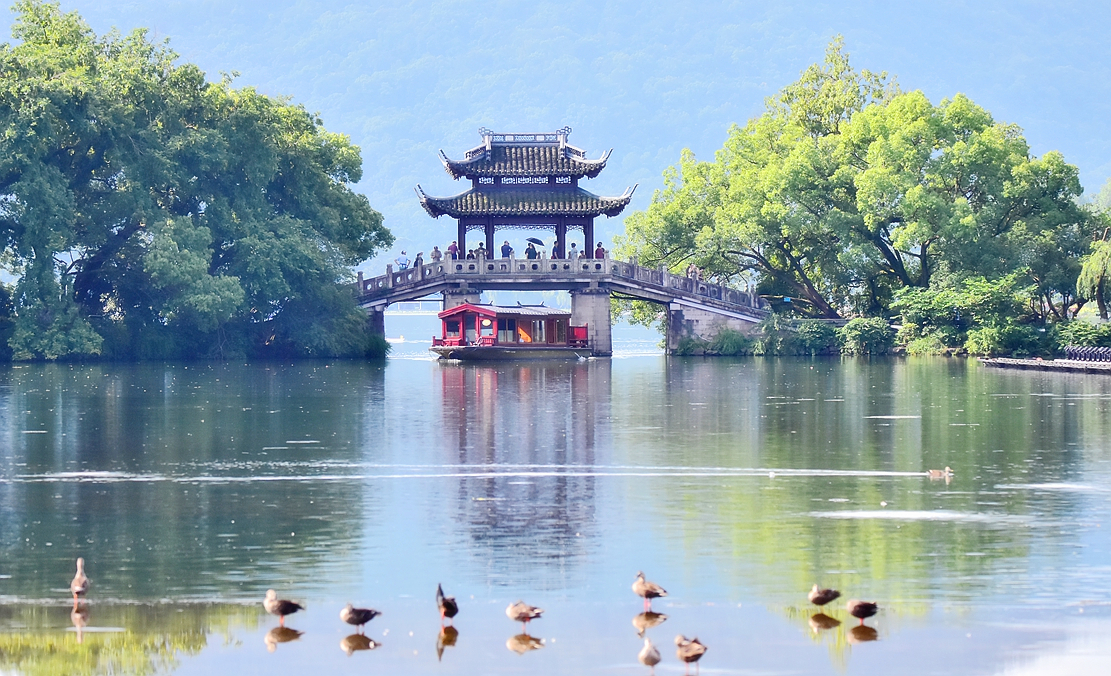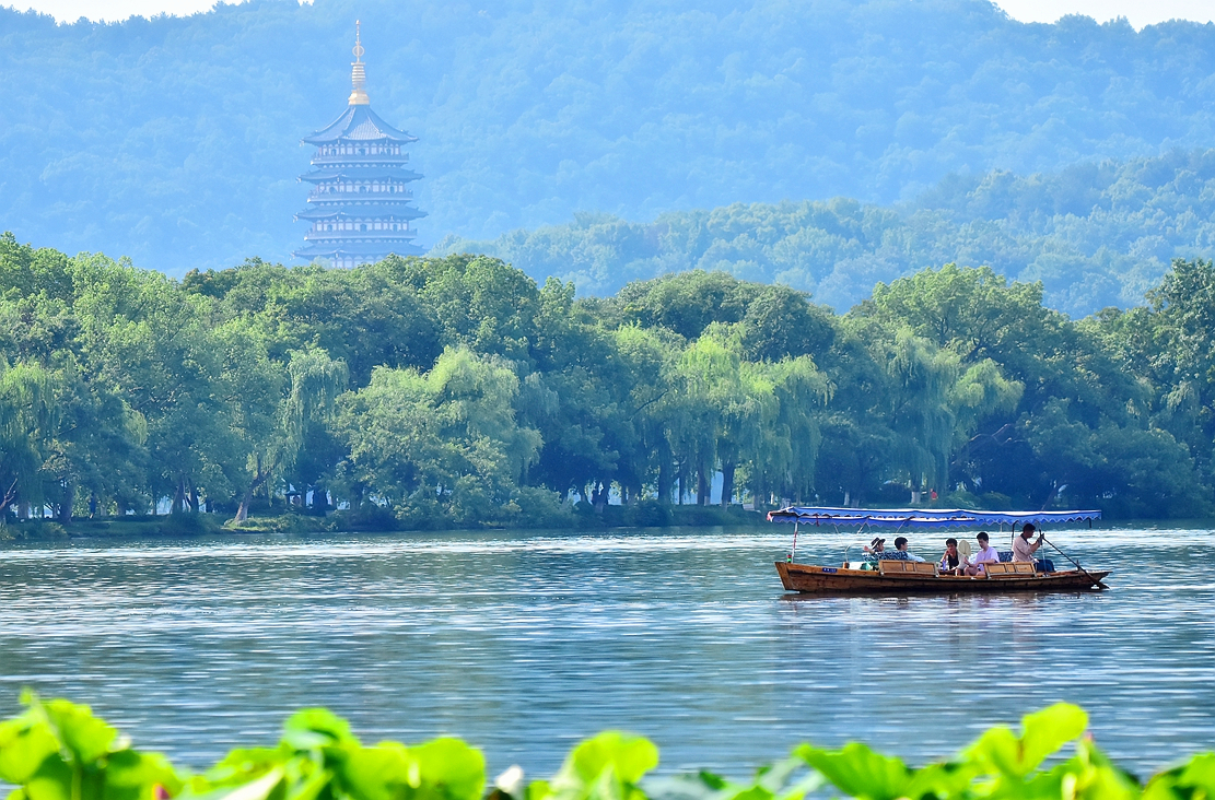 绿意盎然夏西湖——晨游西湖,漫步白堤、孤山和曲院风荷公园,一路赏夏景,青山绿水、翠柳拂堤、荷叶碧绿、荷花娇艳。绿色中的古塔、古桥焕发出了青春。游客漫步、荡舟,陶醉于夏西湖的绿意中。摄于2025年6月14日。