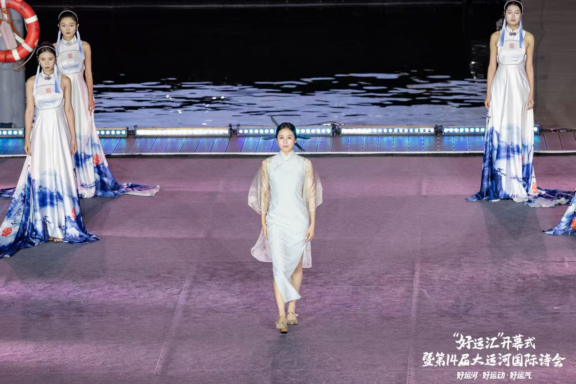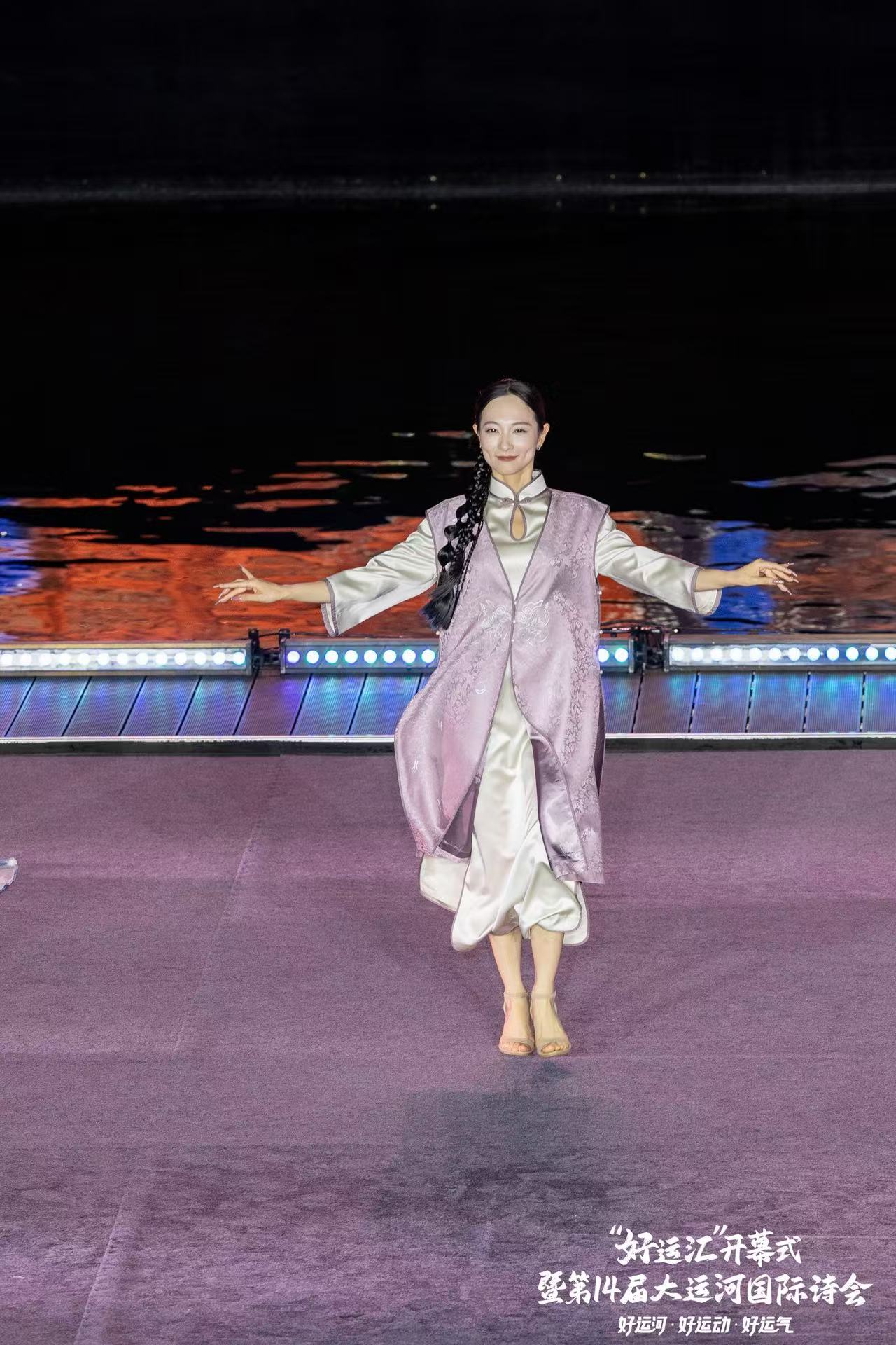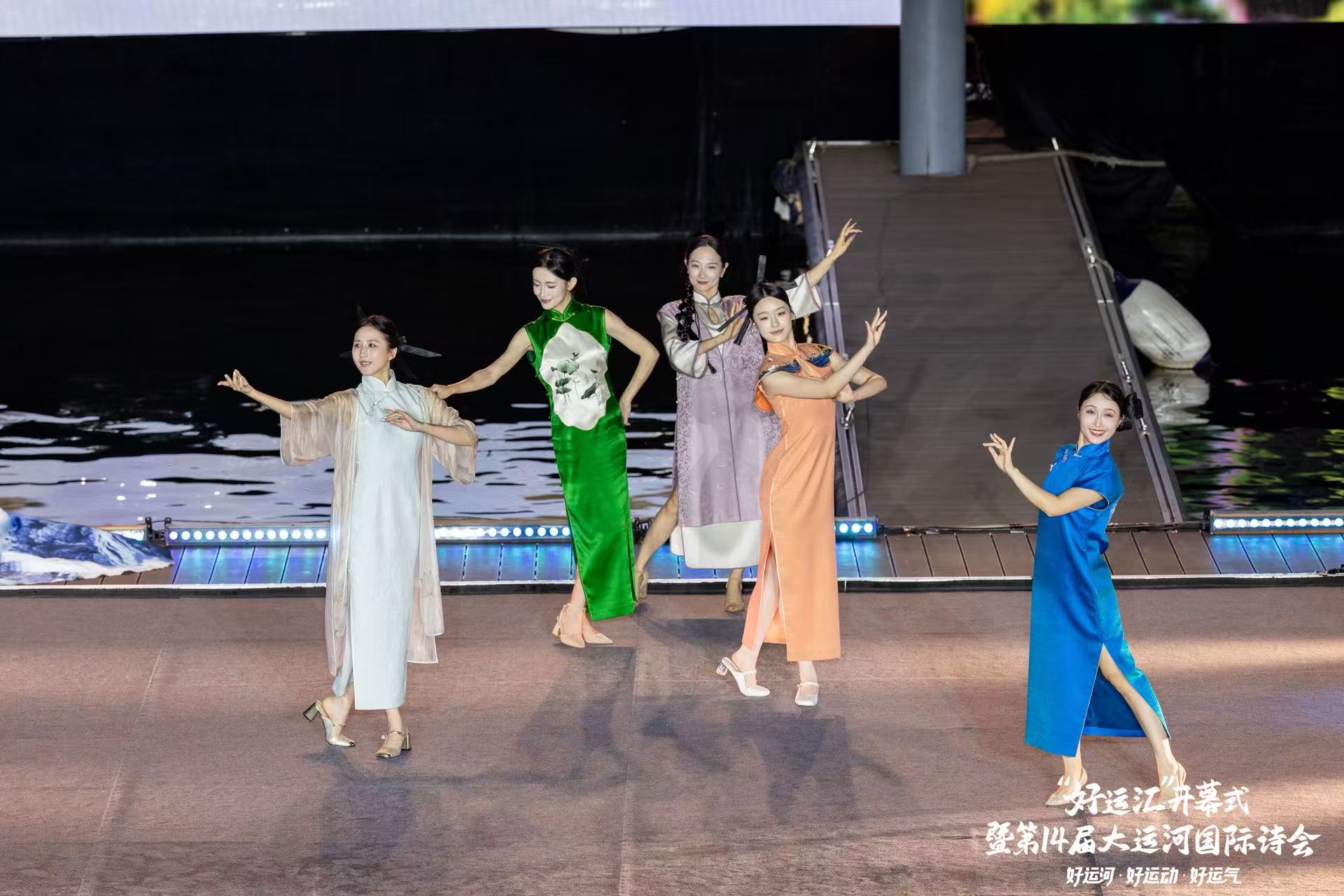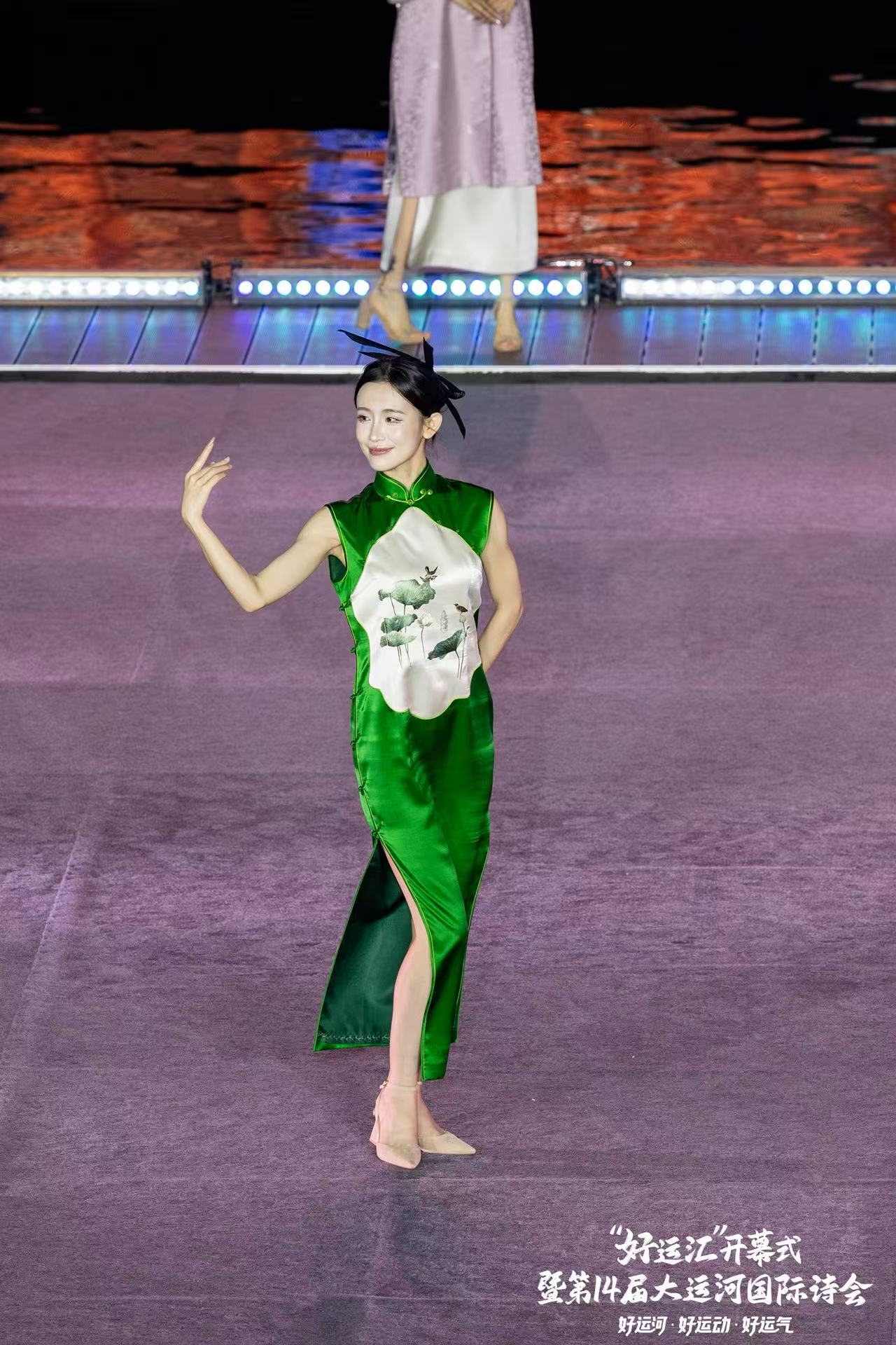 西湖区西子女红文化特派员唐红英,很荣幸今天被受邀参与了杭州电视台西湖明珠频道“好运汇”开幕式暨第14届大运河国际诗会。 霓虹与烟火交织,让文商旅体展融合的世遗之城分外夺目。西子女红携“丝路新语”、“碧荷印月”、“一衣带湖”、“烟雨人家”、“古韵霓裳”五件世界文化遗产定制系列旗袍登台,为大家呈现了精彩的诗歌服装秀《舟行运河》。