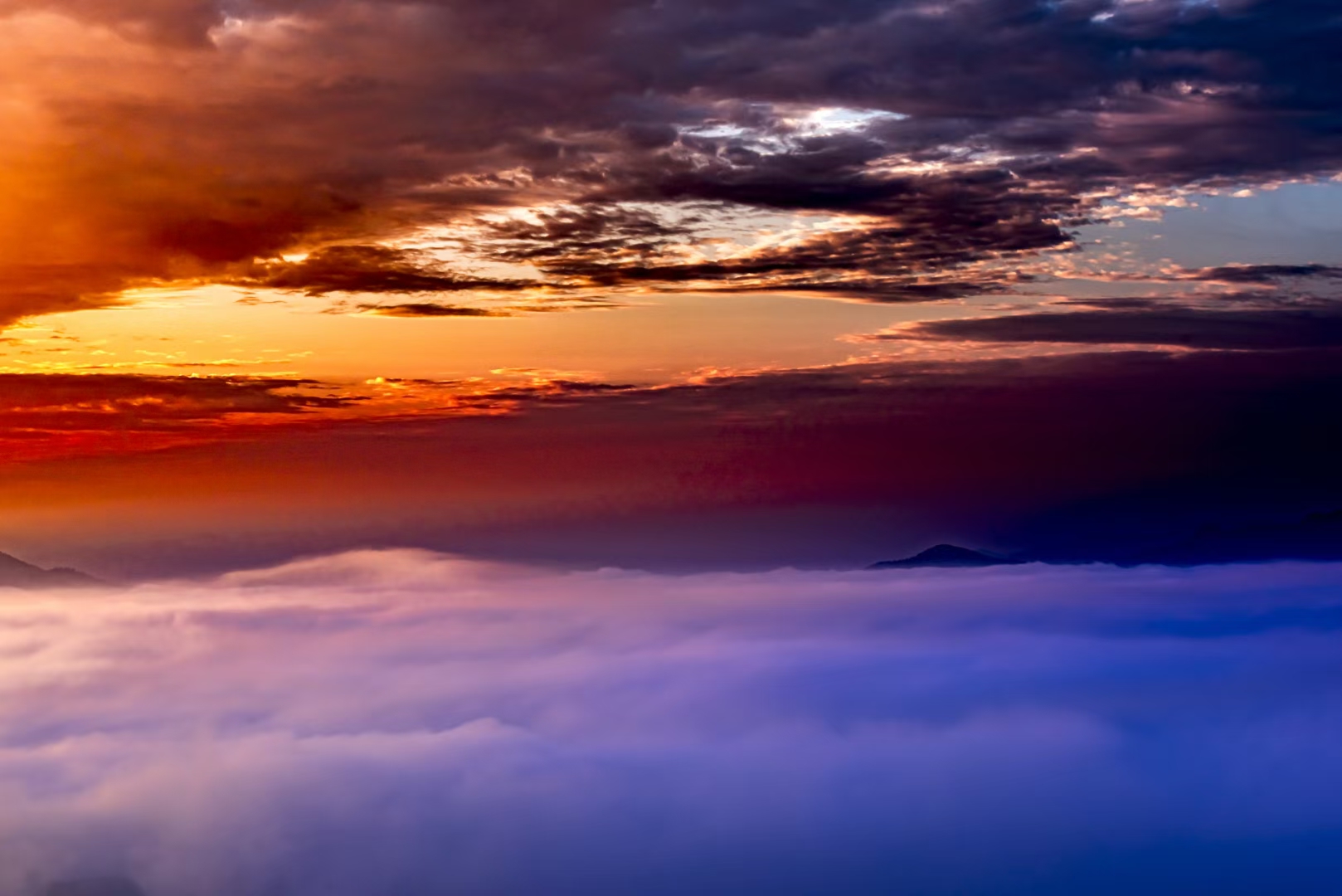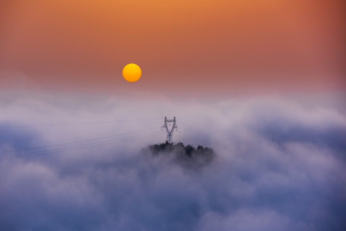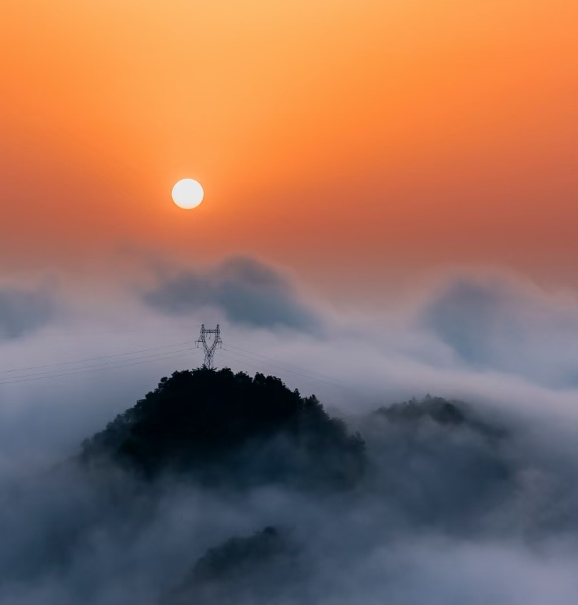 清晨登顶,遇见日出云海,高压电塔穿云而过,山峰在橙色天空下更显壮丽。紫色云层与霞光交织,自然景观如梦如幻。高空视角下,一切宁静而绚丽,薄雾笼罩,宛如仙境。
