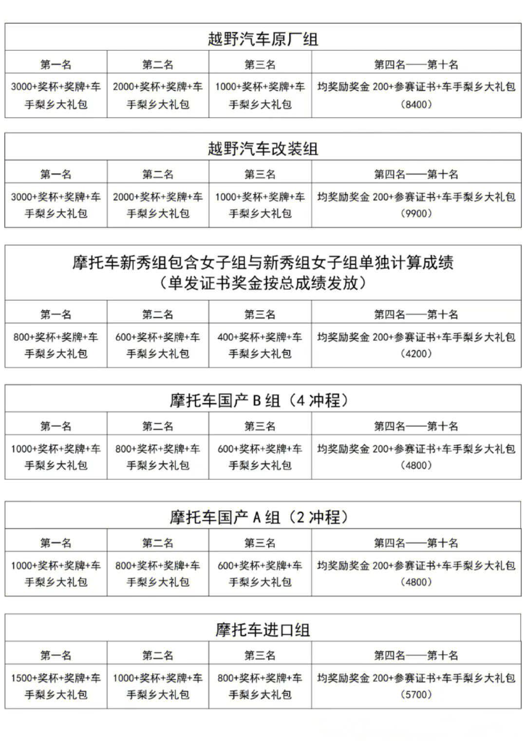 2025年第十五届齐鲁赛车英雄会邀您参赛 2025年第十五届齐鲁赛车英雄会·莱阳站暨莱阳汽摩越野嘉年华活动,定于2025年7月19日-20日,在莱阳市吕格庄镇大野头村樱桃市场举办。欢迎摩托车爱好者报名参赛! 活动指导单位为山东省汽车摩托运动联合会,山东广播电视台广播交通频道为主办单位,莱阳市青年联盟承办,莱阳市融媒体中心、莱阳市大野头红满山大樱桃专业合作社、莱阳鲁花矿泉水有限公司、莱阳市丽都山庄酒店等单位协办。 项目设置:汽车越野赛、摩托车拉力赛。 组别设置:汽车越野赛分为:专业组、公开组,各组不限排量。 摩托车拉力赛分为:新秀组国产A组、国产B组、进口组A组、进口B组。 赛程安排: 1、7月18日:裁判员报到、赛前培训; 2、7月19日:开幕式、预赛、排位赛; 3、7月20日:决赛、颁奖仪式。