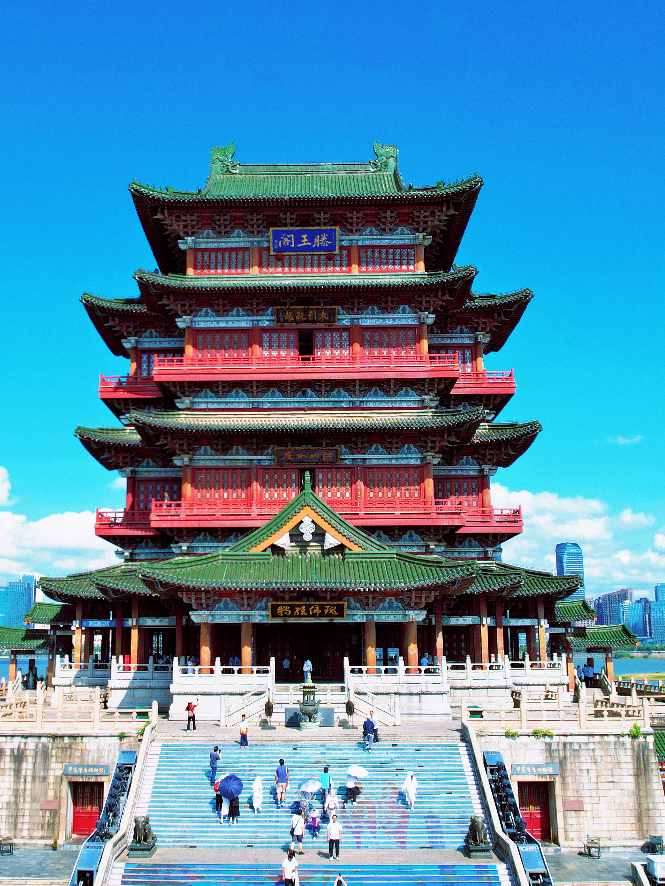 滕王阁的故事,是青石阶上王勃的足音,是灯笼墙下稚童的诵读,是汉服少女旋转的裙摆,更是白糖糕摊前升腾的热气。 当千年名阁遇见城市烟火,跟我一起来解锁滕王阁的玩法吧。 2025年初完成了一场“破壁革命”:“三还工程”(还江于民、还岸于民、还景于民),北扩后的滕王阁将700亩空间90%免费开放。曾经绕行几公里才能触摸的赣江水,如今从城市街巷可直接漫步至江畔,朱红廊柱下晨练的老人、汉服少女翩跹的裙角与滔滔江水,终于融为一体。 免费开放区才是隐藏的宝藏: 👉北园滨江步道:288米长的《滕王阁序》灯笼长墙在夜幕中蜿蜒如星河,汉白玉栏杆雕刻“豫章十景”,与八一大桥的车流光轨交织成古今对话的画卷。 👉大士院天桥连廊:走过空中连廊直达复古改造的大士院街区,1元1个的老南昌白糖糕在油锅中翻滚,市井烟火与历史名阁仅一步之遥。 登阁寻梦: 主阁是文化朝圣者不可错过的灵魂所在。登阁前不妨挑战“背诵《滕王阁序》免票”的彩蛋——13万人曾在此一气呵成773字骈文,换得一张穿越盛唐的通行证。 登阁秘籍: ✅一楼洪都厅:汉白玉浮雕《时来风送滕王阁》演绎着王勃乘风夜行七百里的神话。 ✅二楼人杰图:80余位江西历史名人的彩绘长廊,陶渊明、欧阳修凝望这片土地,恍见“物华天宝,人杰地灵”的注脚。 ✅五层观江台:苏轼手书《滕王阁序》真迹悬于厅中,而窗外赣江如练,正是“秋水共长天一色”的原点。 滕王阁是串联起南昌城的文旅脉络: 💟夜游赣江:从北园码头登船,看灯光秀将《滕王阁序》熔铸成江面流动的金色诗行。 💟万寿宫夜宴:与滕王阁联动的新商圈,瓦罐汤、拌粉的香气里藏着南昌的胃。 💟绳金塔祈福:老南昌民谣唱道:“藤断葫芦剪,塔圮豫章残”。这座千年古塔与滕王阁共筑城市文脉,求福灵验之地。 实用锦囊:让诗意照进现实 🎫免费政策**:90%区域免票(含北园、南园、滨江步道),主阁门票50元,背诵《滕王阁序》可免票。 📷黄金时段:清晨看江雾笼阁,黄昏赏落霞飞鹜,夜晚观灯光长卷。夏季建议17:00后入园避暑。 🚇交通指南:地铁1号线滕王阁站2号口出,步行5分钟即达北园;自驾可停大士院街区,穿天桥入景区。 滕王阁,这座曾历29次焚毁又重生的楼阁,如今以让景于民的胸怀重获新生——它不再仅是游客的打卡地,而是南昌人推开窗就能拥抱的诗意日常。