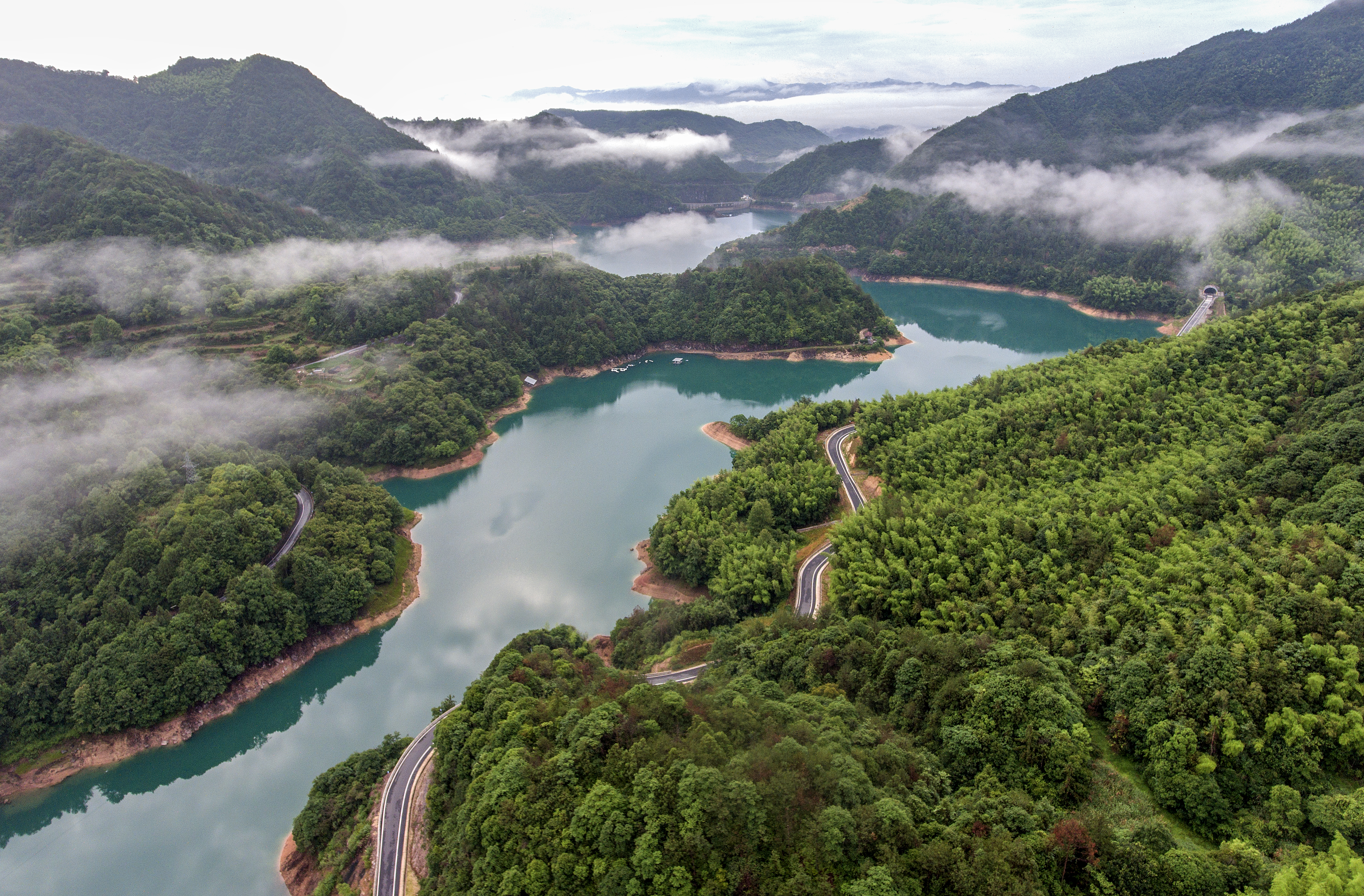 山水间,云雾绕,湖泊青山映碧空。蜿蜒通景路围绕水库,静谧湖面映山色。山林翠绿,湖光潋滟,每一帧皆自然之诗,生态和谐,美不胜收。行走其间,尽享清新,心归山林,悠享自然之馈赠。