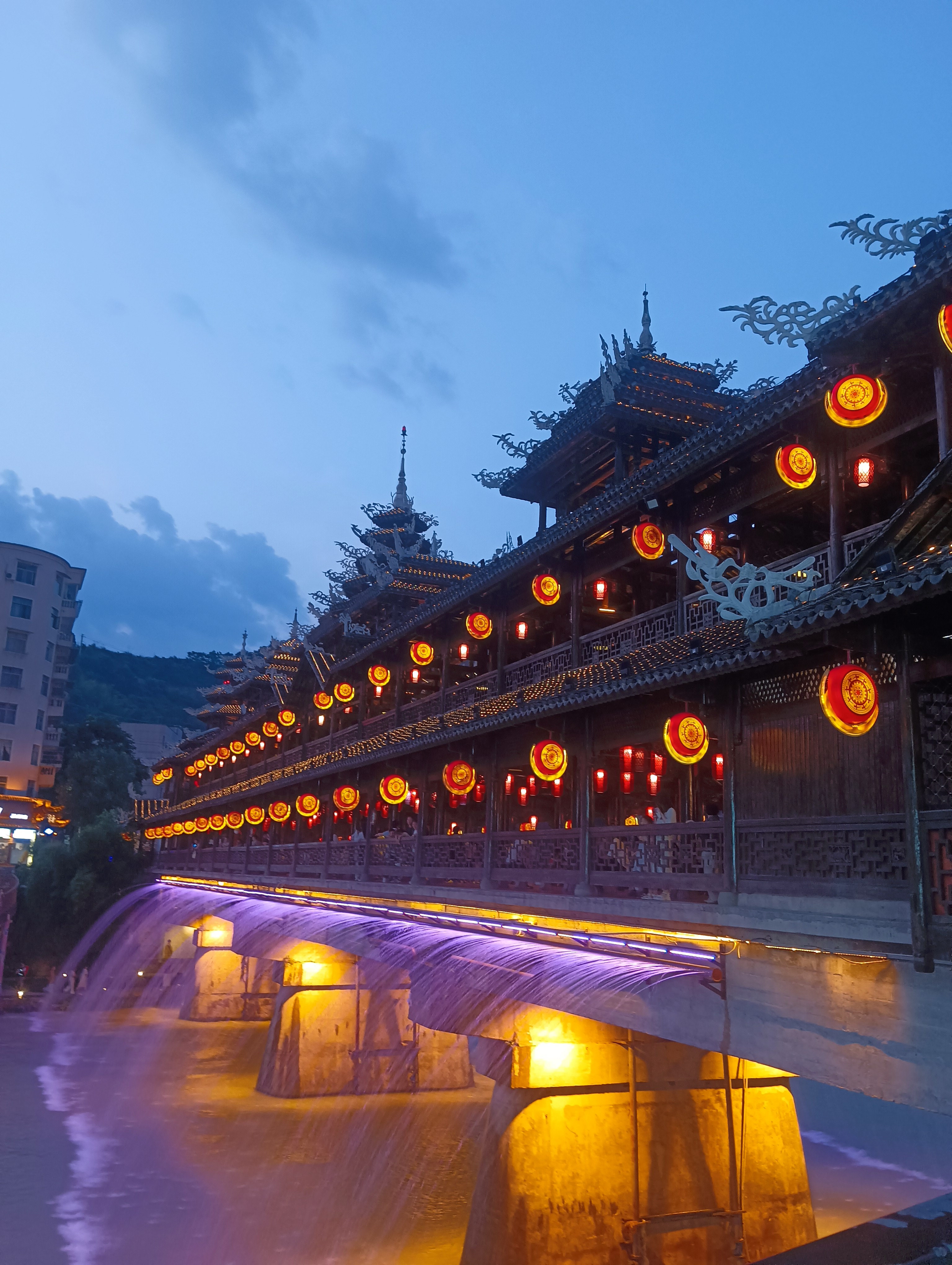 恩施的仙山贡水有着许多美丽的风景,文澜桥是我最喜欢的打卡点。图为文澜桥的日景与夜景。