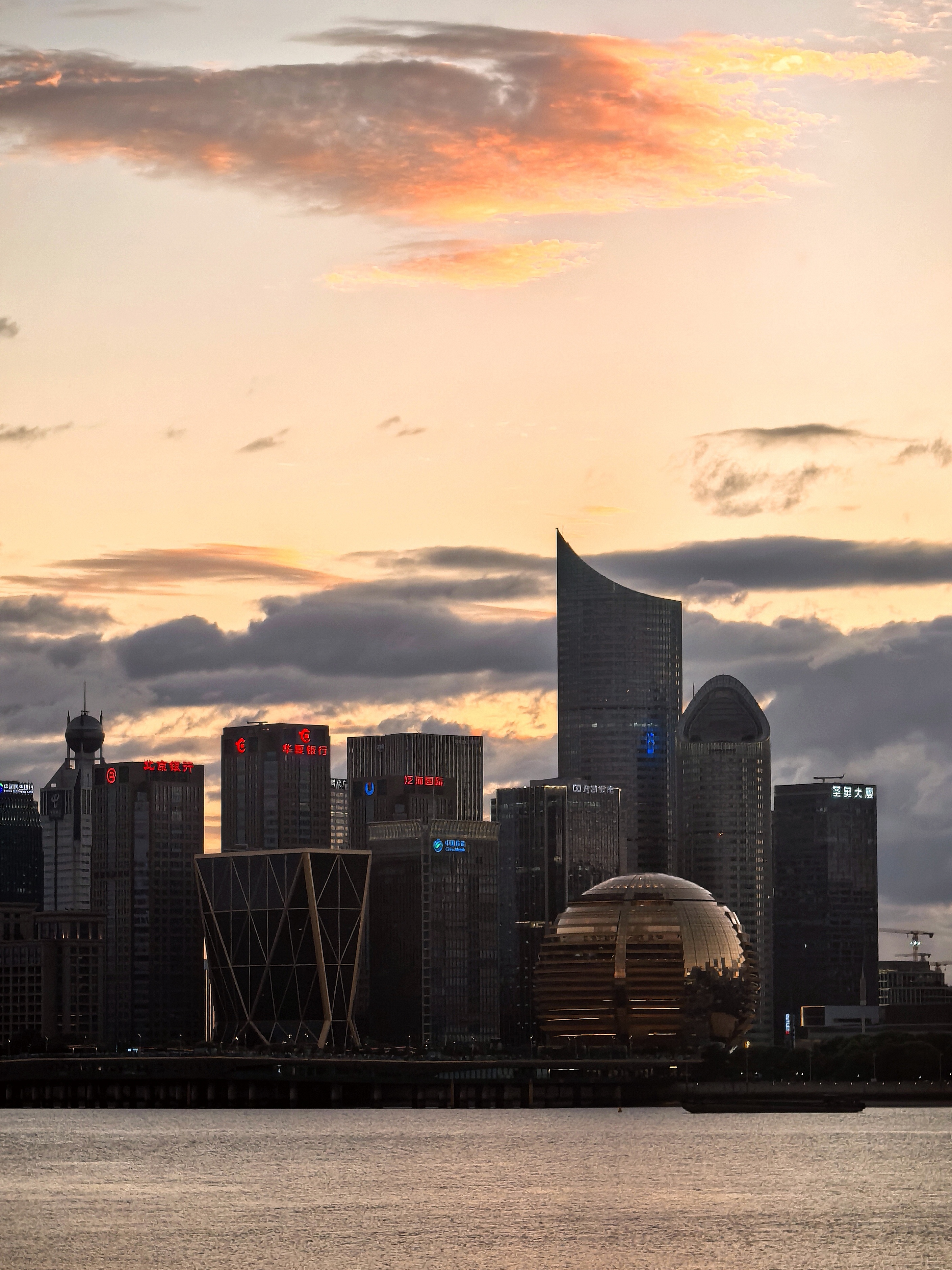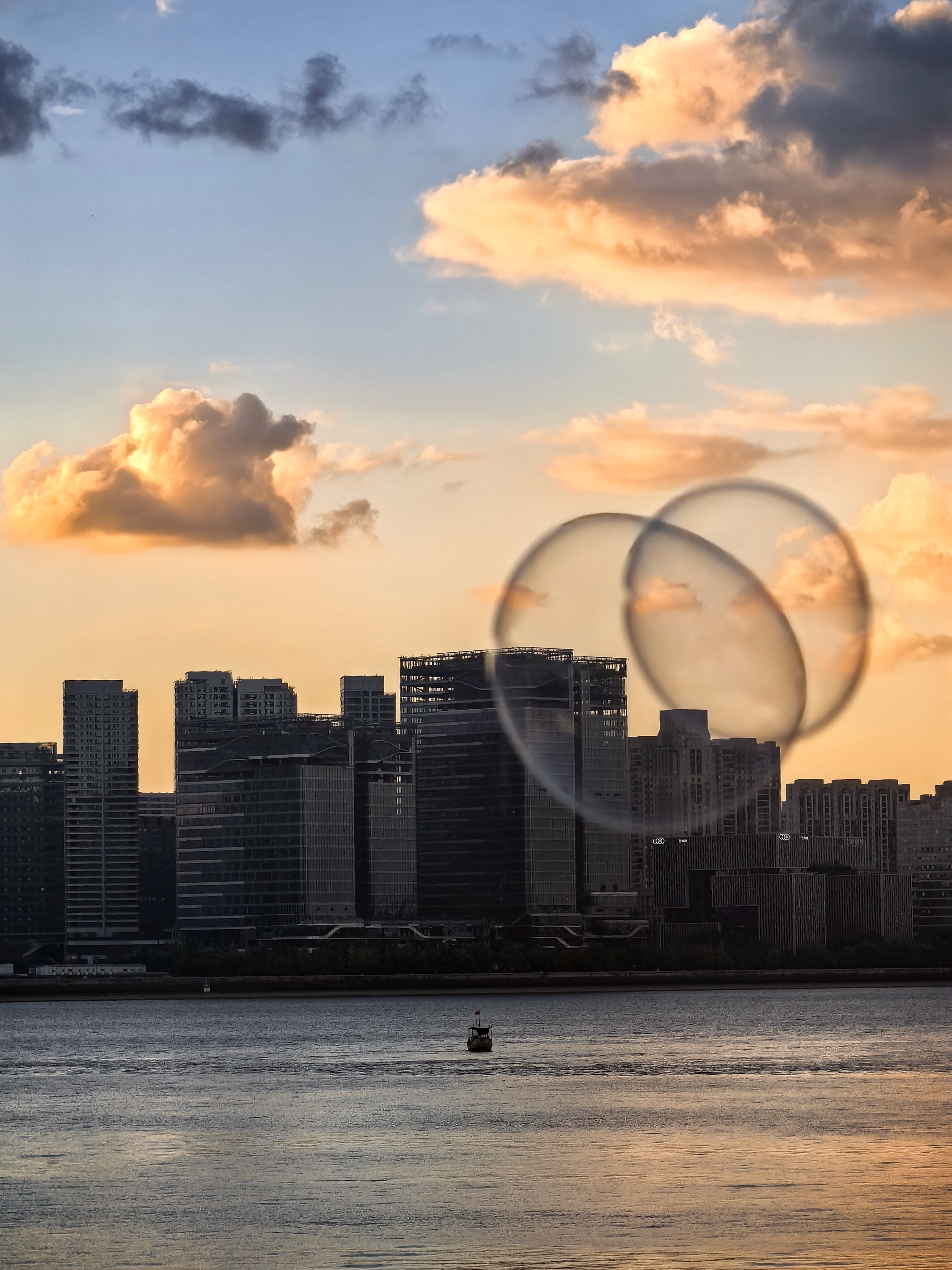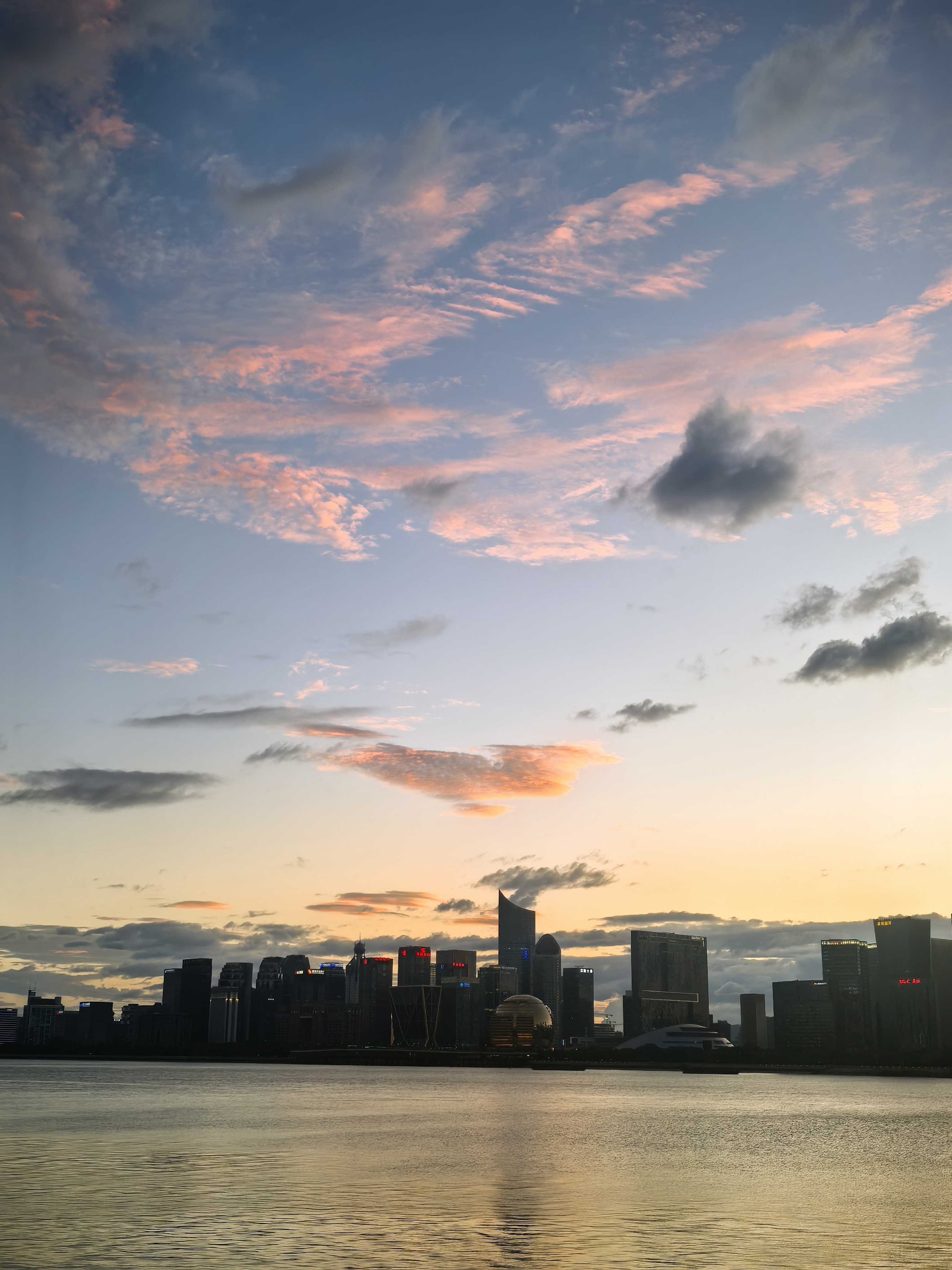 傍晚来到钱江世纪城的江岸,这里早已聚集了一长排人,大家的目光在钱江新城与南岸间流转。此刻的云霞,似被大自然这位神奇画师特别的勾勒,暗色云朵边缘,镶上璀璨金边,如梦似幻。落日的余晖将两岸的高楼大厦染成暖橙色,波光粼粼的江面也泛起层层金色涟漪。城市的喧嚣在这一刻被温柔抚平,只剩下落日与云霞的深情对话。