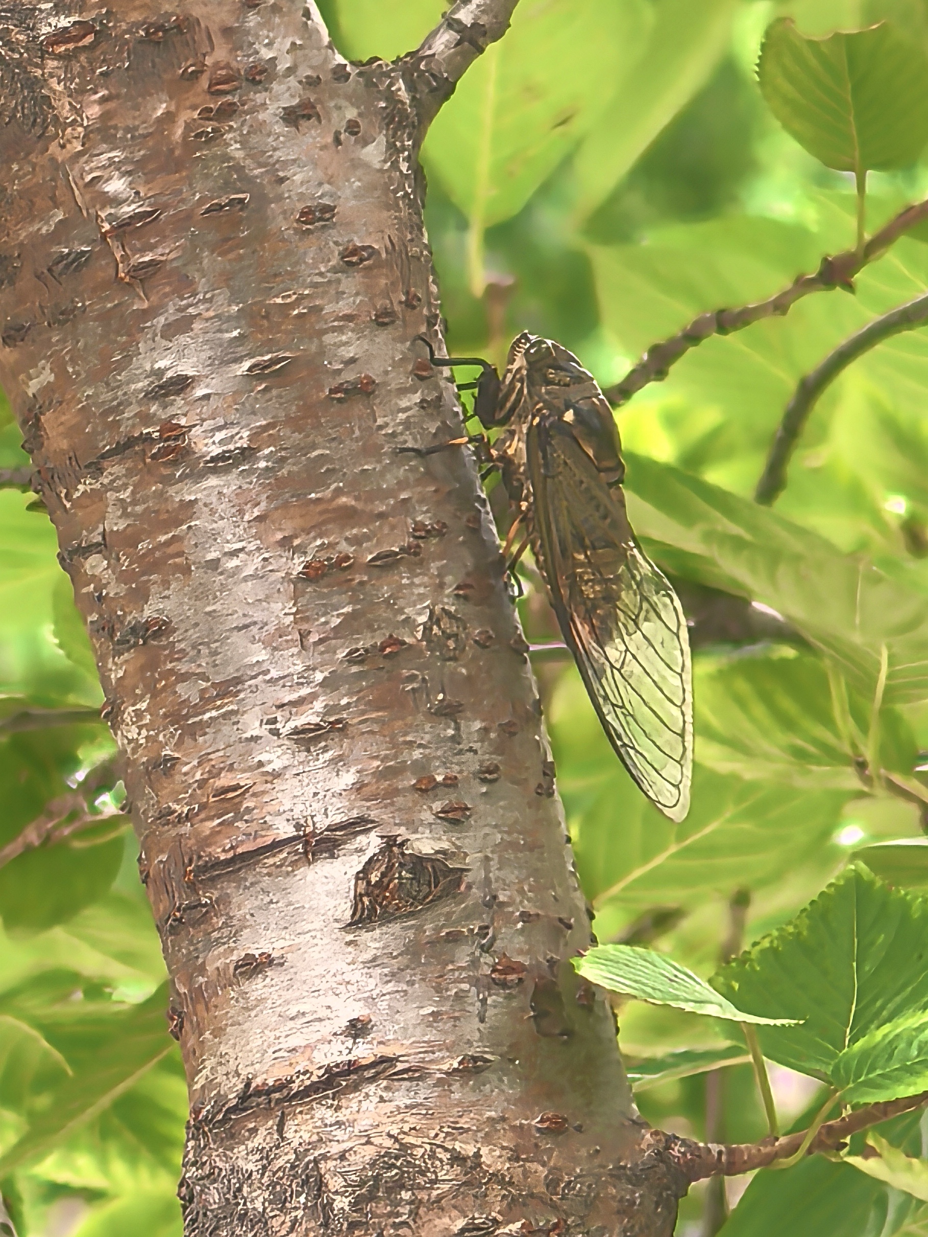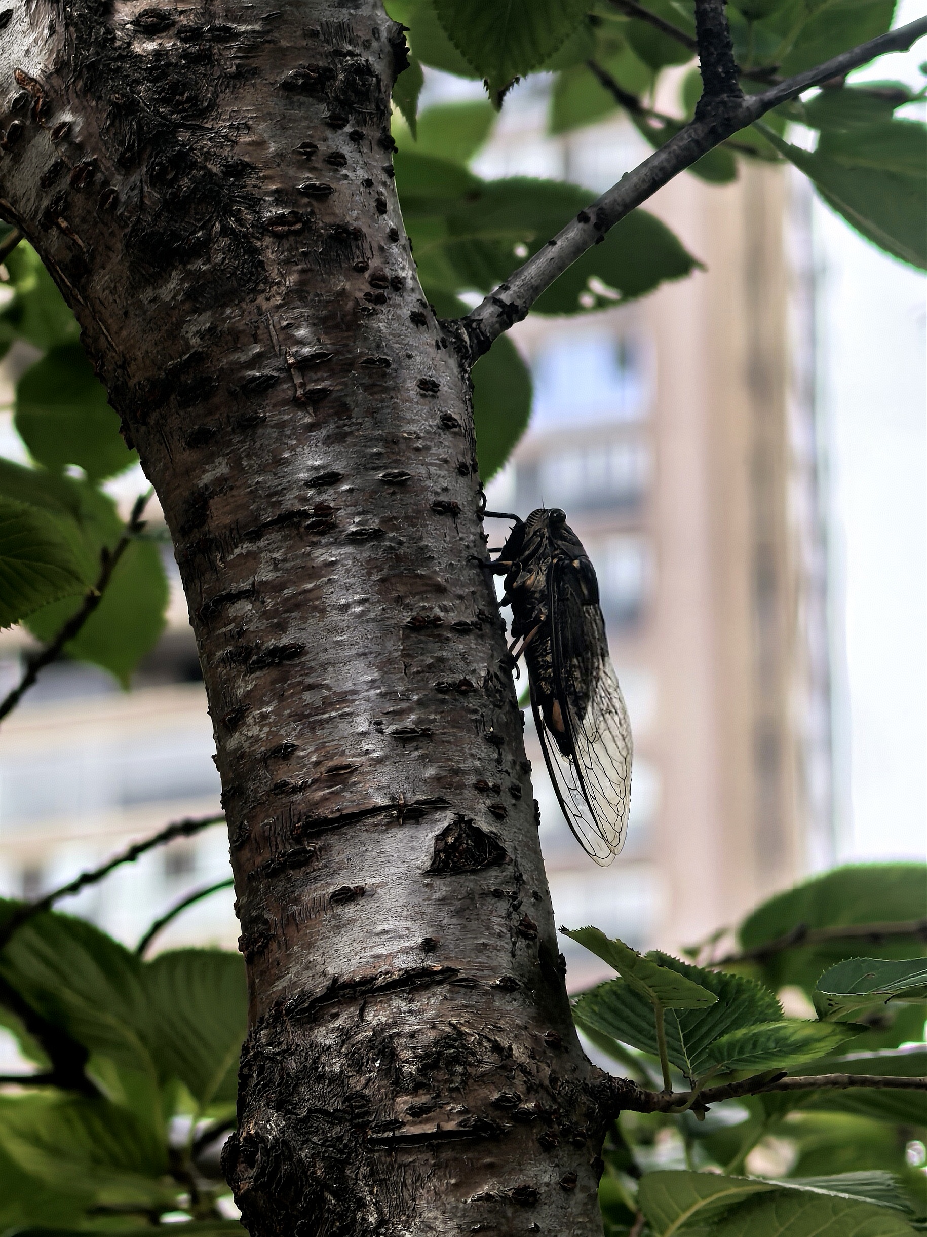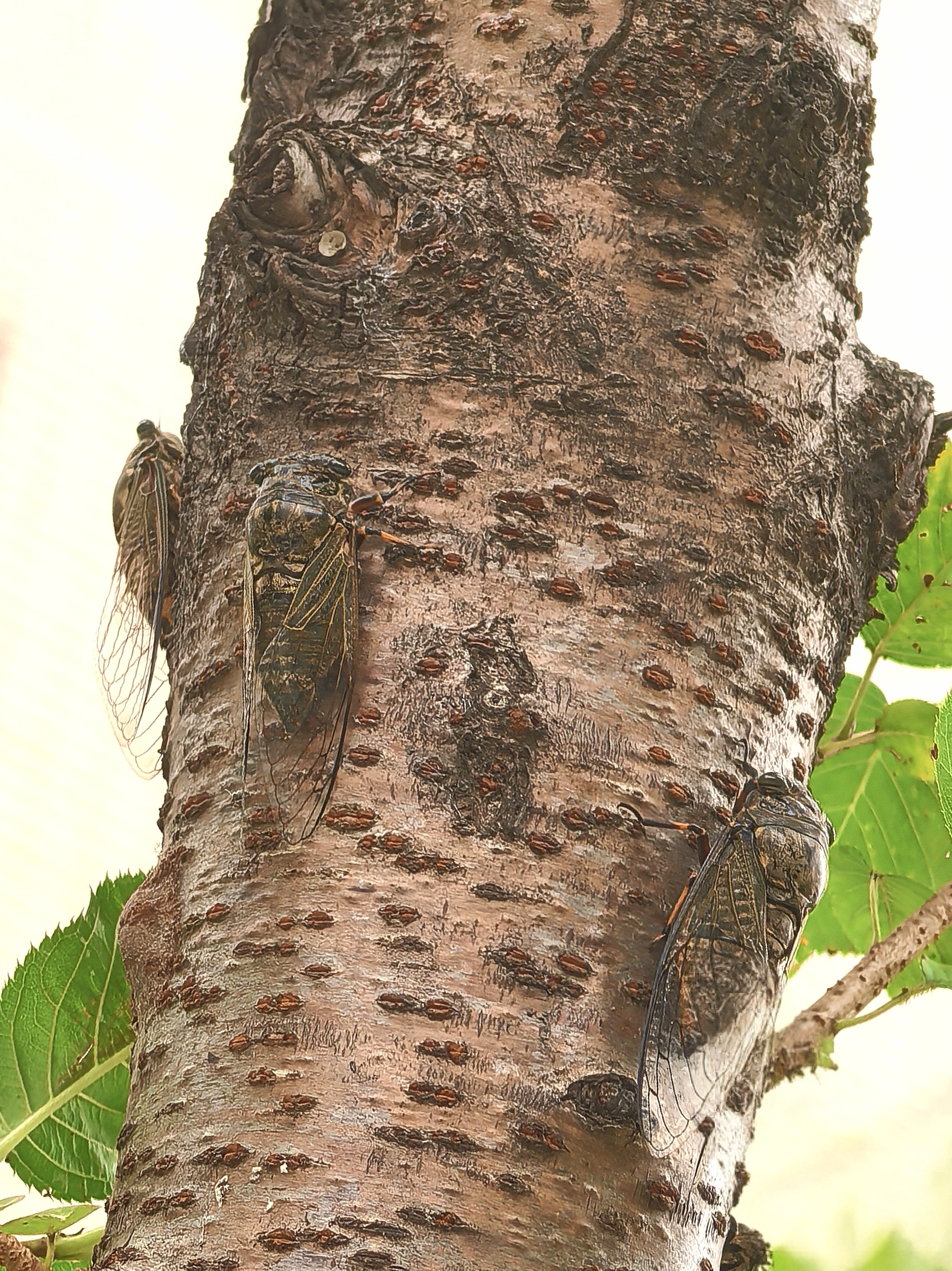 中午小区里知了声声,这声源听起来还很低矮,仔细打量,原来这是一株仅一人高的樱花树呀,知了们结队趴着上面,是樱花树的树汁好吃好闻吗?边上其他如红枫、玉兰等树上却一只也没有潜伏着的。 据了解,知了喜欢在杨树、柳树、槐树、榆树等阔叶树种上。这些树木的树皮较厚,适合知了幼虫在地下吸食树根的汁液,并在成虫阶段栖息。并且知了通常喜欢阳光充足、气温较高的环境。没想到,知了也因地制宜,即使没有槐树榆树,也学会了找能基本将就的树种过日子。 趴在树上的知了,待我凑过去给它们拍特写,居然表现很配合,一点也没有飞跑的意思。这是第一次近距离与小区的知了这么亲密。 风蝉旦夕鸣,伴叶送新声。今日是大暑,与往年处于中伏前后不同的是,今年的大暑处于初伏,并且时间也只有30天。 听着知了的叫声,不禁想起儿时午间冒酷暑去外面捉知了的情景。知了的叫声年年如此,没有什么变化,而当年的少年郎却鬓毛渐衰。