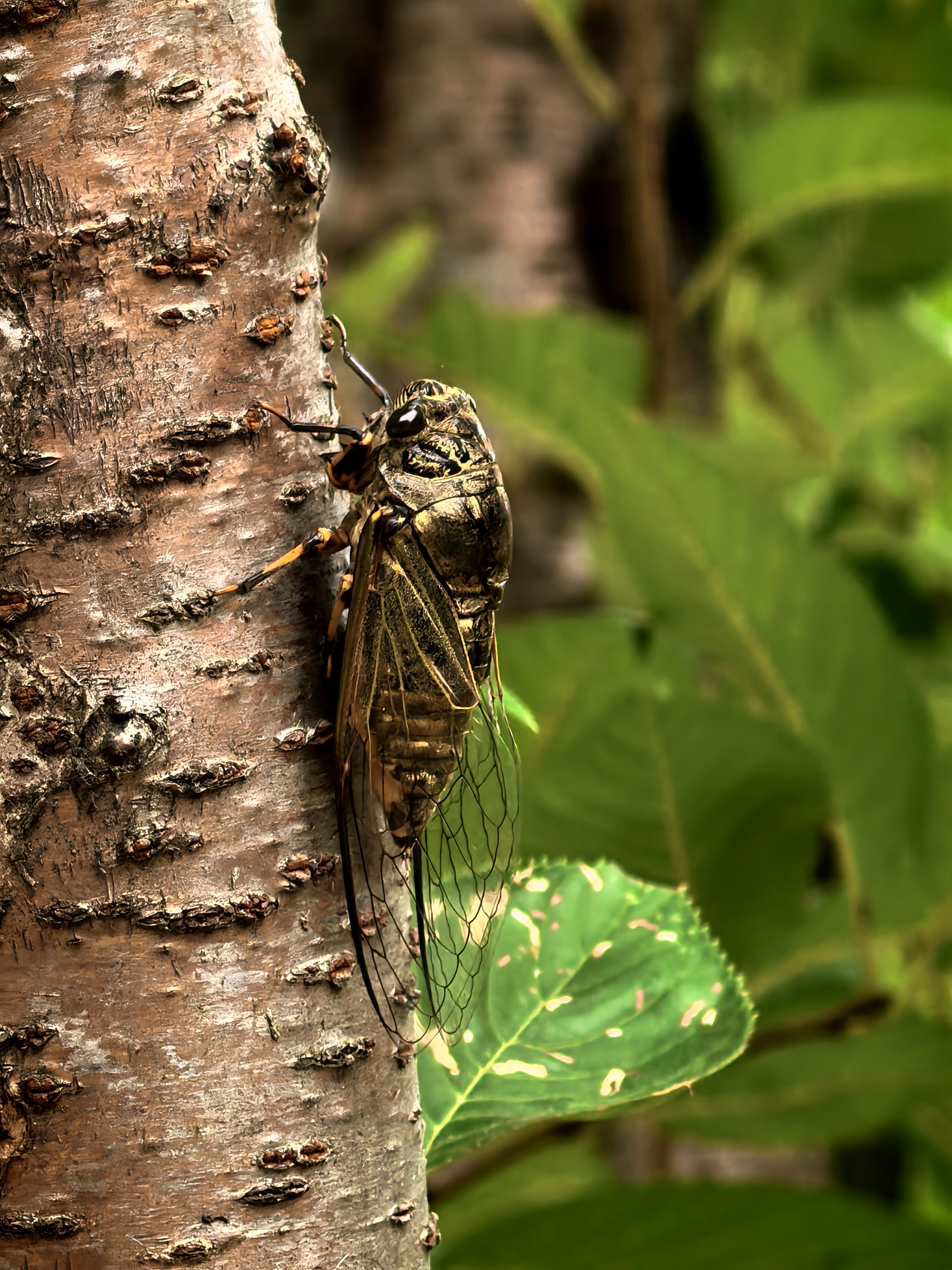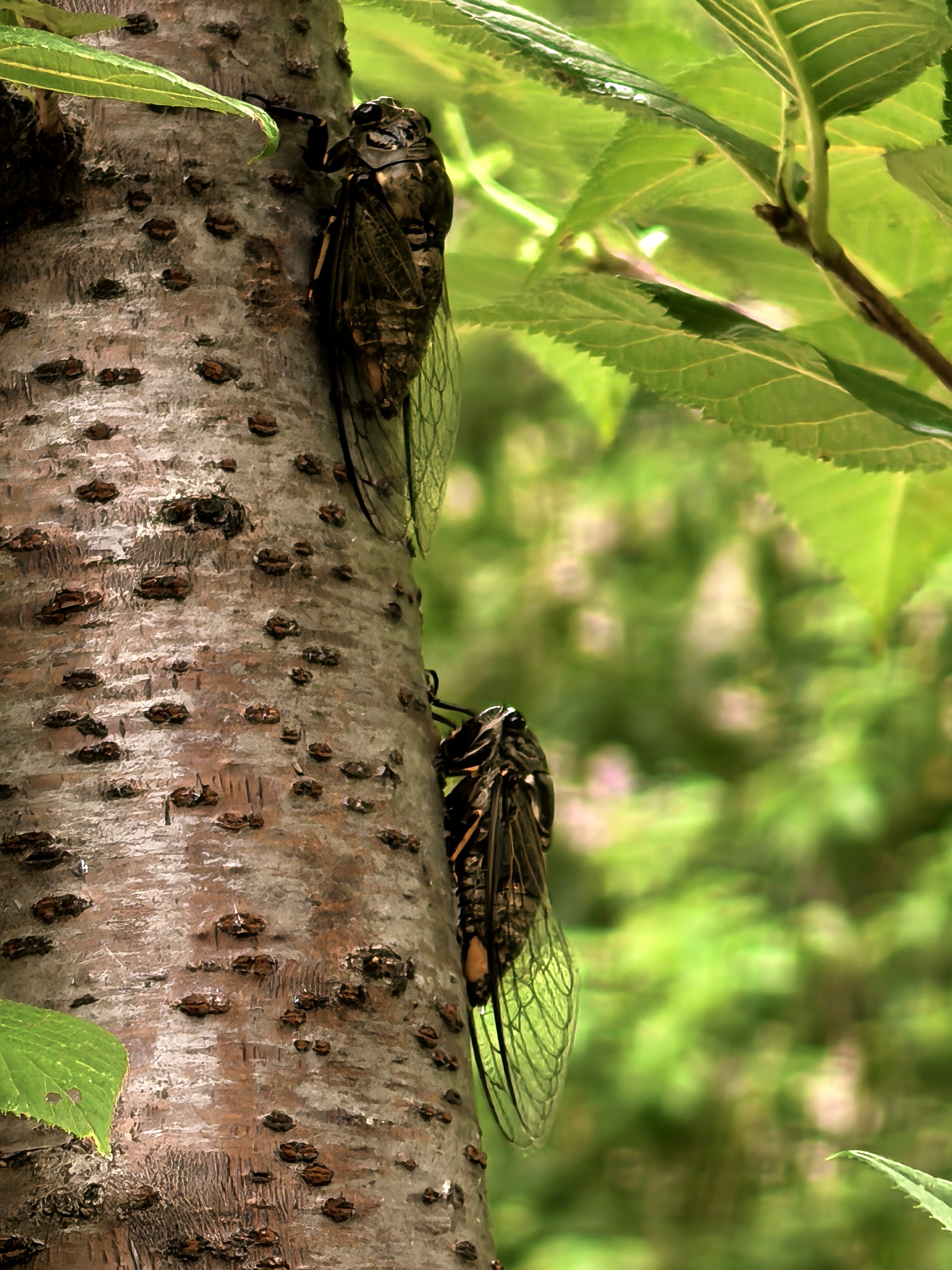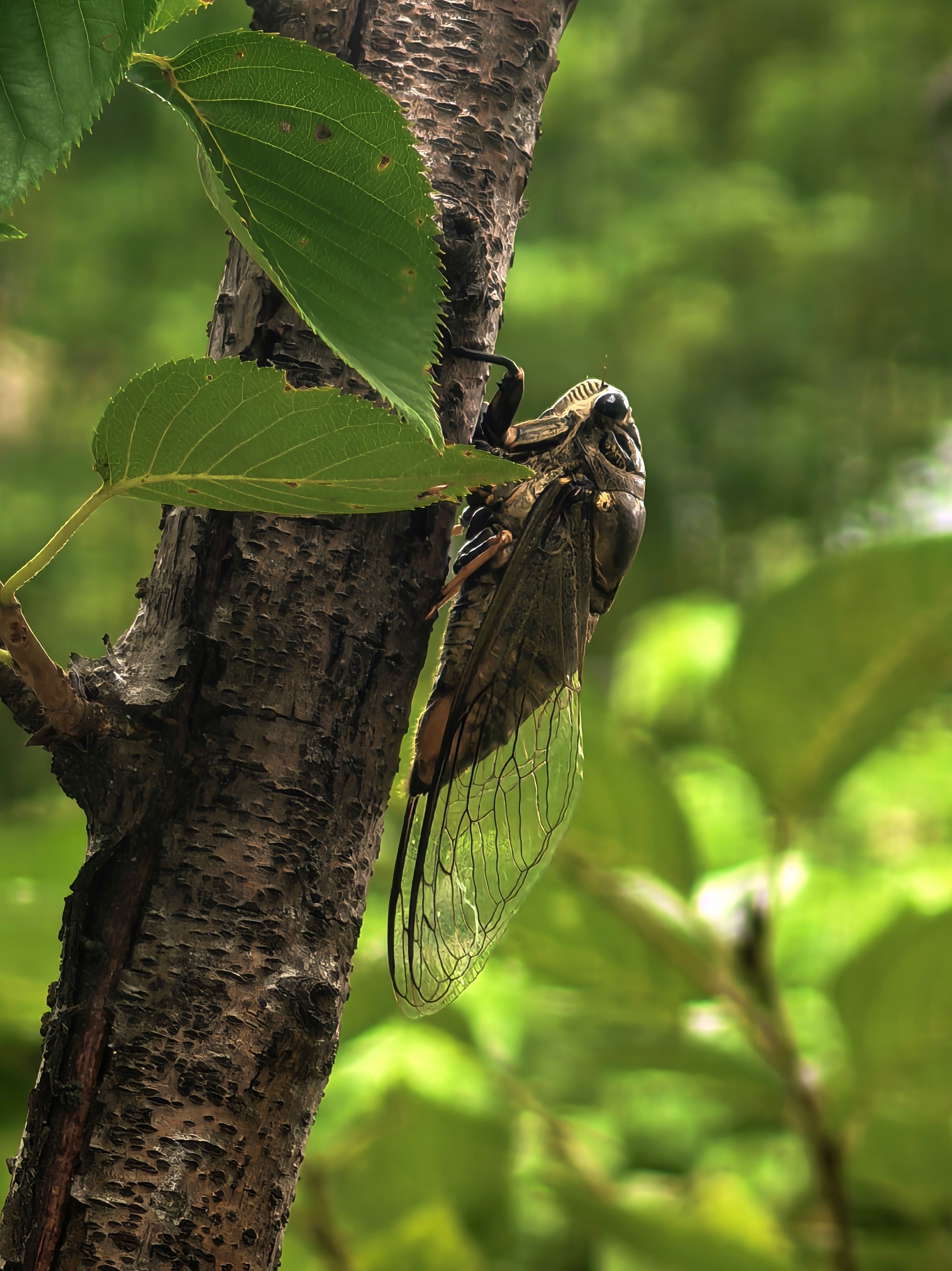 中午小区里知了声声,这声源听起来还很低矮,仔细打量,原来这是一株仅一人高的樱花树呀,知了们结队趴着上面,是樱花树的树汁好吃好闻吗?边上其他如红枫、玉兰等树上却一只也没有潜伏着的。 据了解,知了喜欢在杨树、柳树、槐树、榆树等阔叶树种上。这些树木的树皮较厚,适合知了幼虫在地下吸食树根的汁液,并在成虫阶段栖息。并且知了通常喜欢阳光充足、气温较高的环境。没想到,知了也因地制宜,即使没有槐树榆树,也学会了找能基本将就的树种过日子。 趴在树上的知了,待我凑过去给它们拍特写,居然表现很配合,一点也没有飞跑的意思。这是第一次近距离与小区的知了这么亲密。 风蝉旦夕鸣,伴叶送新声。今日是大暑,与往年处于中伏前后不同的是,今年的大暑处于初伏,并且时间也只有30天。 听着知了的叫声,不禁想起儿时午间冒酷暑去外面捉知了的情景。知了的叫声年年如此,没有什么变化,而当年的少年郎却鬓毛渐衰。