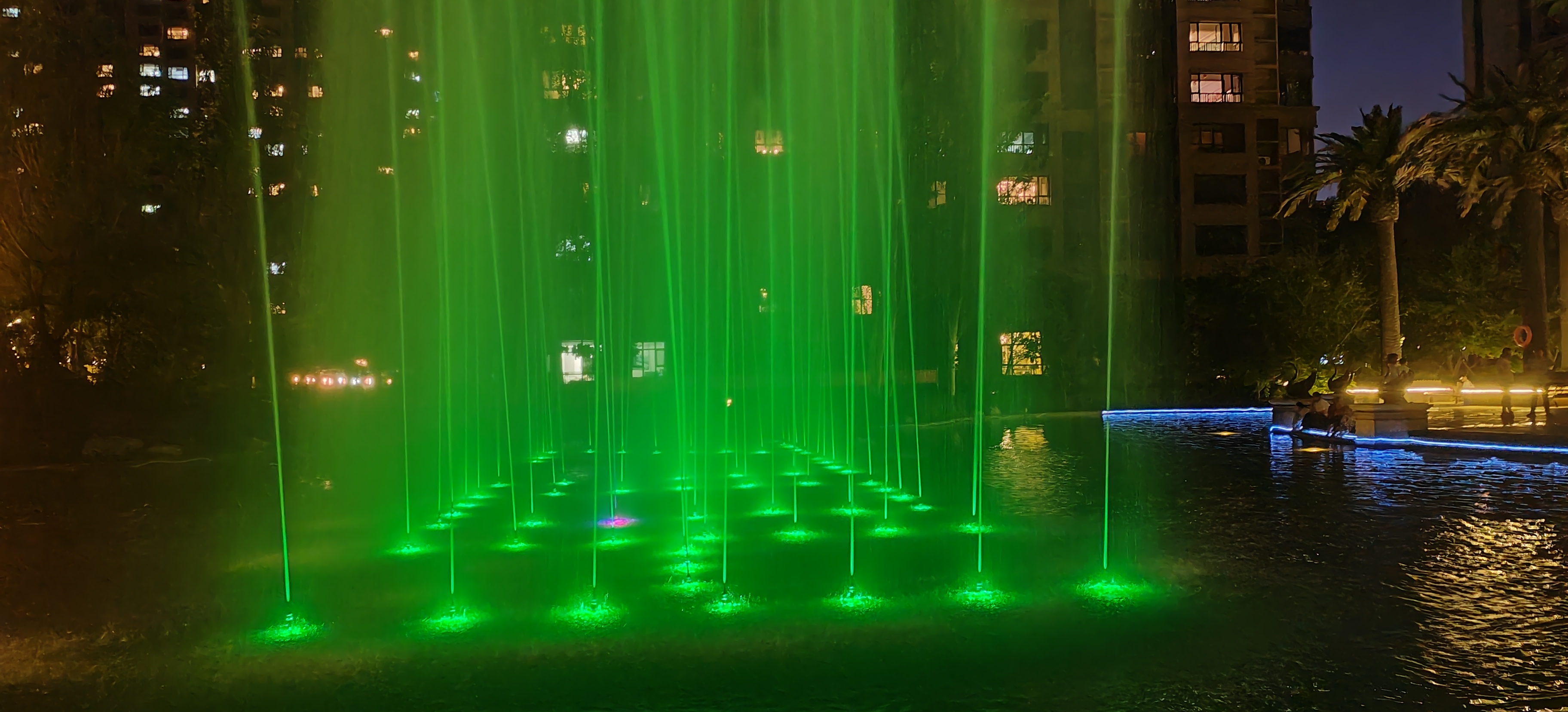 夜晚的城市,喷泉舞动绿色灯光,高楼映衬蓝色梦境。水面反射着现代建筑的璀璨,棕榈树轻摇,添一抹自然韵味。户外水景,夜间照明,尽显都市夜景迷人魅力。📸✨