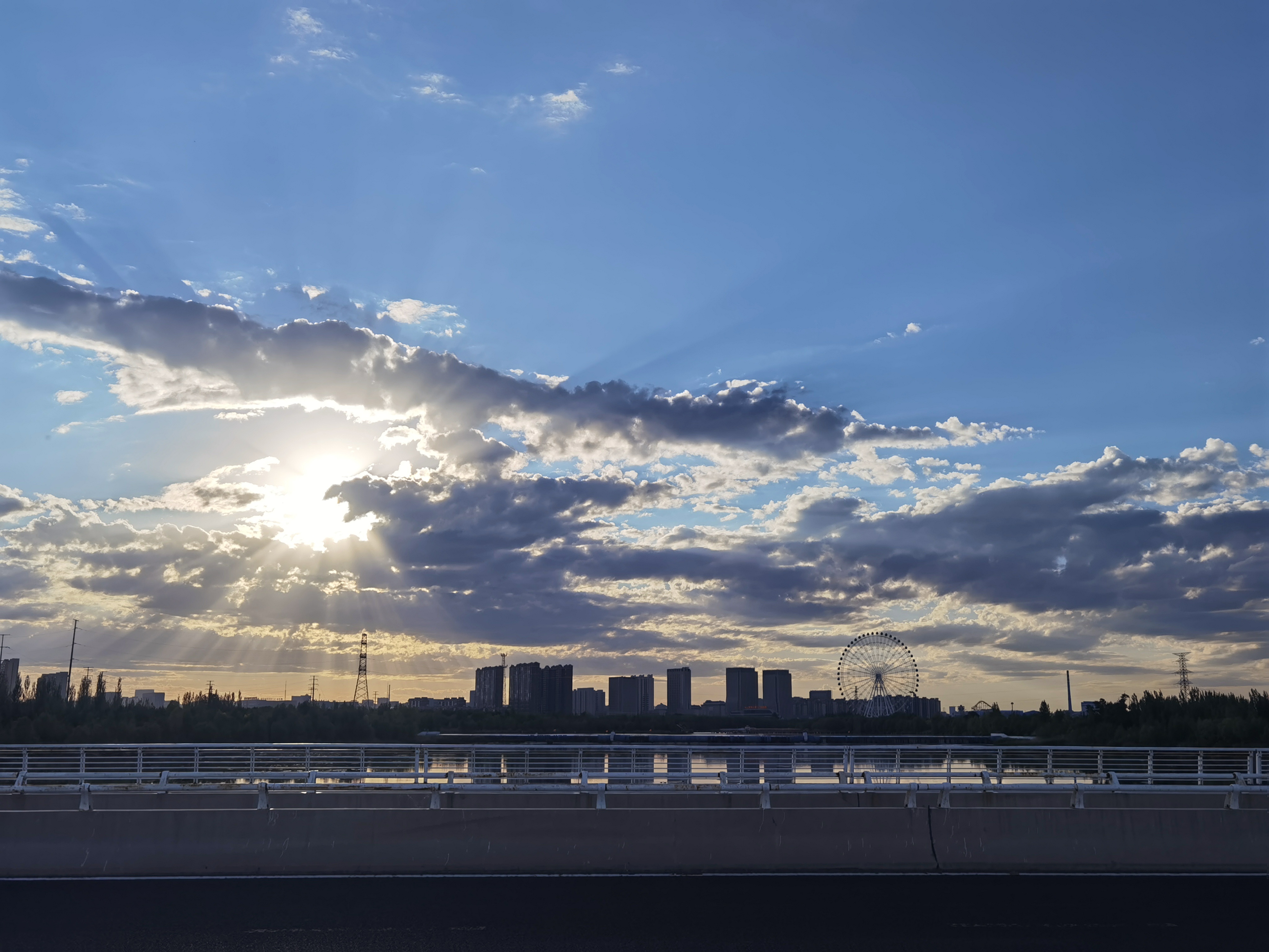城市黄昏 夕阳给云朵镶上金边,光丝穿透缝隙,洒在河面。对岸楼宇沉默,摩天轮静静伫立,城市在余晖里,卸去喧嚣,晕染出温柔的轮廓,连风都慢下来,拥抱这片刻宁静 。