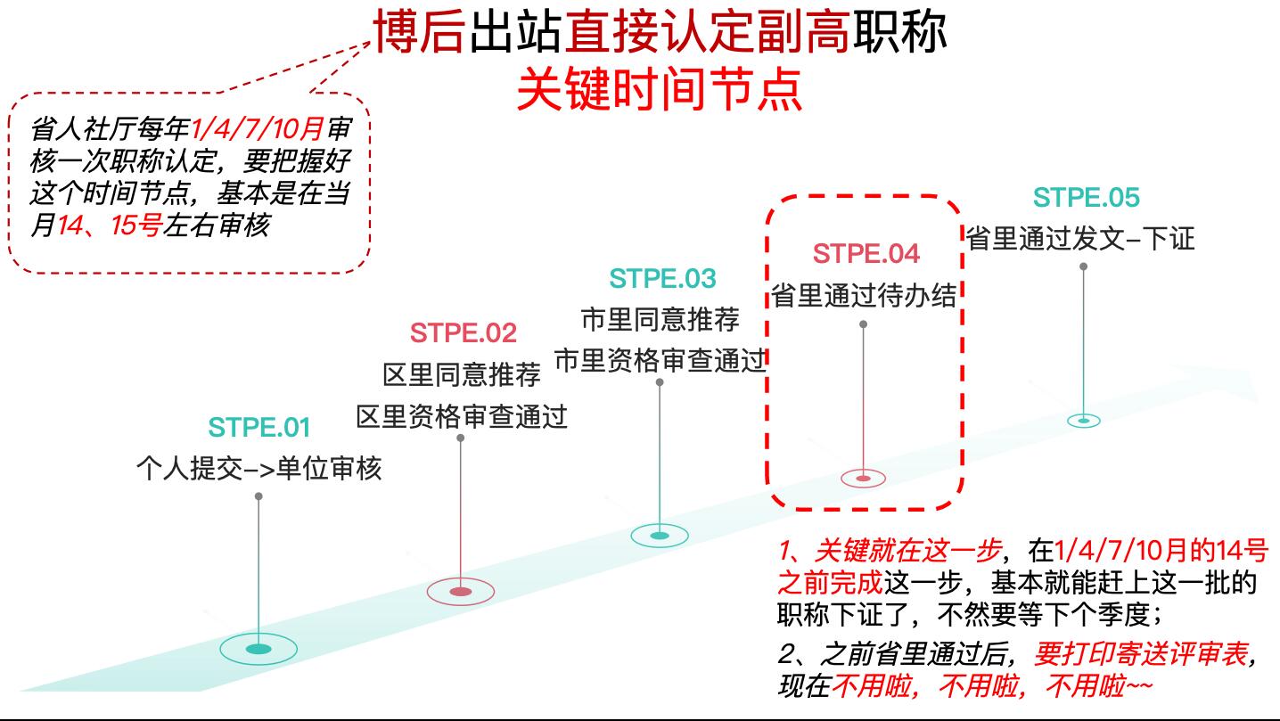 博后出站直接认定副高职称,如何2周搞定! 1.浙江省这边对于博后出站,如果去的单位没有自主认定职称权限,那么他就可以走直接认定副高职称的路径,非常方便; 2.但是这个认定的流程,有些人不太了解,经过群友的反馈,发现这个直接认定,省人社厅每年会集中评审4次,分别是在1/4/7/10月,每个月的14号左右,这是个关键时间节点 3.如果想赶在某个批次认定完成,就要确保这4个月的14号之前,让自己的申请流程走到省里-通过待办结的状态 4.具体的信息可以参考上图1-3,有新的信息也欢迎大家分享啊