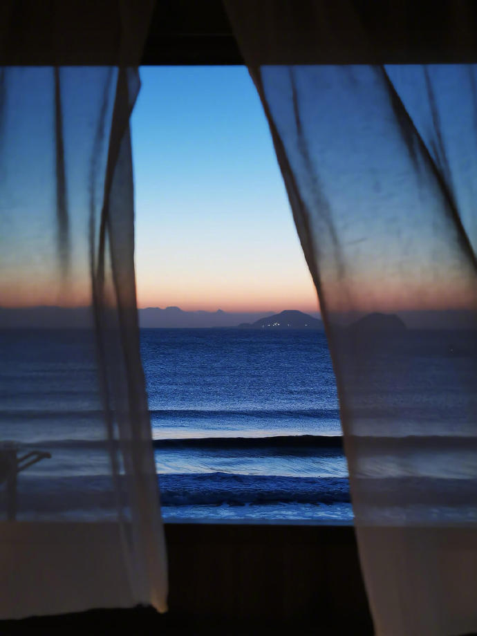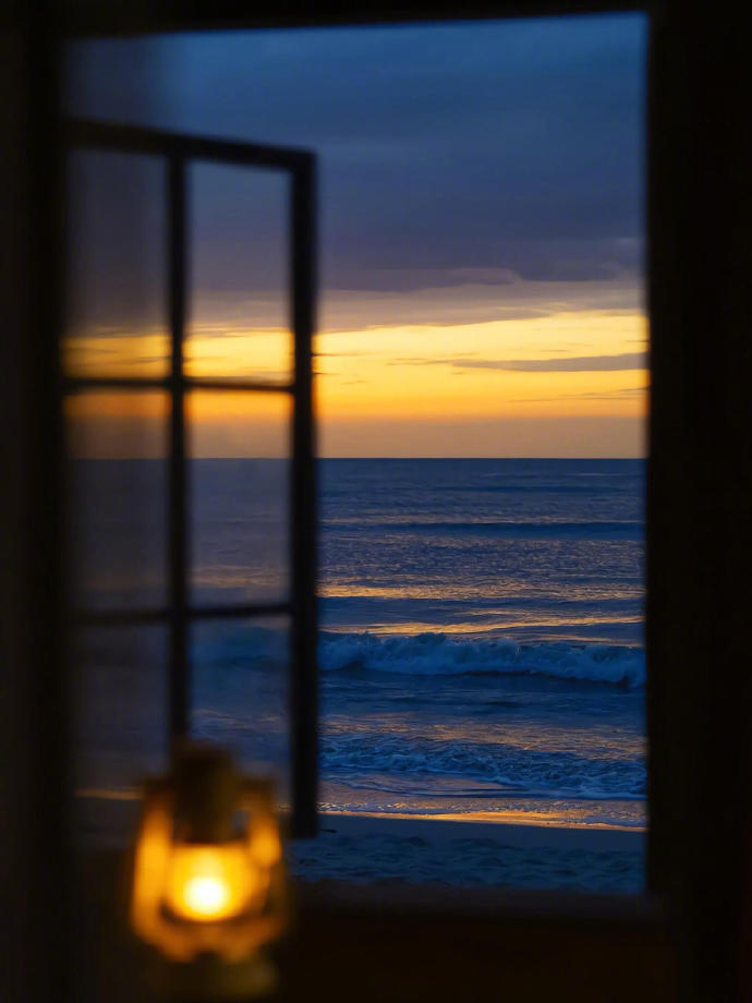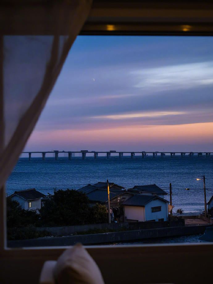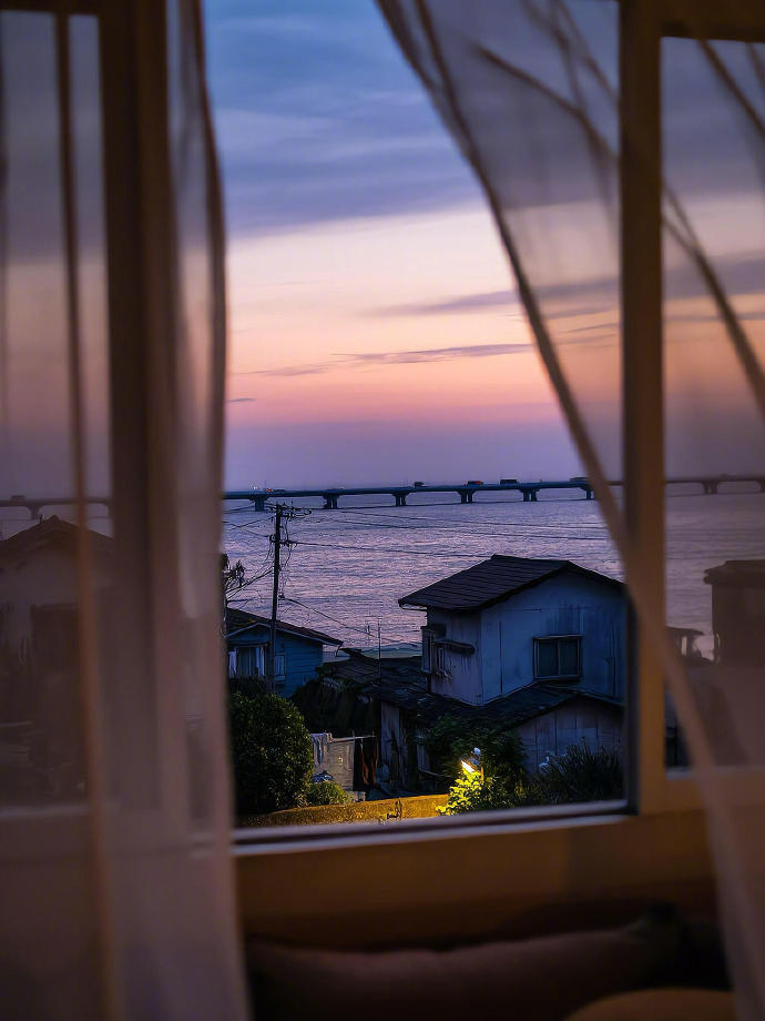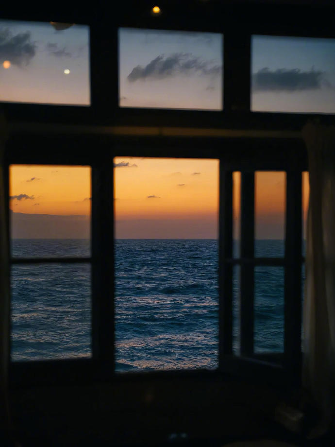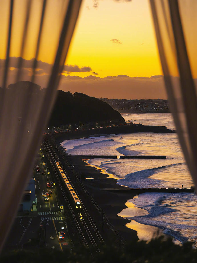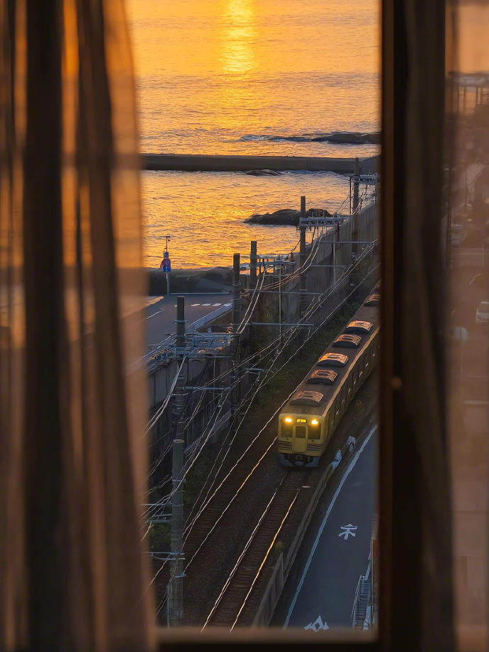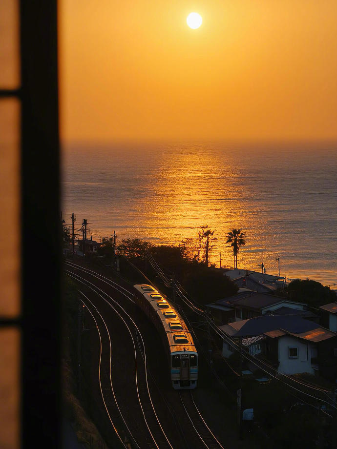 夏日,落日余晖洒海面,列车疾驰光影舞,皆是自然艺术。
