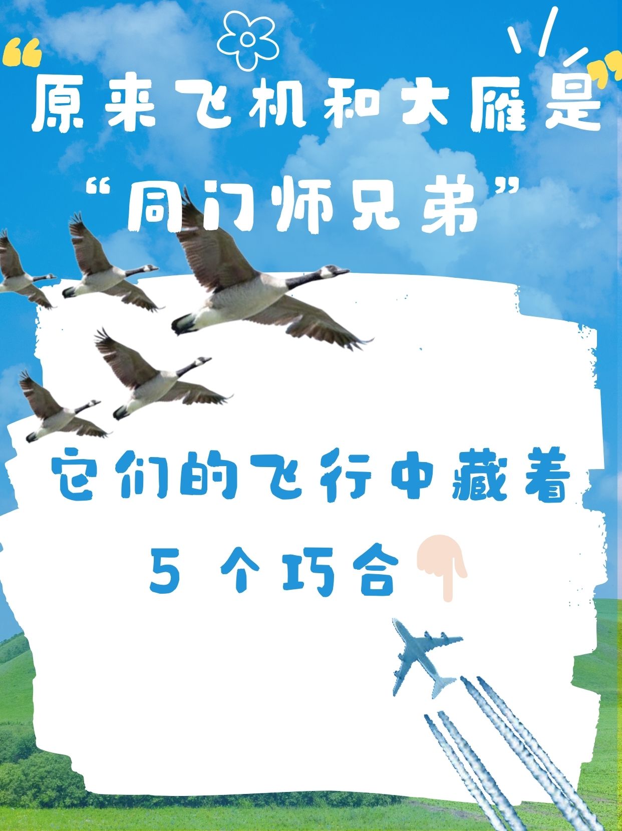 飞机和大雁 “梦幻联动” 啦✨ 当钢铁雄鹰邂逅迁徙精灵,5 个巧合暴露它们居然是飞行界 “同门师兄弟”! 想知道大雁编队和飞机航线怎么默契同步,天然导航与科技定位怎么隔空呼应?快跟着这些巧合,解锁天空隐藏的 “师徒密码” 🔍