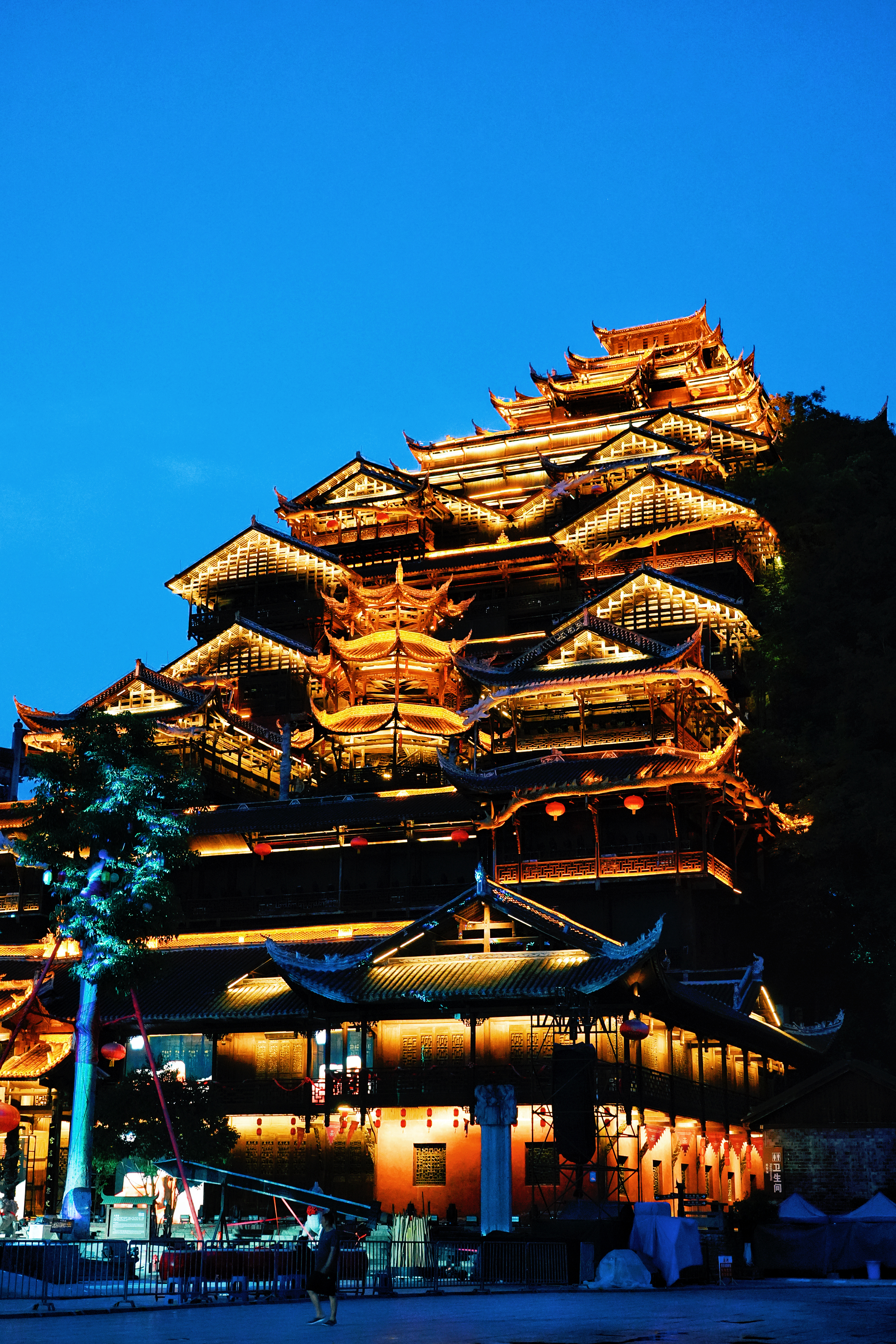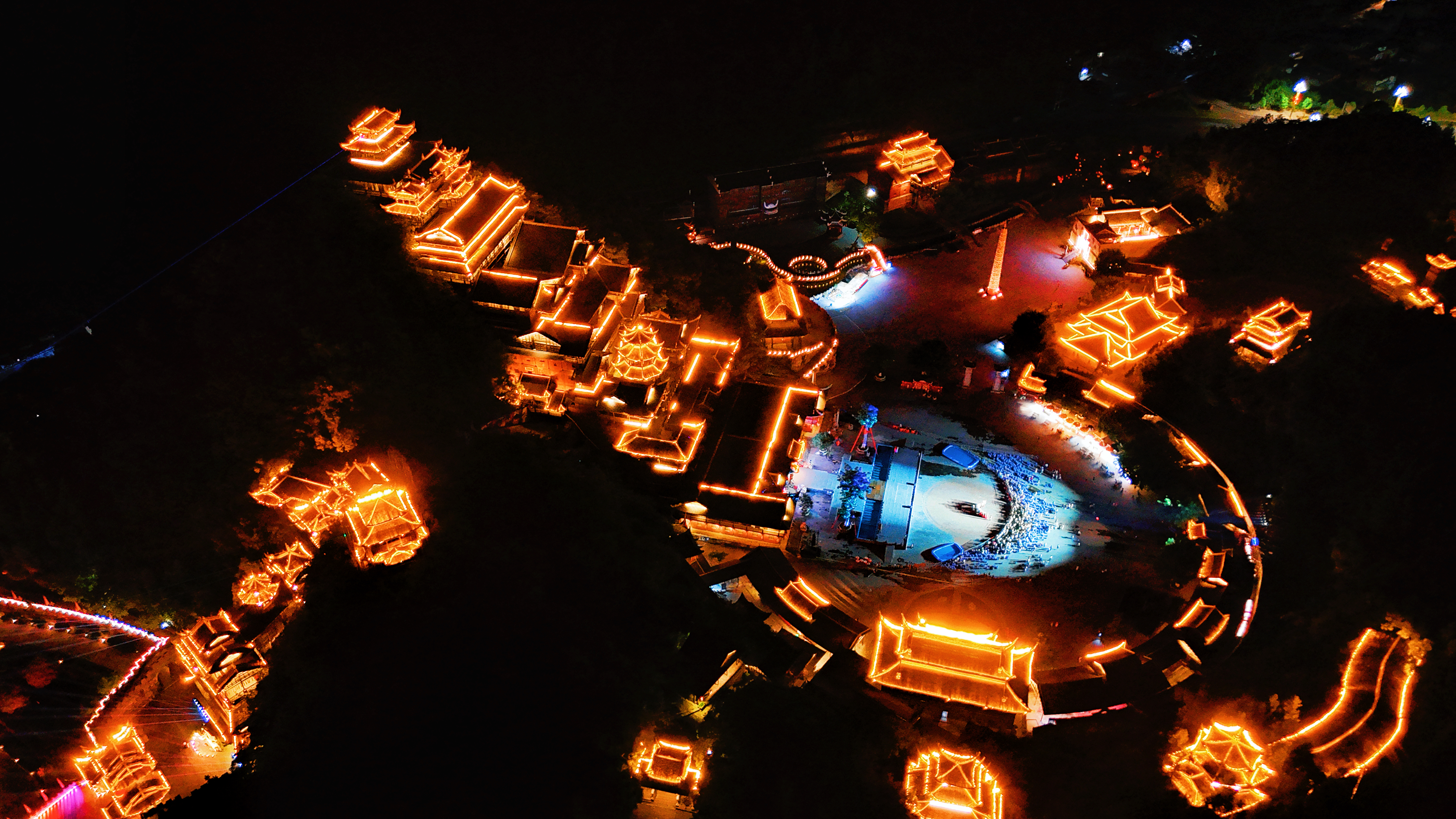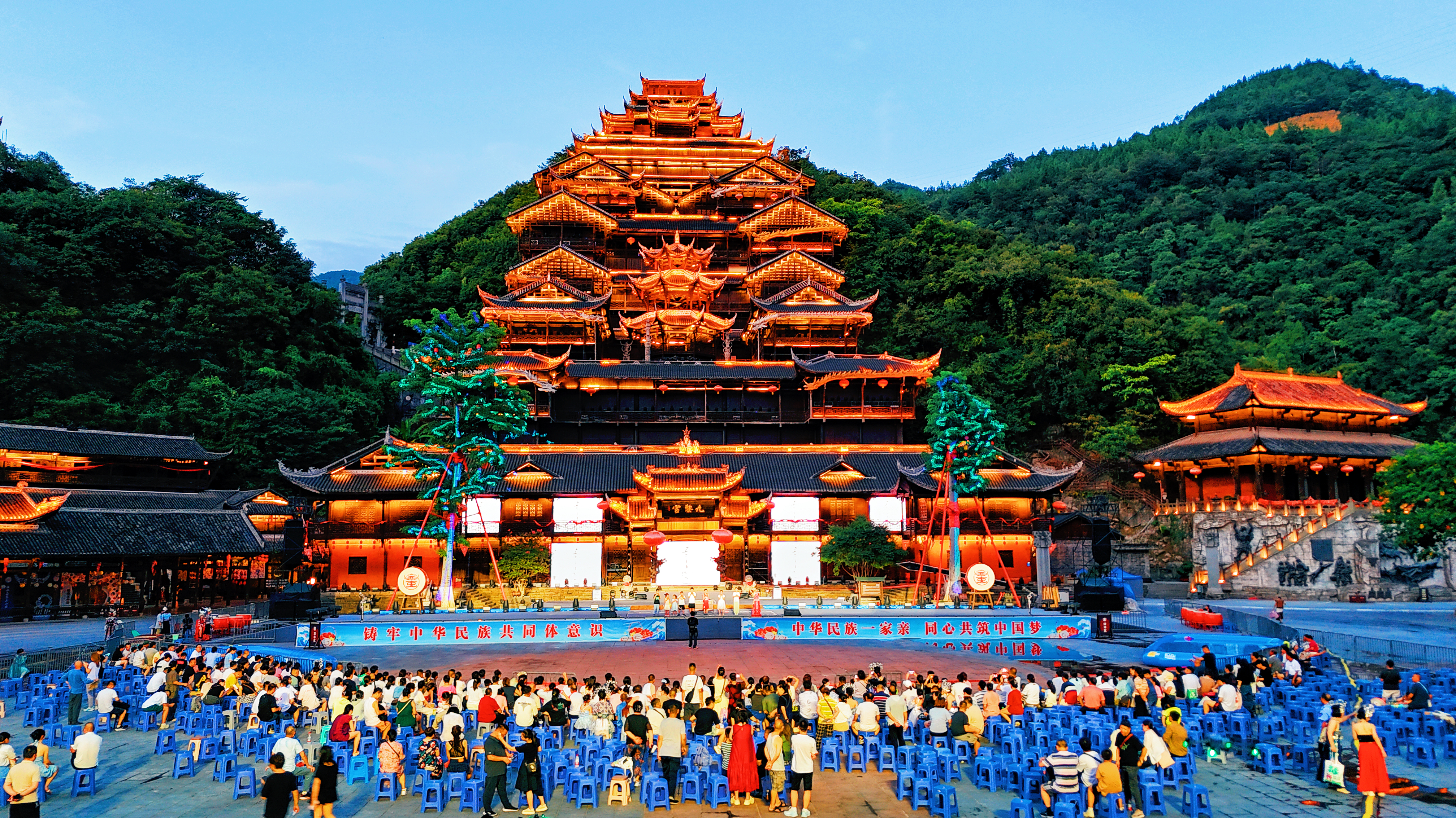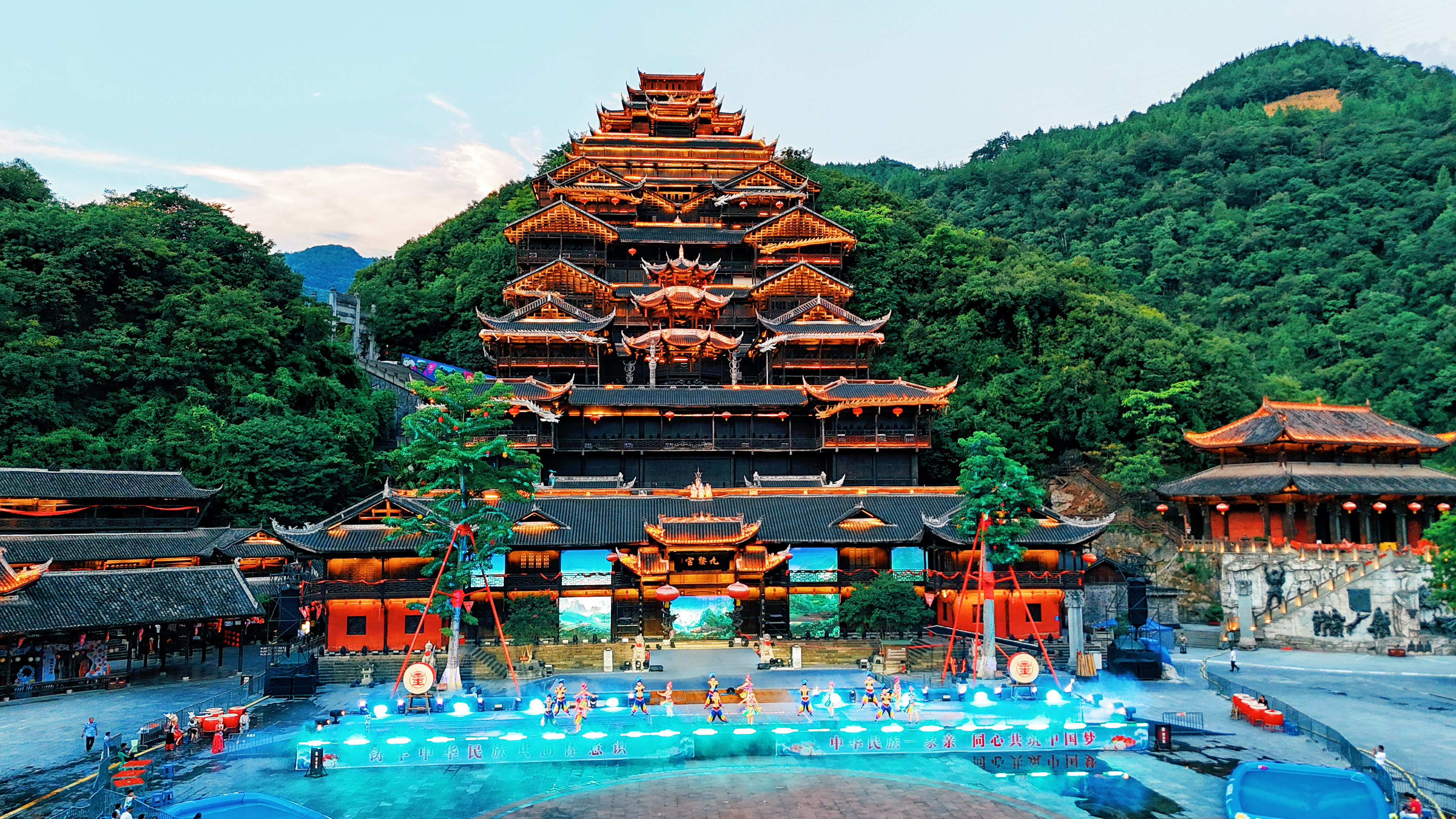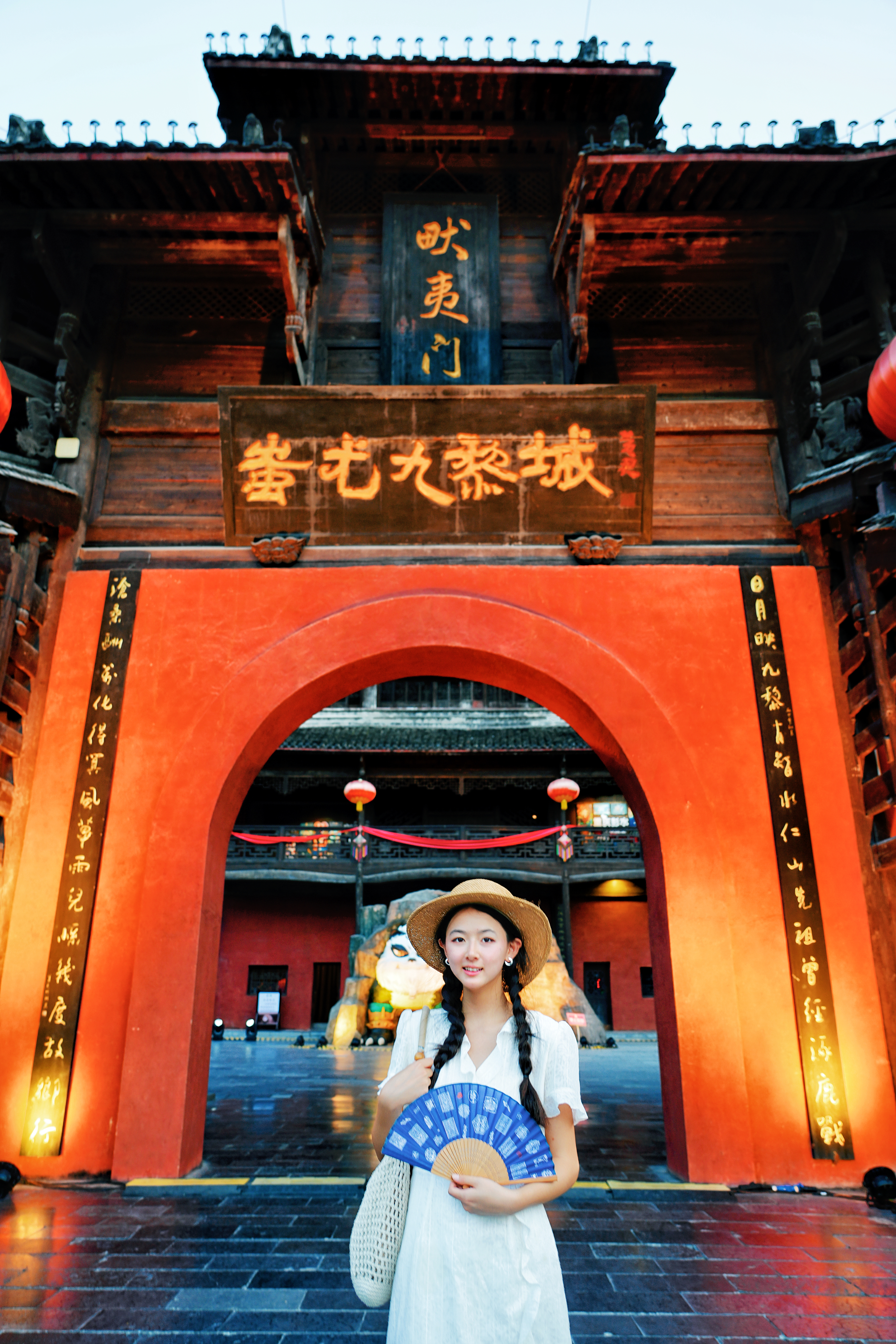 🏯蚩尤九黎城 | 苗岭深处崛起的三苗圣殿,唤醒华夏血脉的远古回响🔥 九道山门层层递进,青铜蚩尤像高24米擎天而立,牛角图腾刺破云霄,重现「九黎之君」的战神气魄。 漫步青石长街,吊脚楼群飞檐翘角,银饰叮当里藏着苗家绣娘的千年针法。 登九黎宫望层层叠叠的苗居,每道雕花窗棂都镌刻着《苗族古歌》的密码。 夜幕降临时,篝火点燃长桌宴,米酒香混着芦笙曲直冲云霄,看百名舞者演绎「苗祖蚩尤」祭祀大典,火光中恍见三苗部族穿越五千年的英勇与浪漫。
