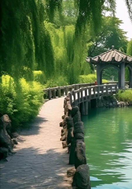 酒泉子•堤岸柳荫 文/缪文中 堤岸柳荫。 湖面碧荷成画。 引池鱼,亲暑夏。 开胸襟。 绿枝倾耳听风语。 马蝉吟百句。 径通幽,桥打趣。 胜千寻。 浅析: 这阕《酒泉子·堤岸柳荫》以夏日湖畔景致为描绘对象,通过精巧的空间布局与通感修辞,构建出一个充满生趣的清凉世界。全词呈现出"以动写静"的艺术特色,在短小篇幅中完成多重意境的叠加。以下从三个维度进行解析: 一、空间建构的透视法则 1. 垂直分层: 上层:柳荫(视觉遮蔽)→马蝉(听觉引导) 中层:碧荷(视觉焦点)→池鱼(动态点缀) 底层:幽径(空间延伸)→拱桥(人文点缀) 2. 感官通联: "绿枝倾耳"将植物听觉化(拟人)。 "桥打趣"使建筑人格化。 "马蝉吟百句"将虫鸣文学化。 这种空间处理类似王维"分行接绮树,倒影入清漪"的多维构图,但更强调生物间的互动关系。 二、意象群的生态关联 1. 植物系:柳荫(遮阳)-碧荷(净化)-绿枝(传声)构成完整的生态链。 2. 动物系:池鱼(水下)-马蝉(树上)形成垂直生态位。 3. 人造物:幽径(引导视线)-拱桥(打破平面)作为人文介入点, 特别值得注意的是"开胸襟"的突然转折:前文皆客观描写,至此突然插入主观感受,类似李清照"水光山色与人亲"的抒情方式,但更显豁达。 三、词牌特性的活用创新 《酒泉子》正体双调四十字,此作精准把握了该词牌的节奏特性: 上片三字句"引池鱼,亲暑夏"的短促节奏模拟鱼跃动态。 下片"径通幽,桥打趣"的排比句式形成空间蒙太奇。 结句"胜千寻"化用李白"桃花潭水深千尺"的夸张手法,将具象景观升华为精神体验。 "马蝉吟百句"的表述尤为新颖,既写蝉鸣不休的自然现象,又暗含对文人吟咏传统的调侃,在咏物词中别开生面。 审美价值 此词在三个方面突破传统: 1. 生态意识的觉醒:不再将自然作为观赏对象,而是呈现为生命共同体。 2. 俚雅融合的尝试:"桥打趣"的口语化表达与"胜千寻"的典雅形成张力。 3. 瞬间感受的放大:将夏日午后的片刻清凉永恒化为艺术存在。 这种创作取向,既延续了欧阳修"柳外轻雷池上雨"的细腻观察,又融入了现代生态美学意识。结句"胜千寻"的开放式收束,留下无限想象空间,与姜夔"念桥边红药,年年知为谁生"的怅惘不同,展现的是对当下美好的全然沉浸,体现了当代词人对传统田园词风的拓展。