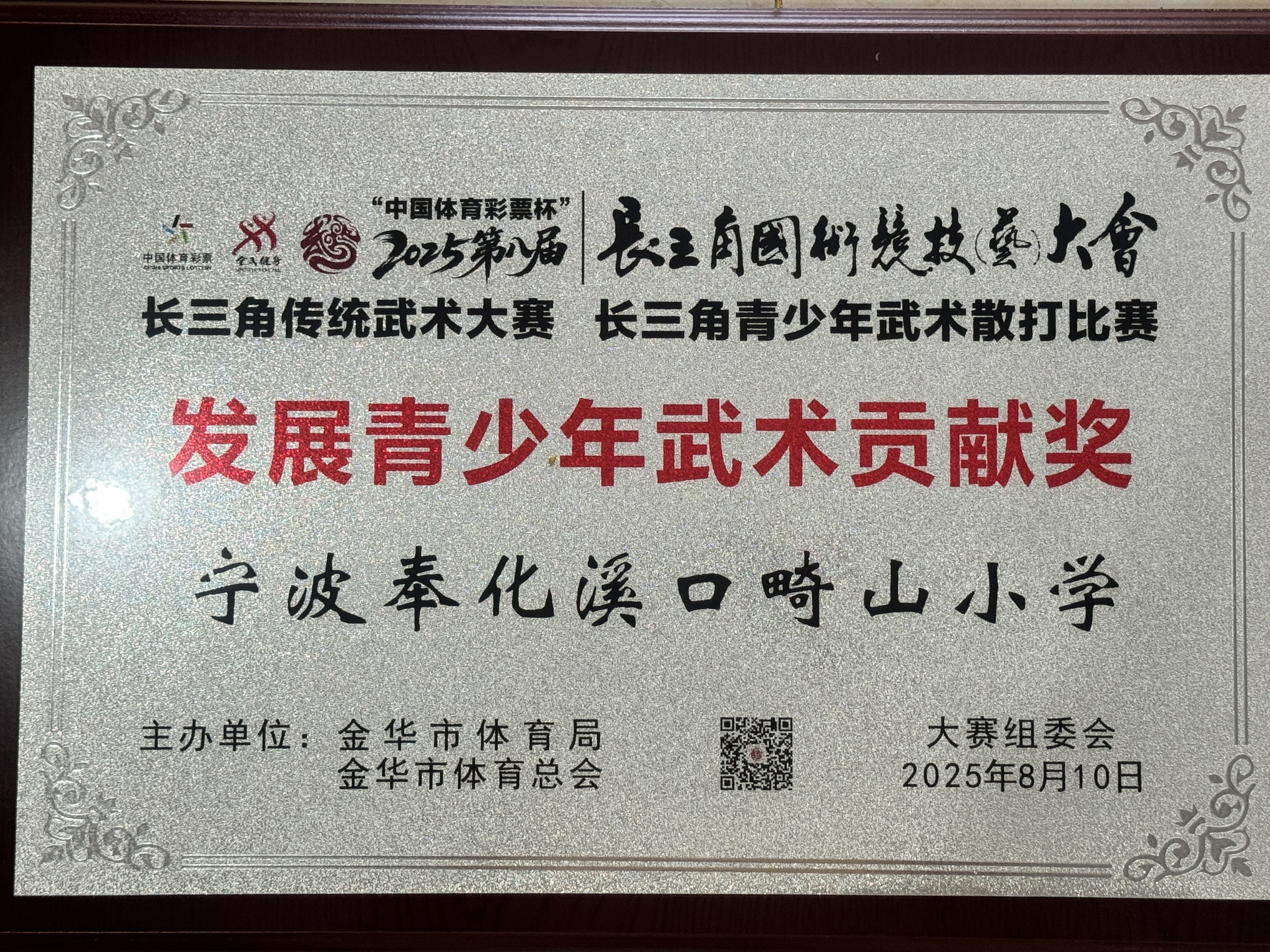 8月9至10日,第八届长三角传统武术大赛在浙江金华市体育中心体育馆圆满落幕。奉化区畸山小学武术队作为宁波市唯一参赛学校,凭借精湛技艺与顽强拼搏,斩获30金11银5铜的辉煌战绩,共揽获46枚奖牌、47张证书及2座奖杯,并荣获“发展武术运动贡献奖”,各项数据均创历史新高。
