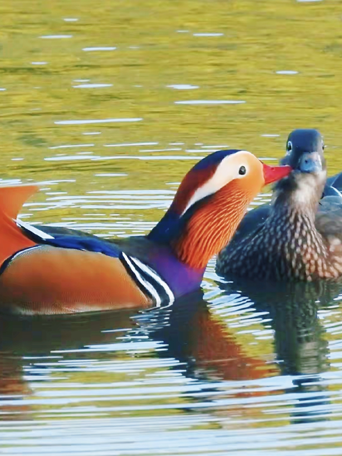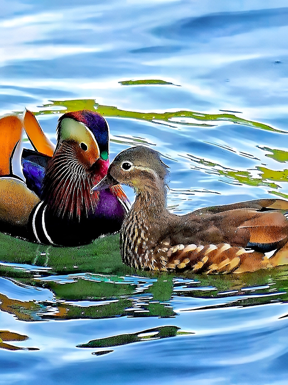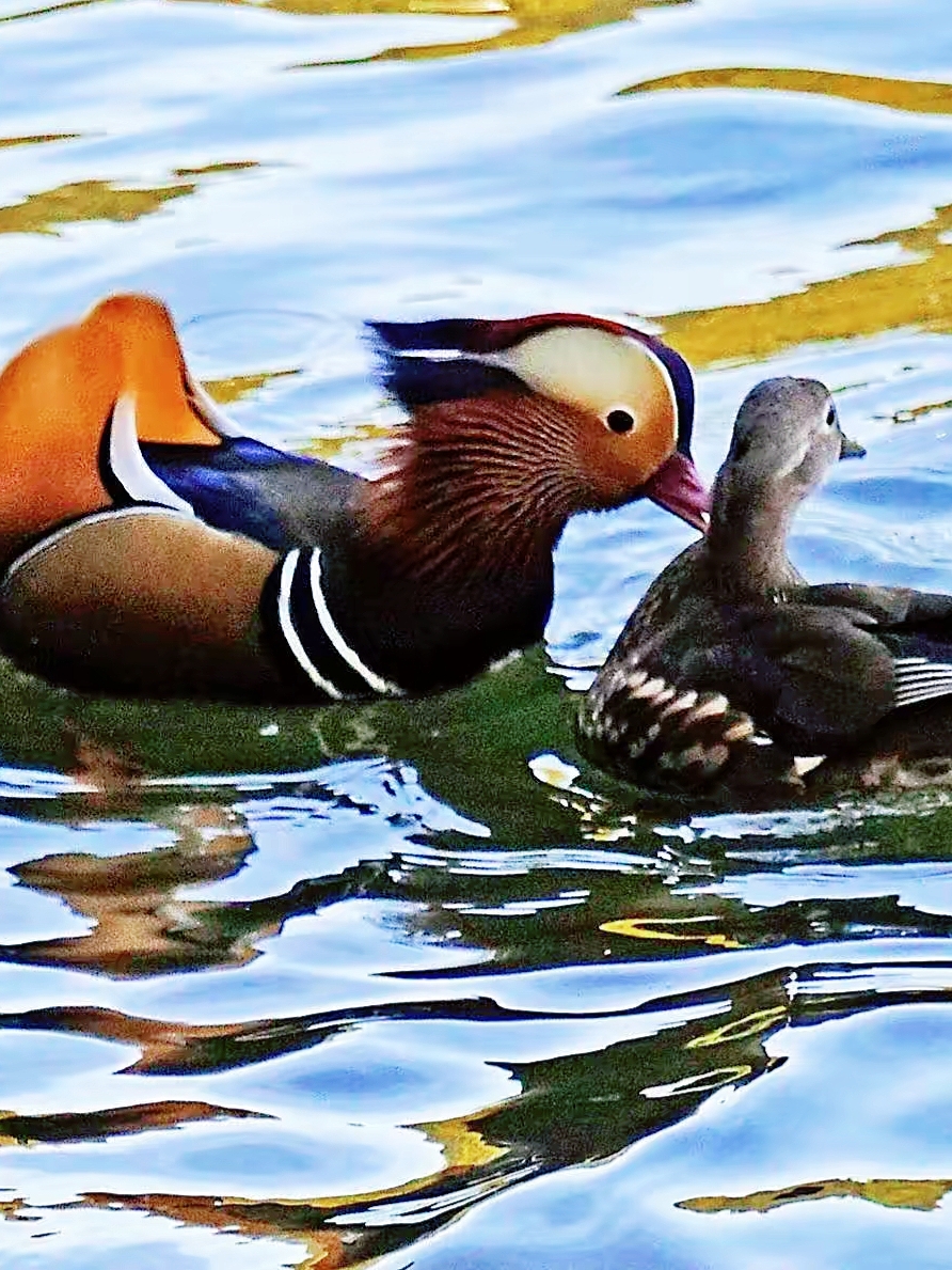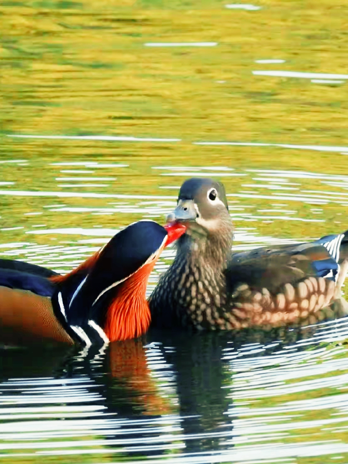 一对羽毛油亮的鸳鸯就游到了荷塘中央。雄鸟的羽毛像被晚霞染过,翠绿的头颈闪着金属光泽,它总爱把脑袋往雌鸟颈边蹭,用喙轻轻梳理着她灰褐色的羽毛。雌鸟也不躲闪,只是温顺地浮在水面,偶尔转头用脸颊蹭回去,好像在说“爱我你就亲亲我”,水波荡开一圈圈温柔的涟漪。七夕节快乐!