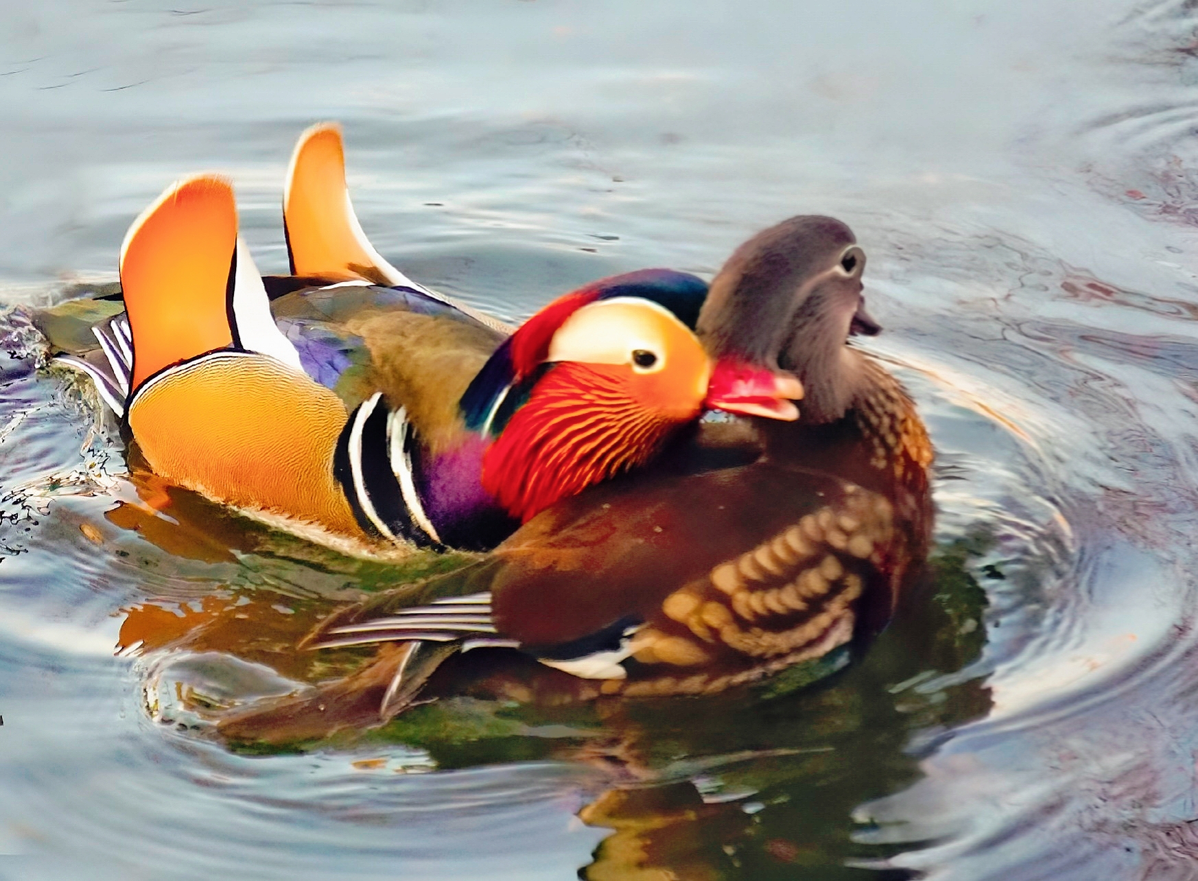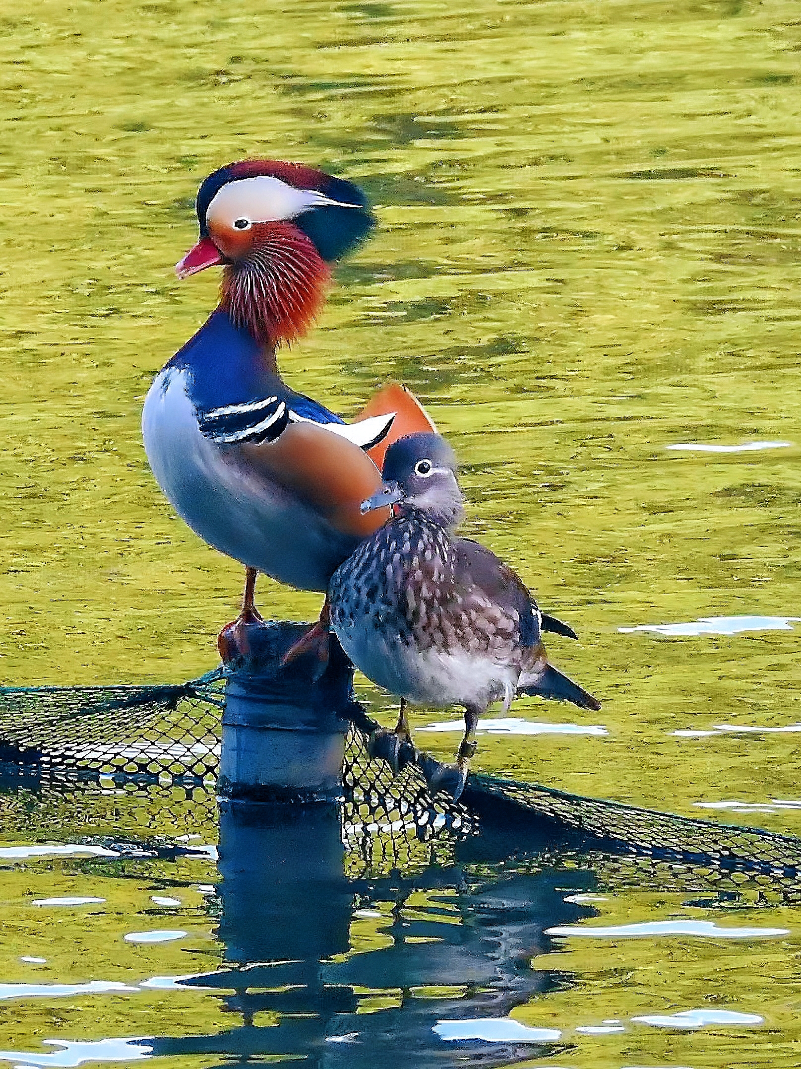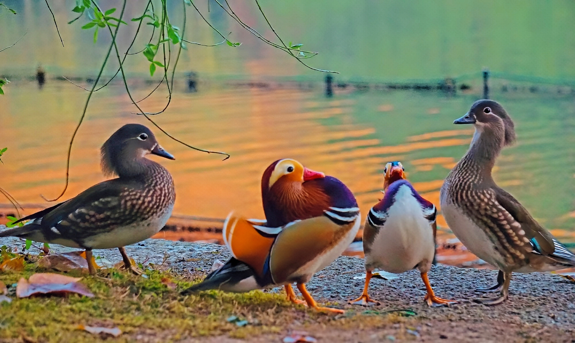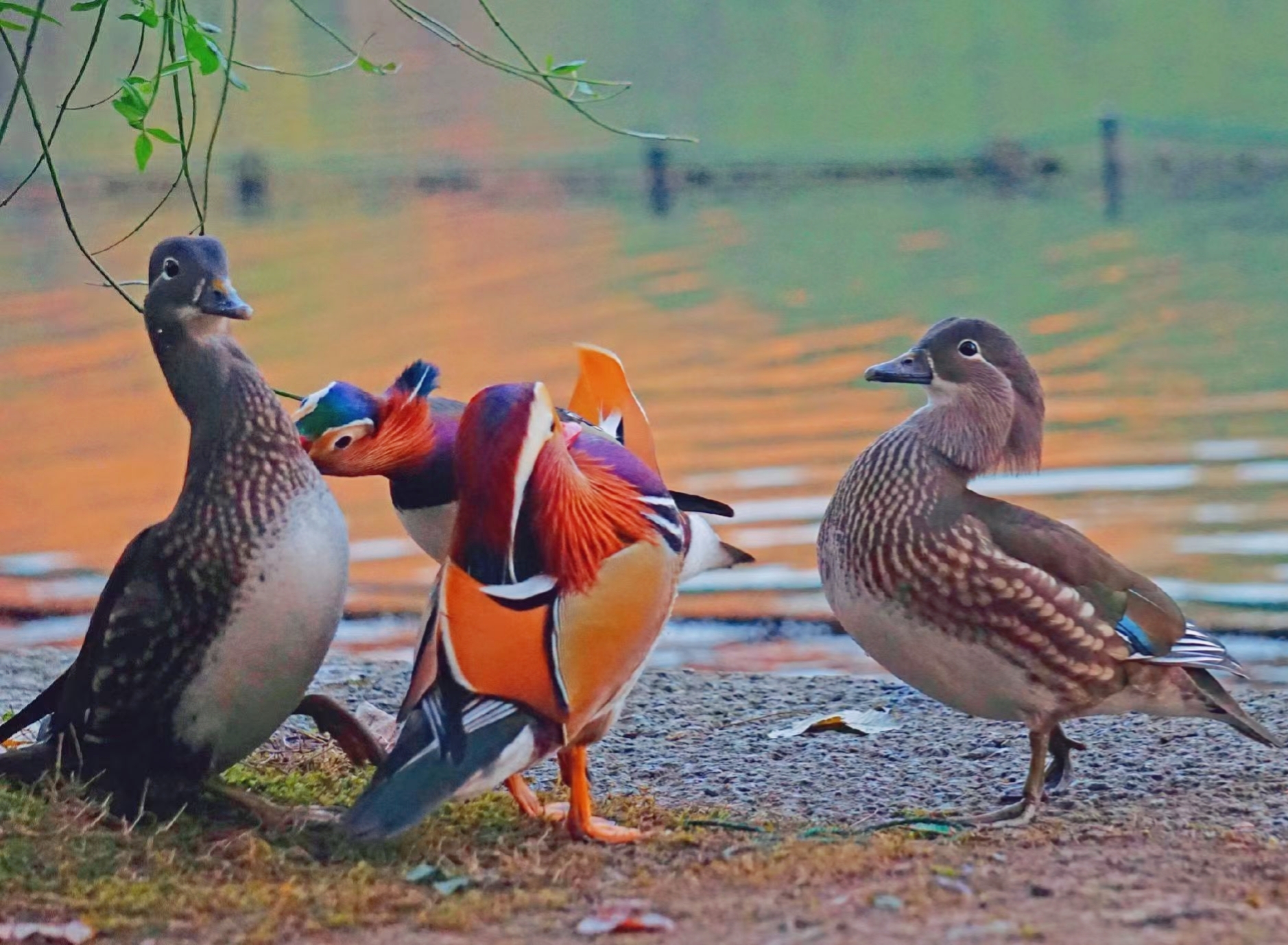 一对羽毛油亮的鸳鸯就游到了荷塘中央。雄鸟的羽毛像被晚霞染过,翠绿的头颈闪着金属光泽,它总爱把脑袋往雌鸟颈边蹭,用喙轻轻梳理着她灰褐色的羽毛。雌鸟也不躲闪,只是温顺地浮在水面,偶尔转头用脸颊蹭回去,好像在说“爱我你就亲亲我”,水波荡开一圈圈温柔的涟漪。七夕节快乐!