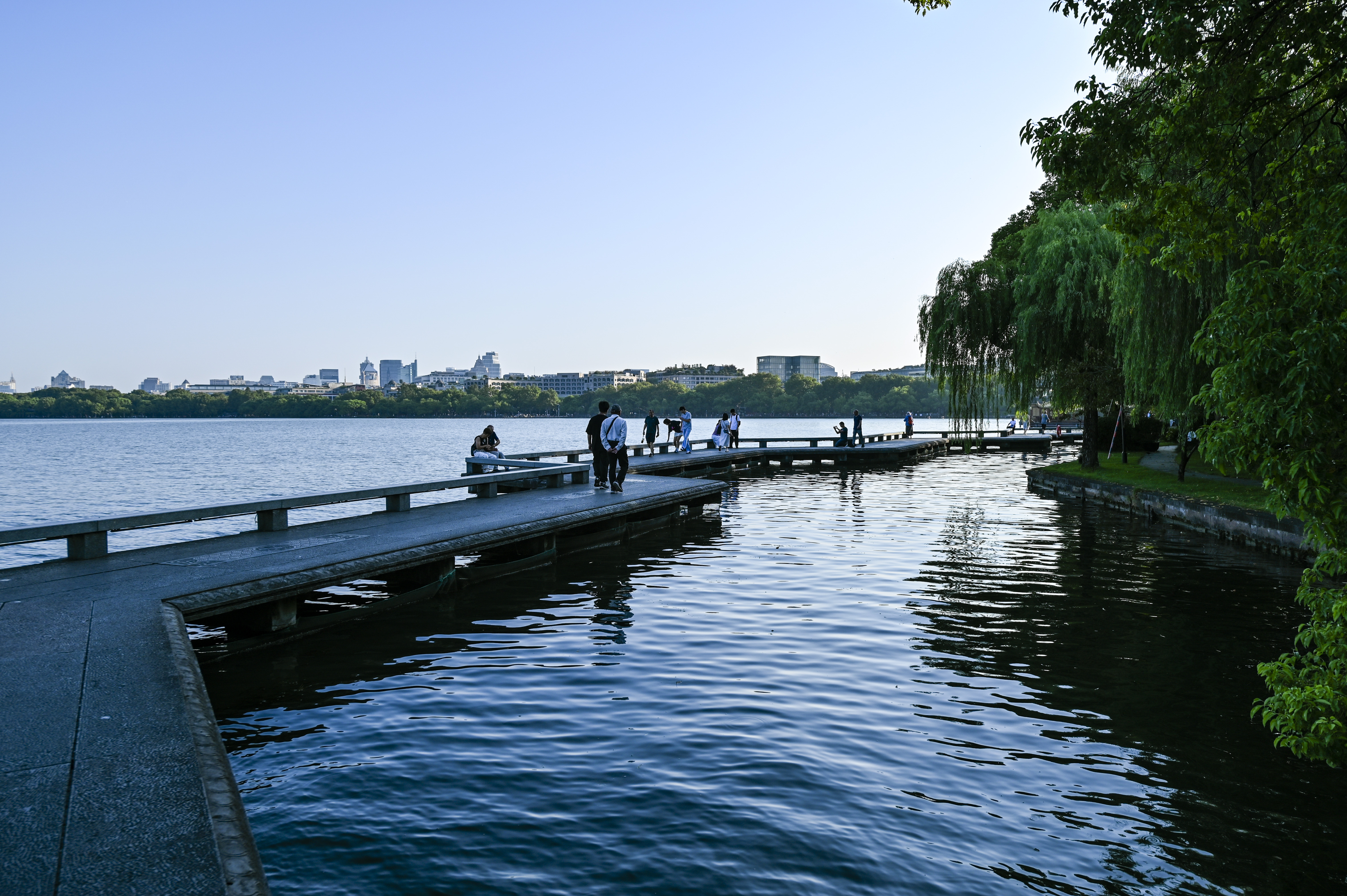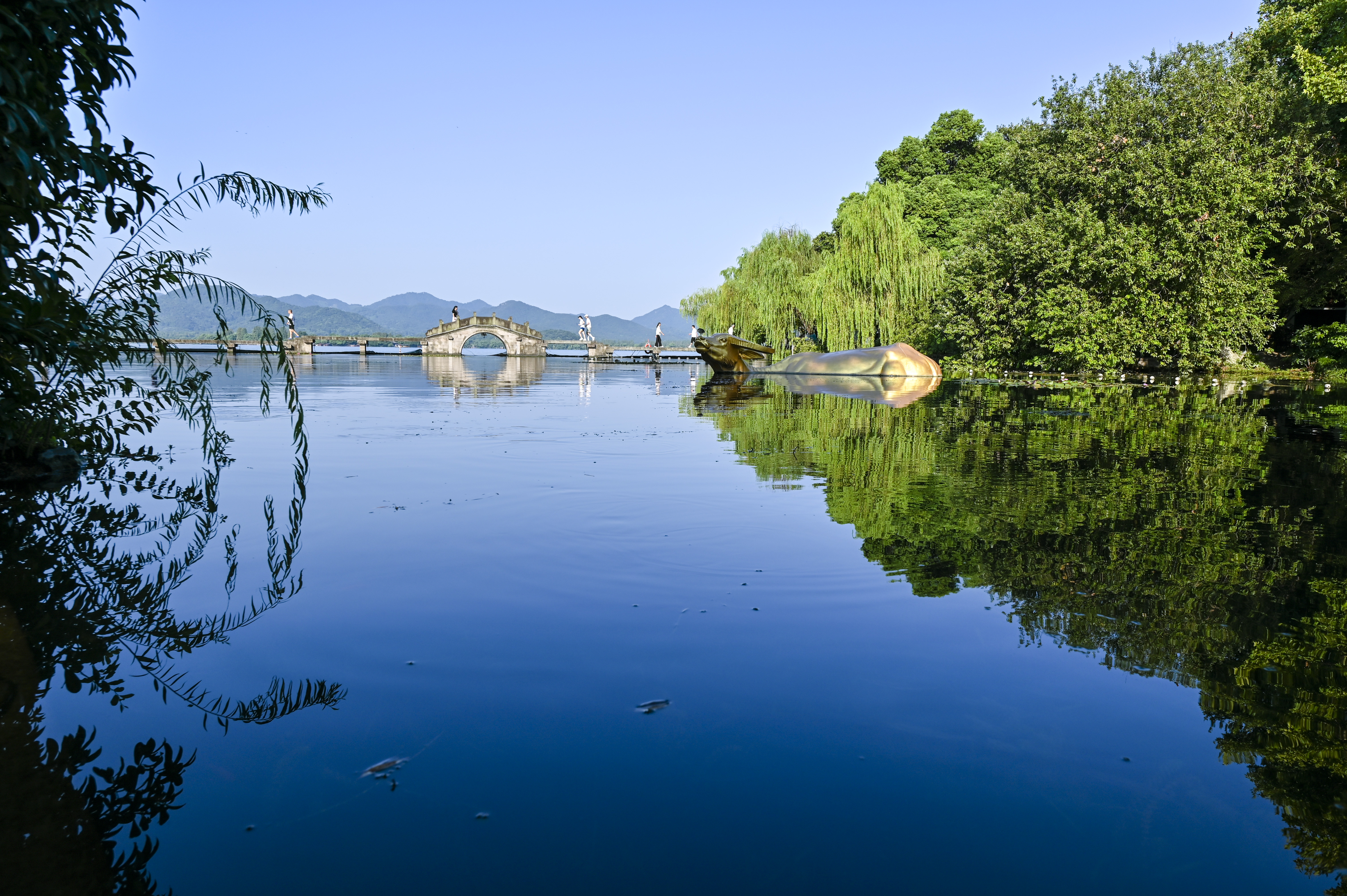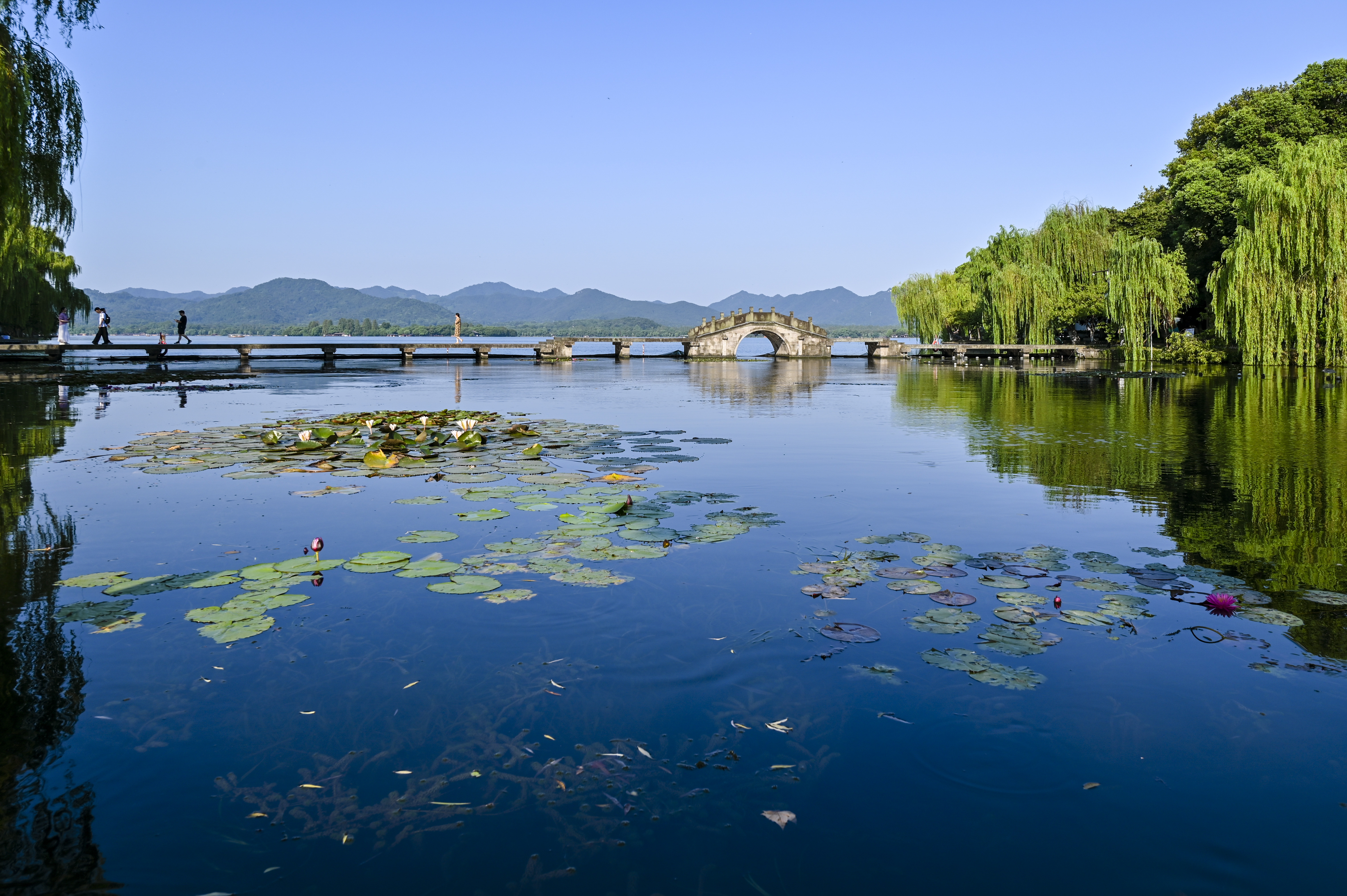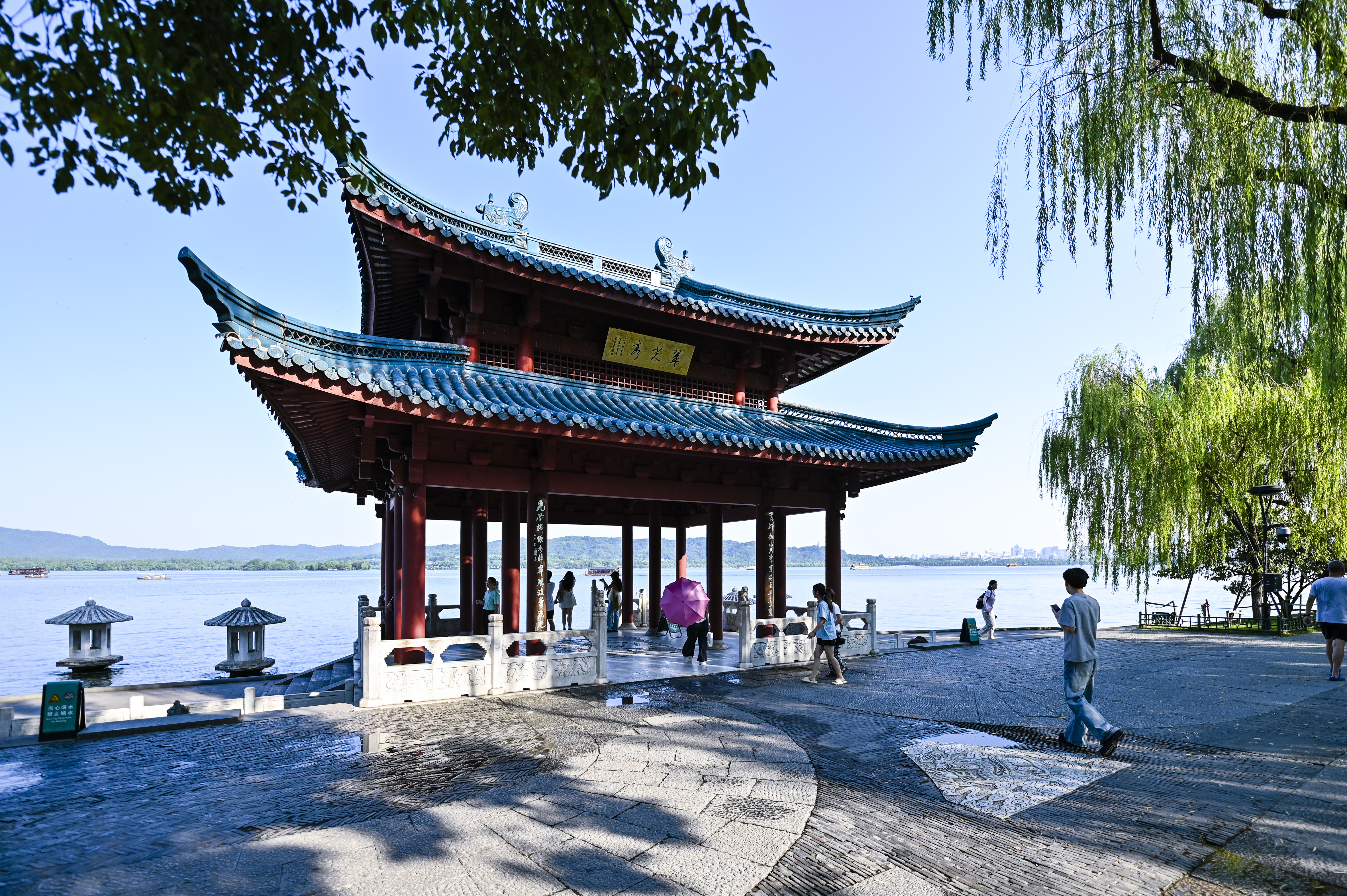 蓝天下的西湖景,水天一色,高温下的初秋光影。