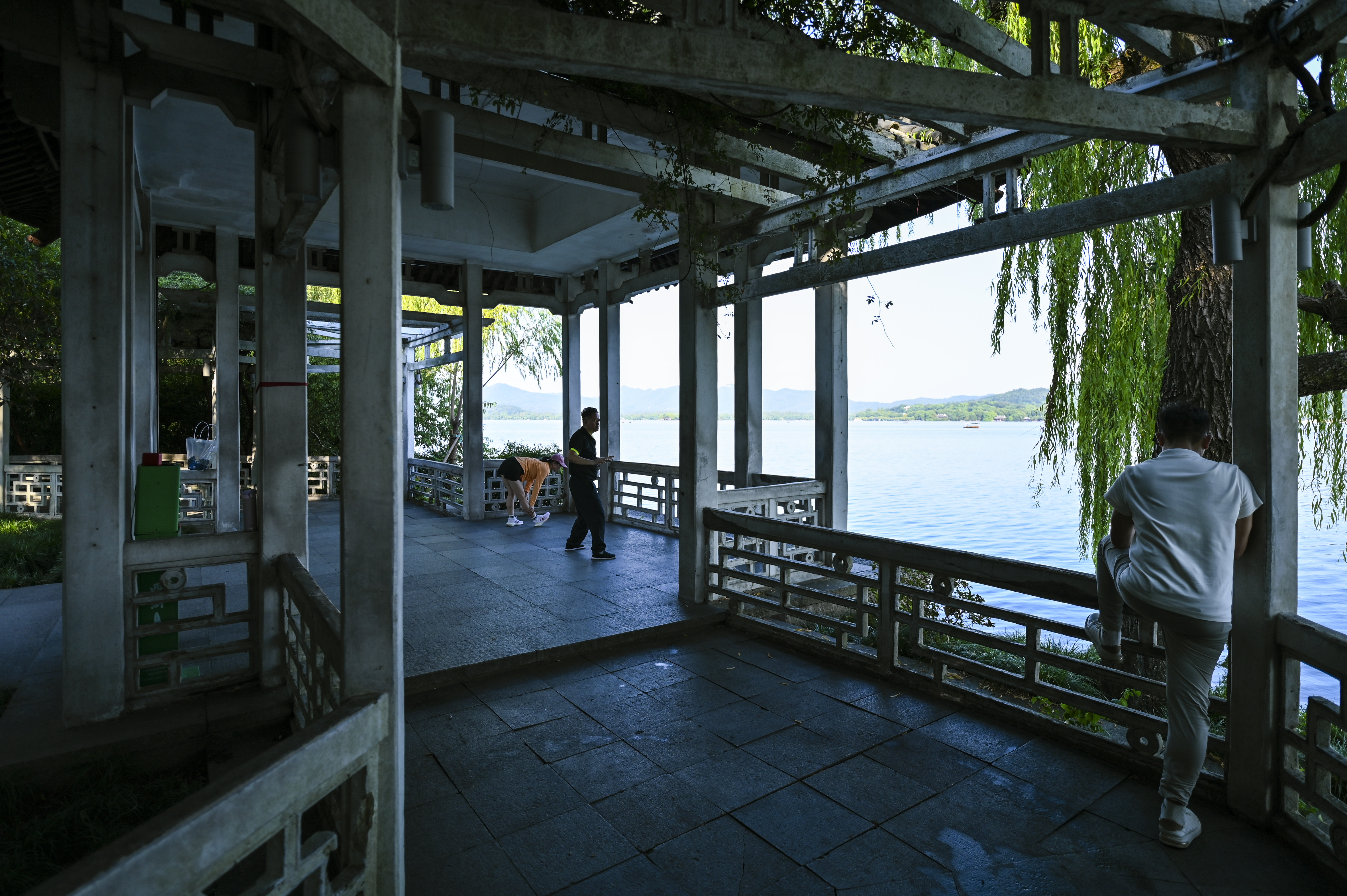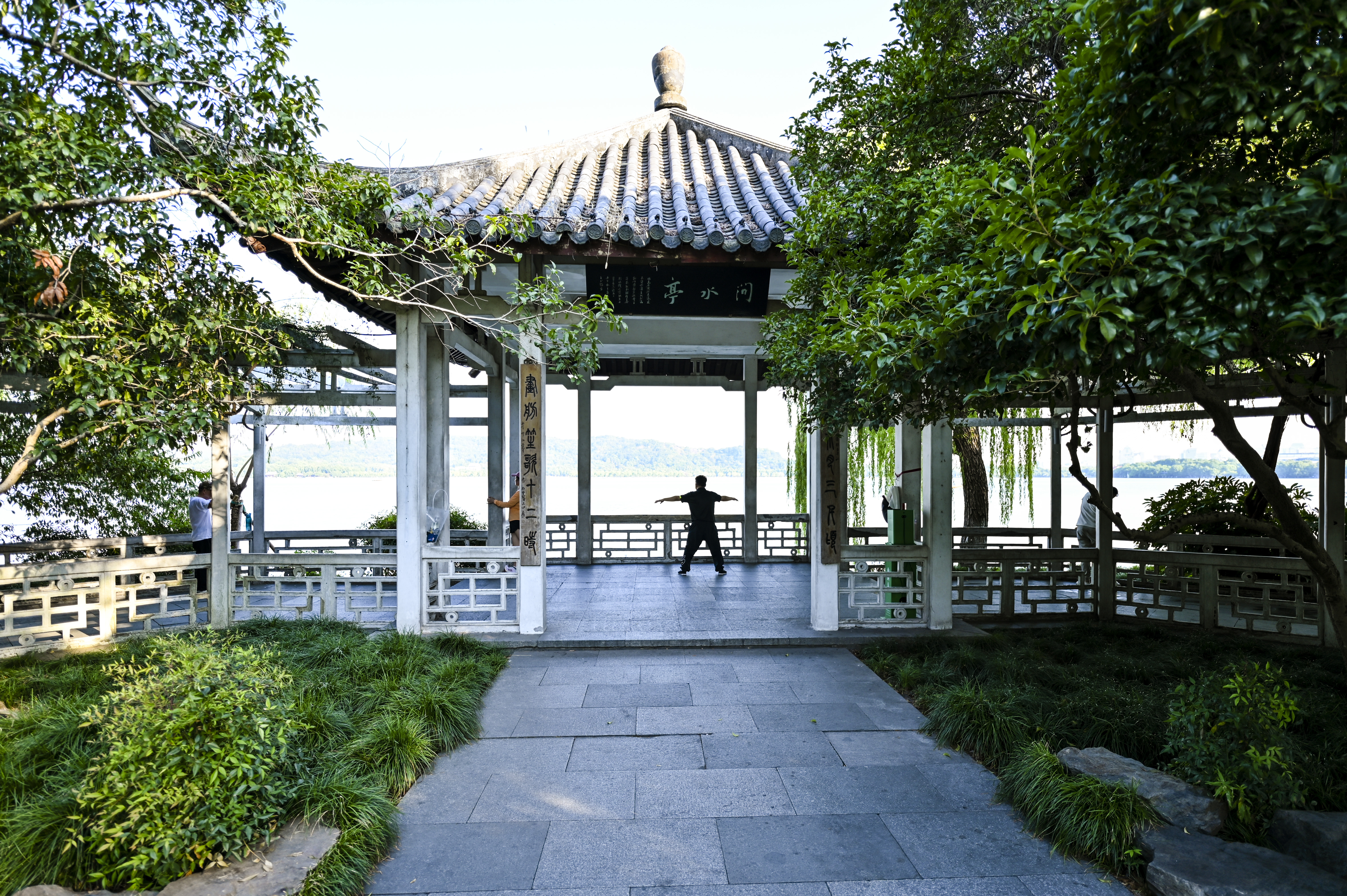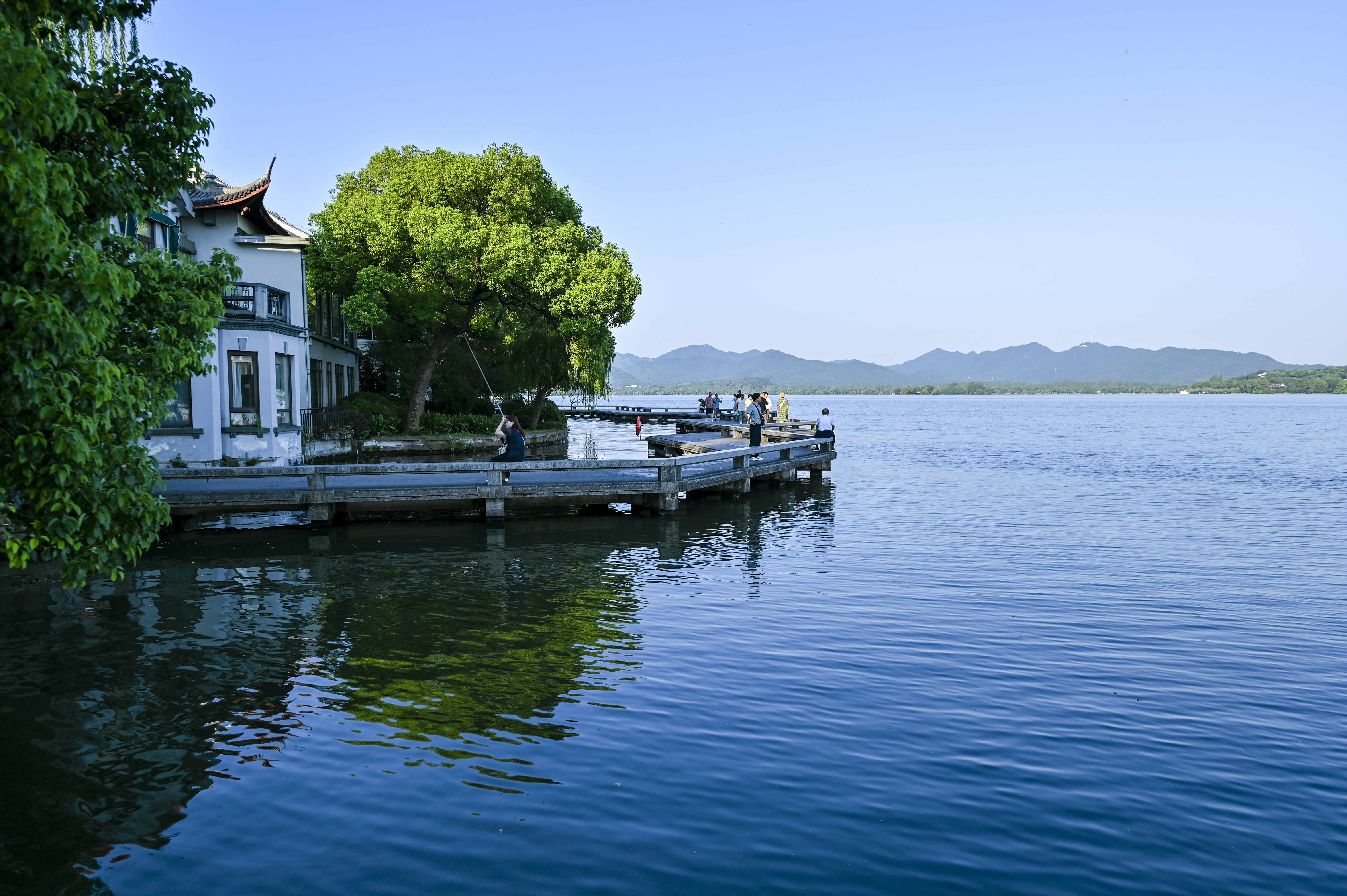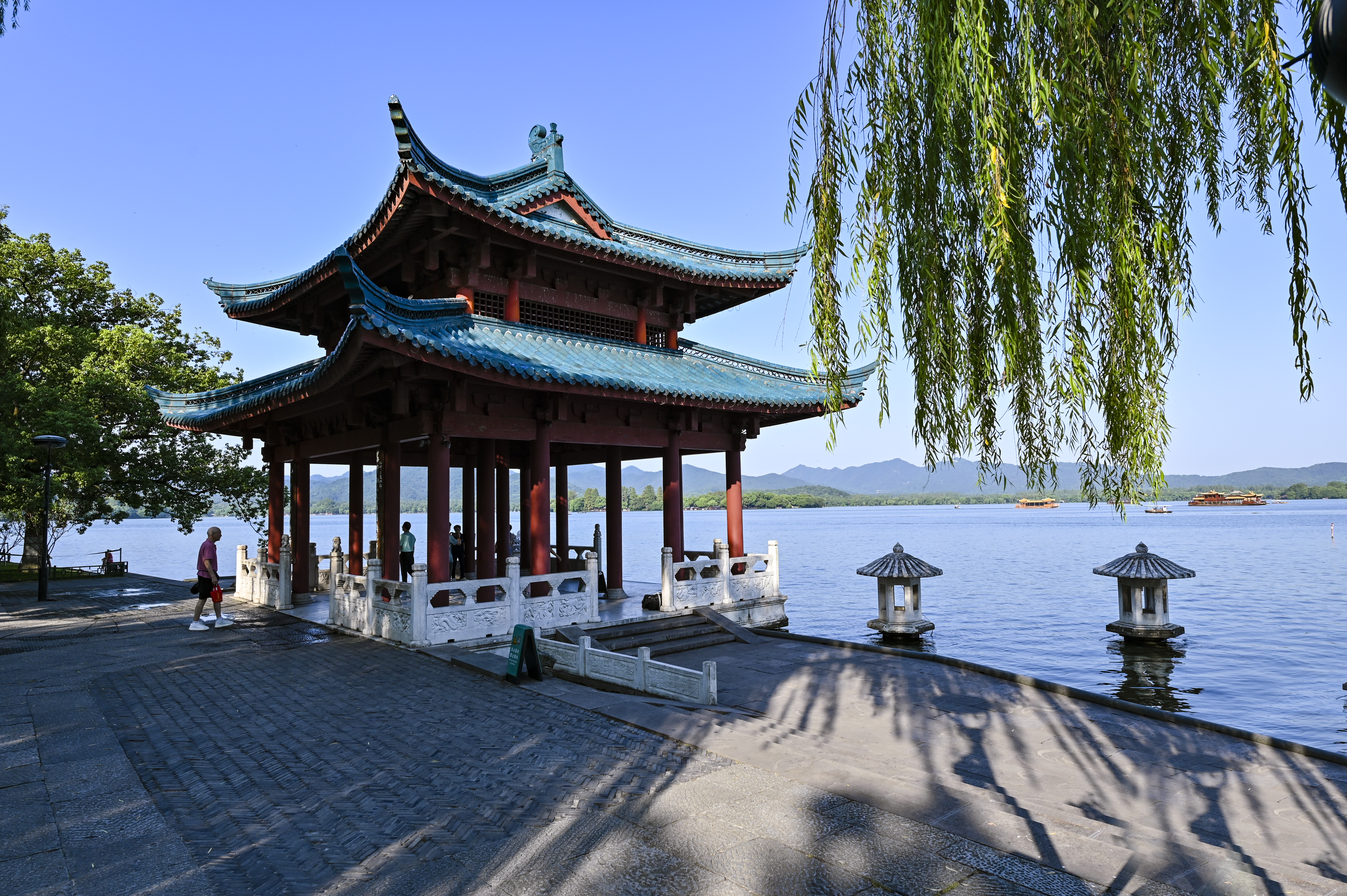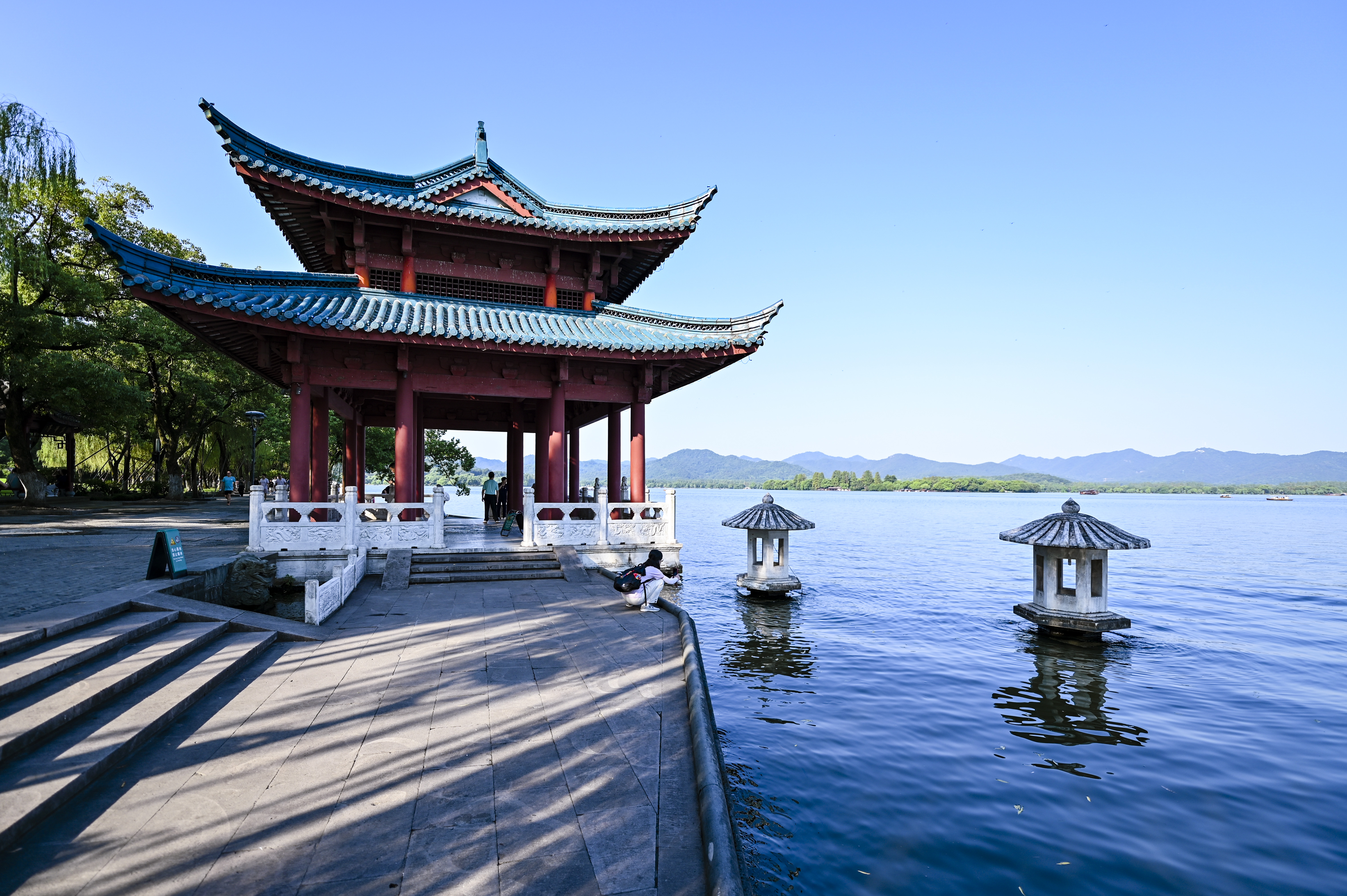 蓝天下的西湖景,水天一色,高温下的初秋光影。