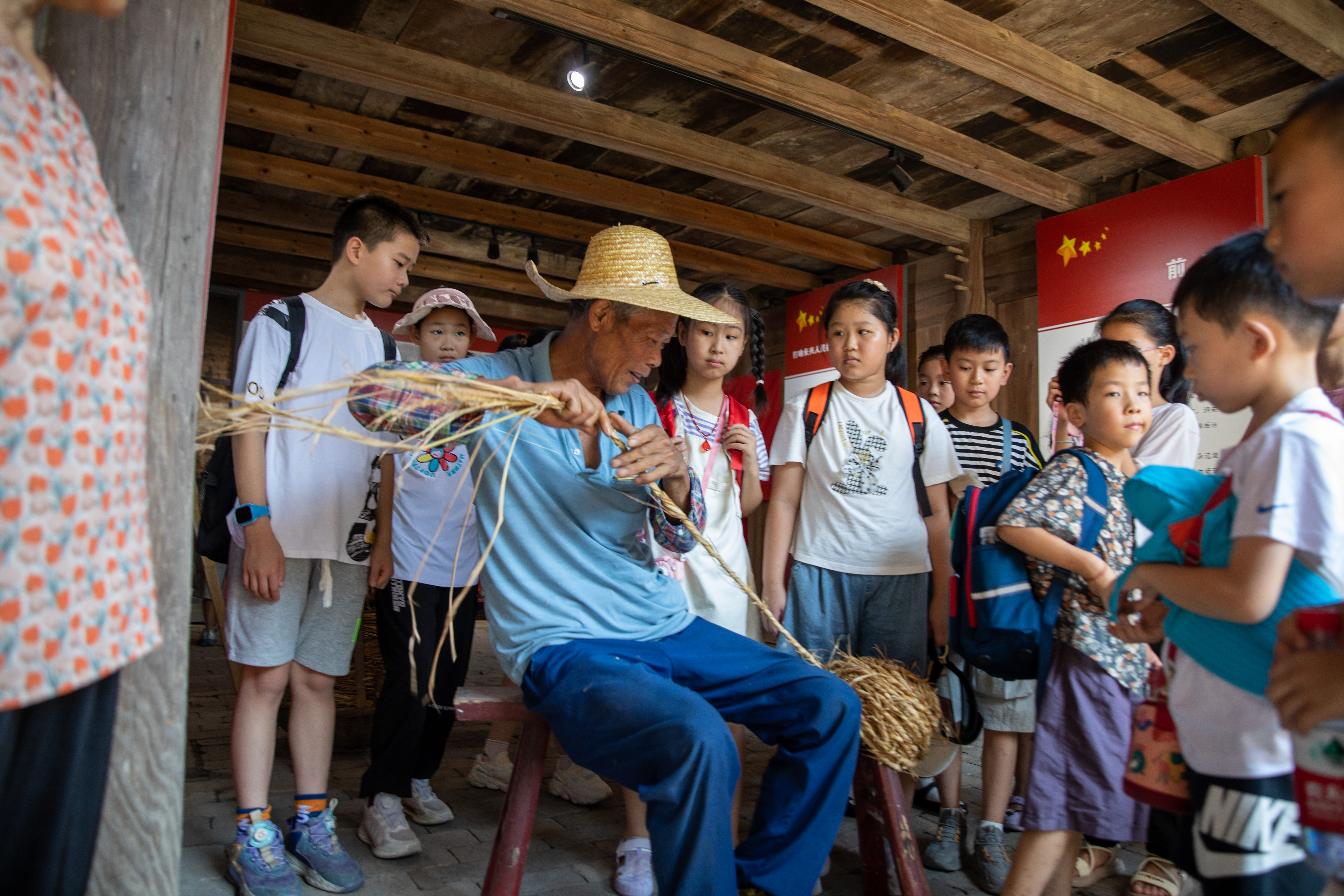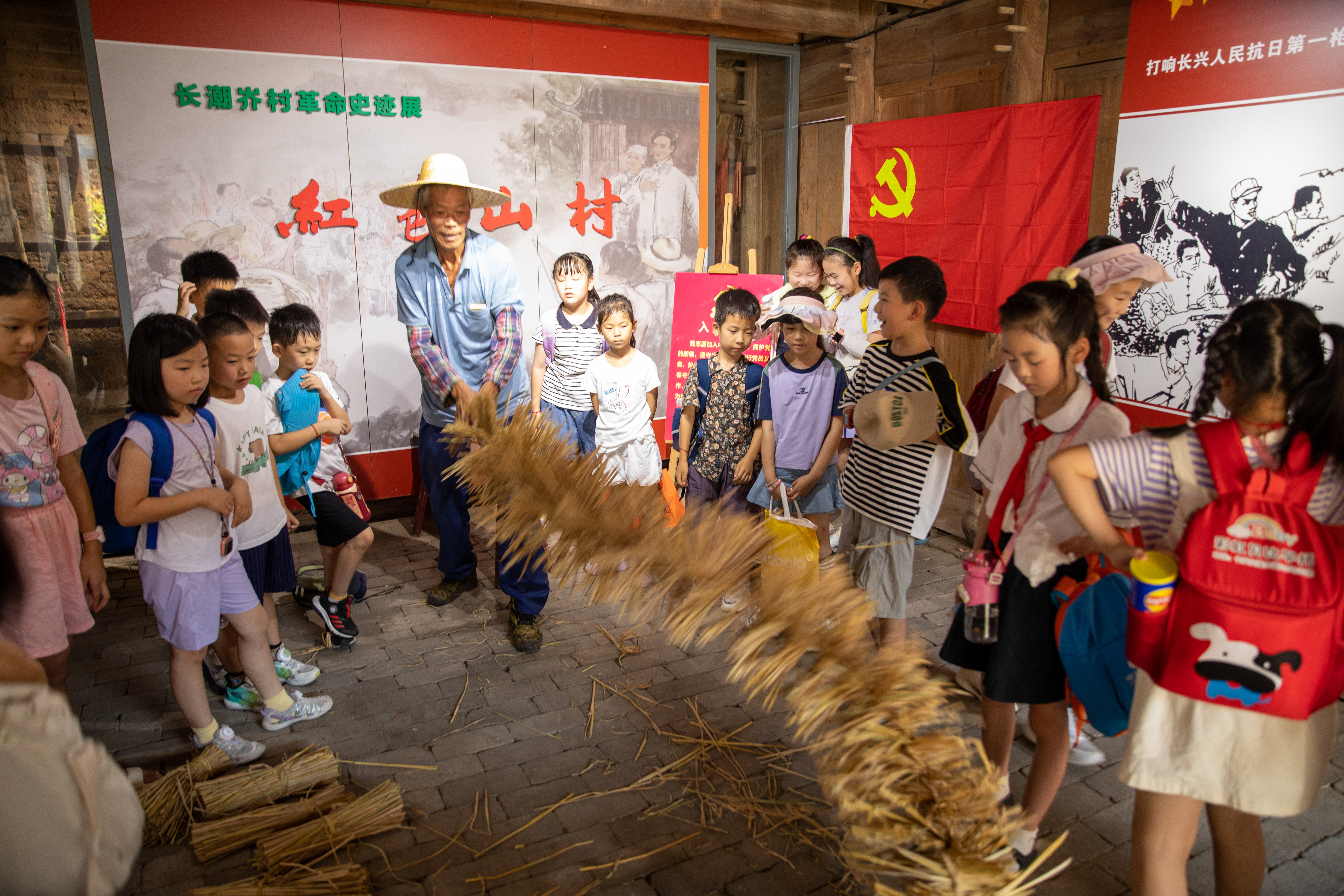 长兴县泗安镇长潮岕村红色研学活动: 学生们走进爱国主义教育基地,聆听革命故事、缅怀先烈。随后体验非遗编草龙,在老艺人指导下学扎骨架、编草绳,将红色记忆与传统技艺相融,收获深刻研学体验。