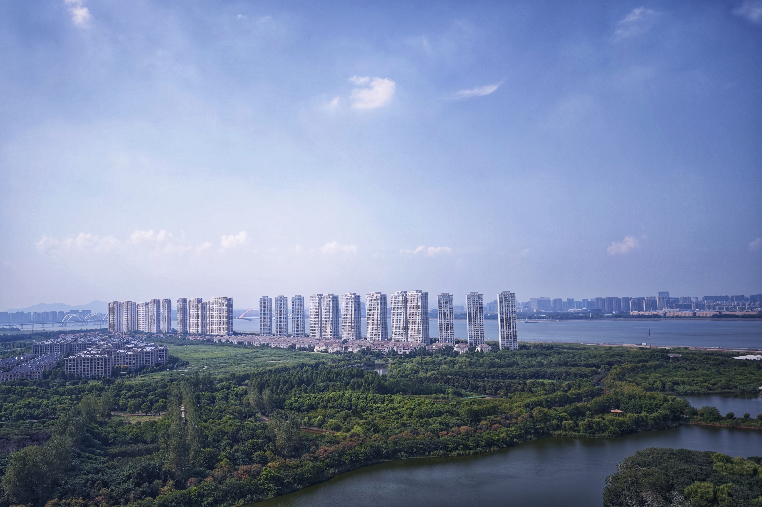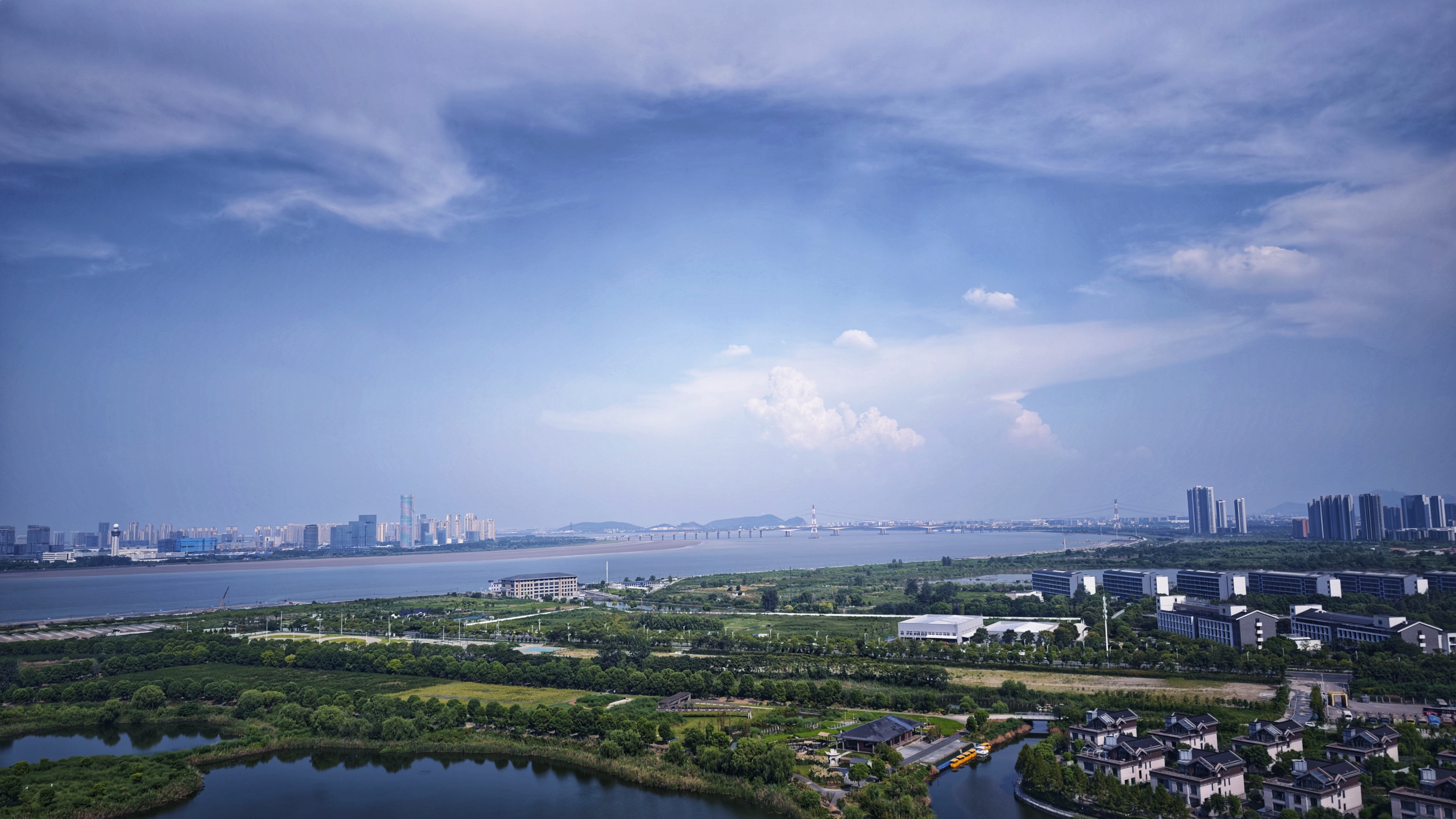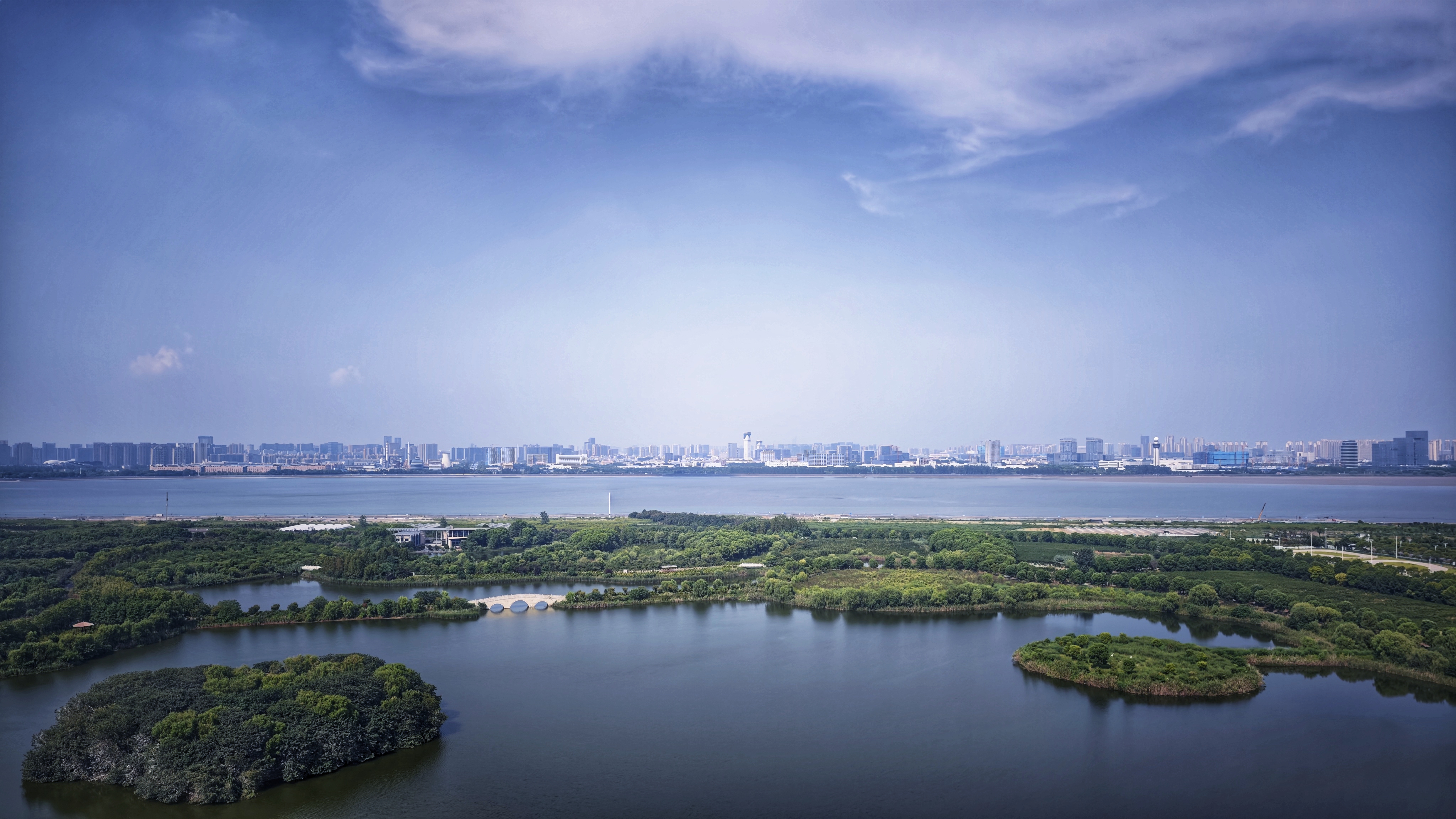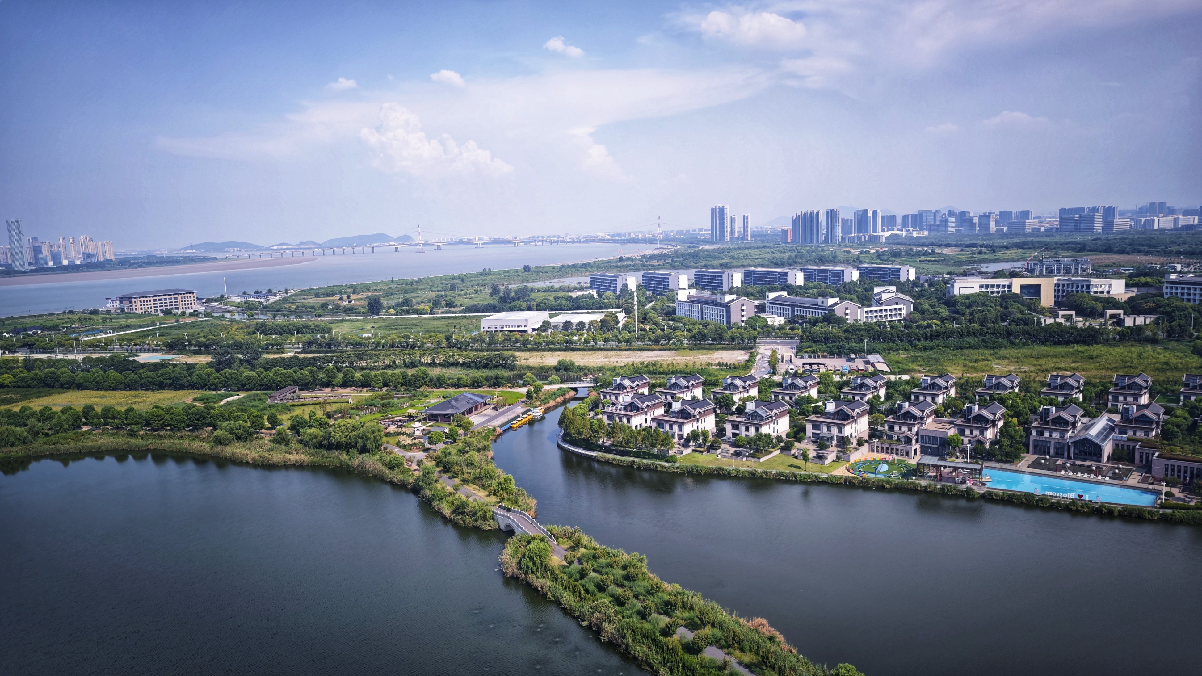 上帝视角看城市,河湖如镜,建筑与自然相融,远处桥梁横跨江面,勾勒出一幅现代与生态共生的画卷。